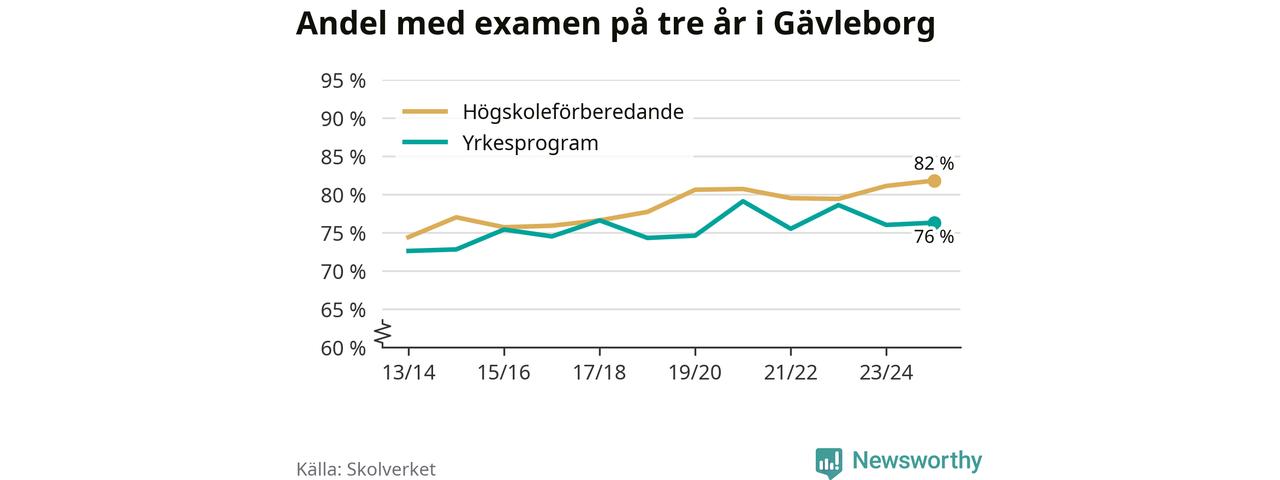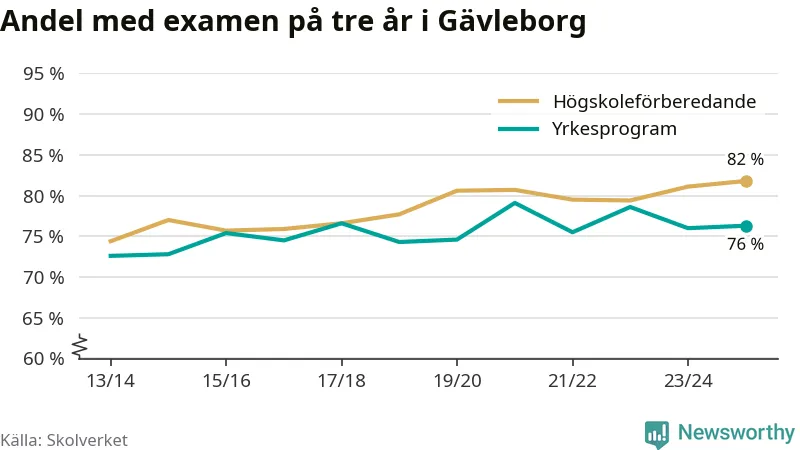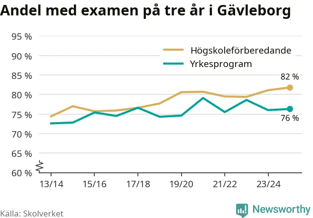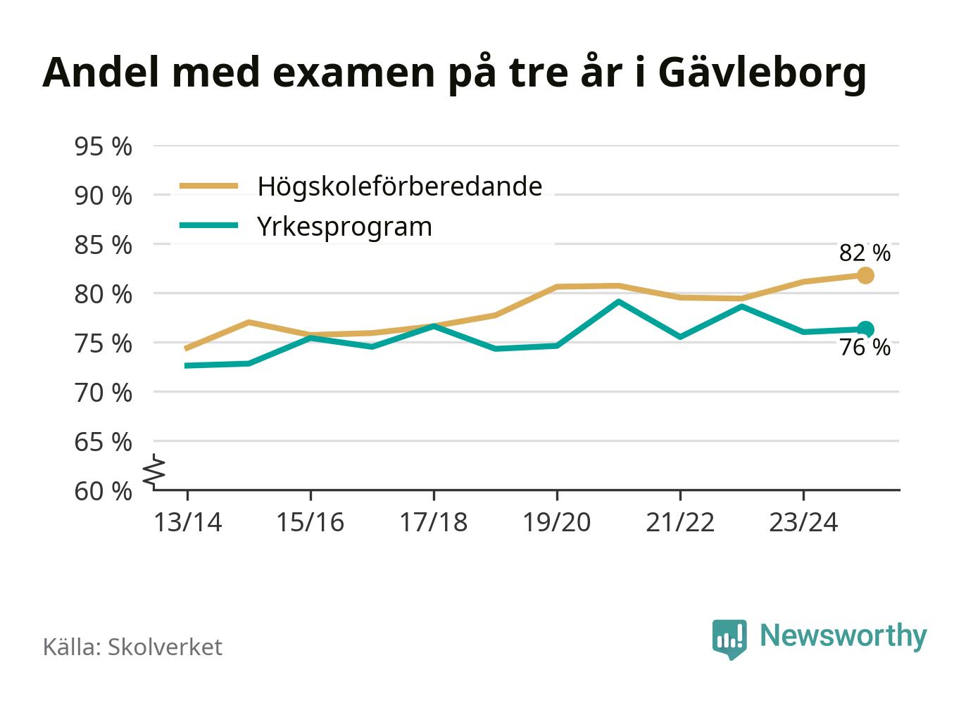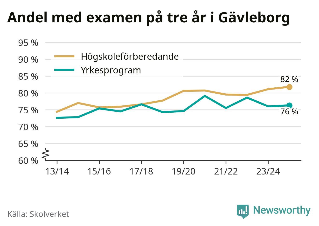 Bland deras kamrater på högskoleförberedande program hade 82 procent klarat examen på tre år – vilket är en procentenhet mer än året innan. Det är den högsta andelen sedan åtminstone läsåret 2013/14.