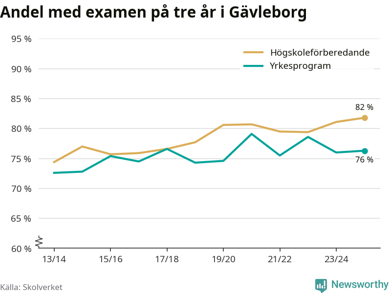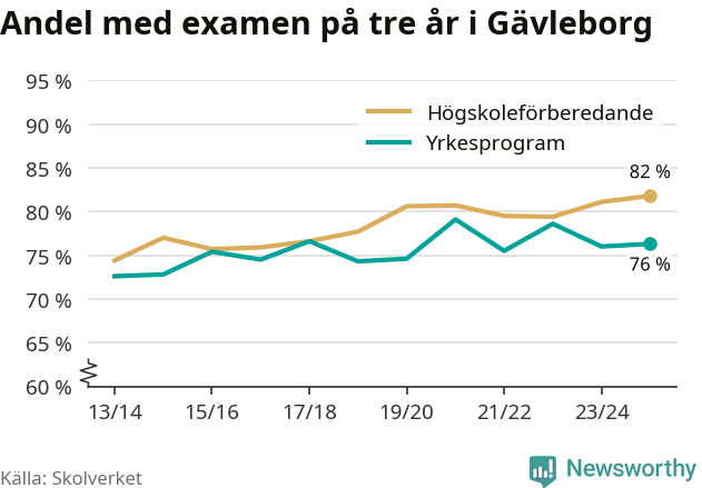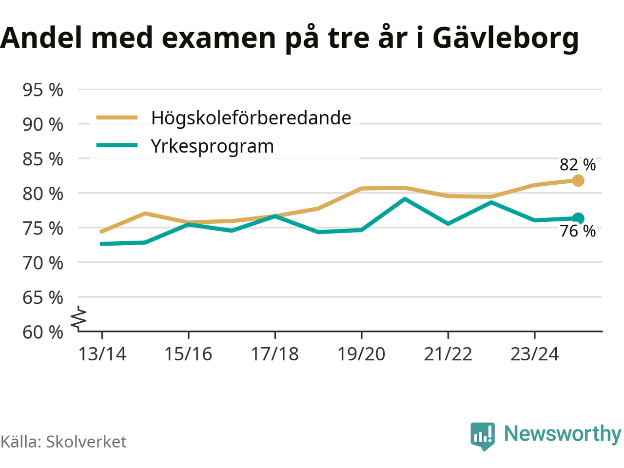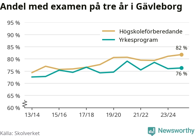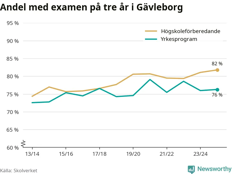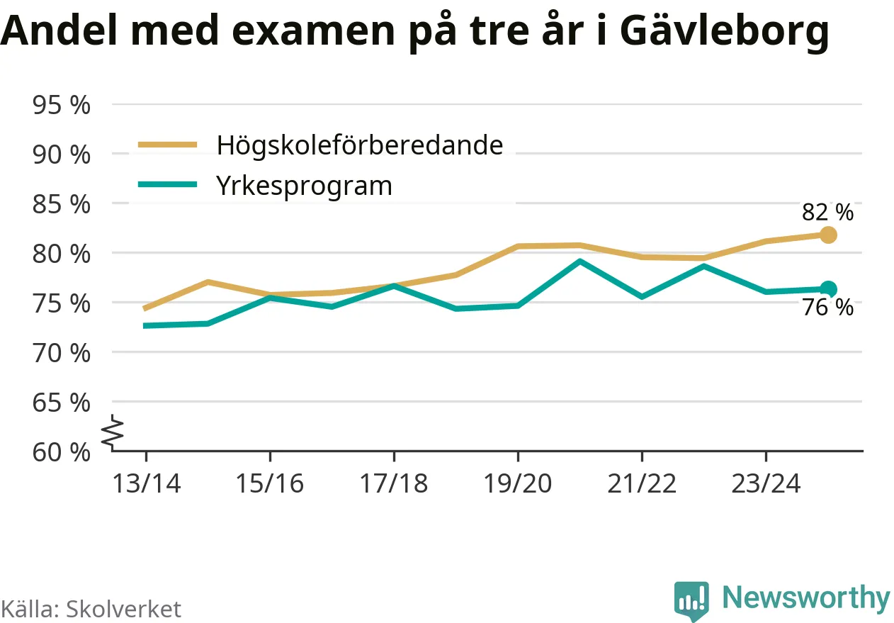 Bland deras kamrater på högskoleförberedande program hade 82 procent klarat examen på tre år – vilket är en procentenhet mer än året innan. Det är den högsta andelen sedan åtminstone läsåret 2013/14.