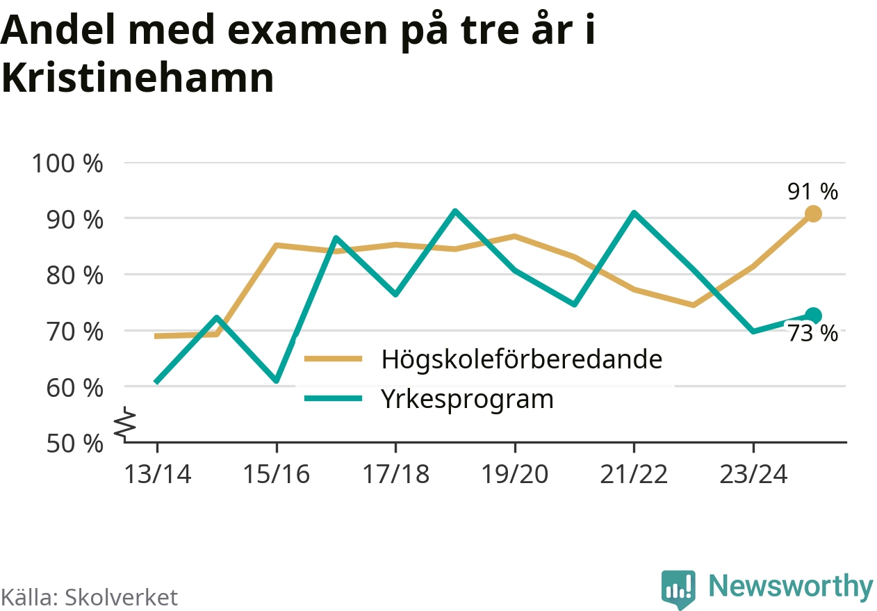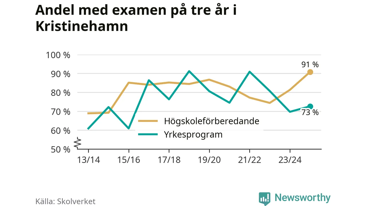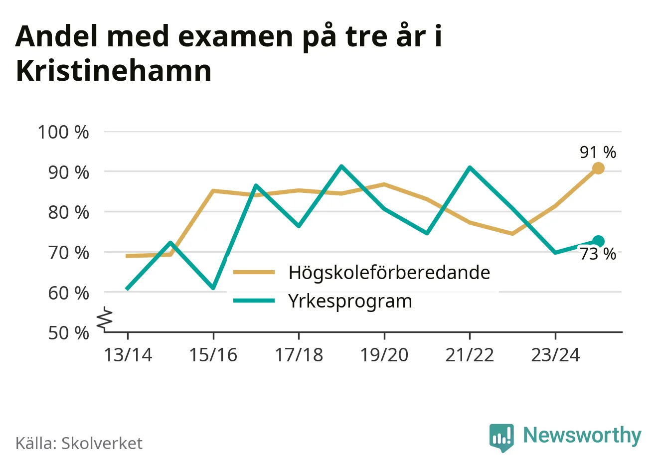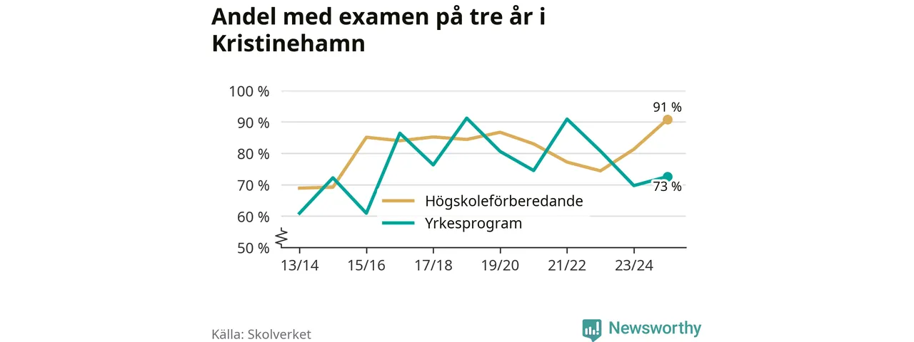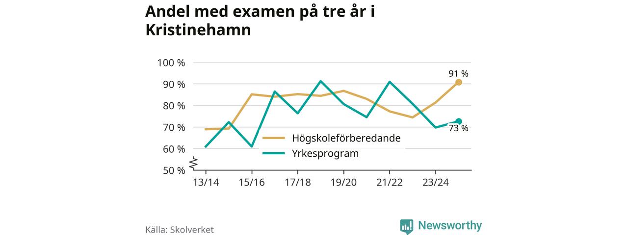 Inte sedan åtminstone läsåret 2013/14 har andelen elever som klarat gymnasieexamen på högskoleförberedande program varit högre i Kristinehamn. Det visar Skolverkets senaste statistik.
