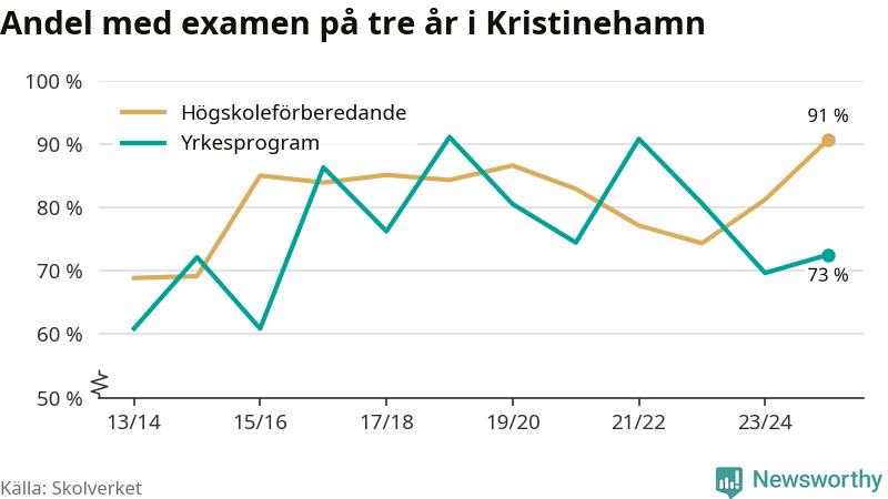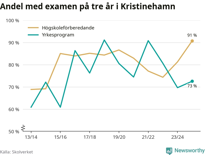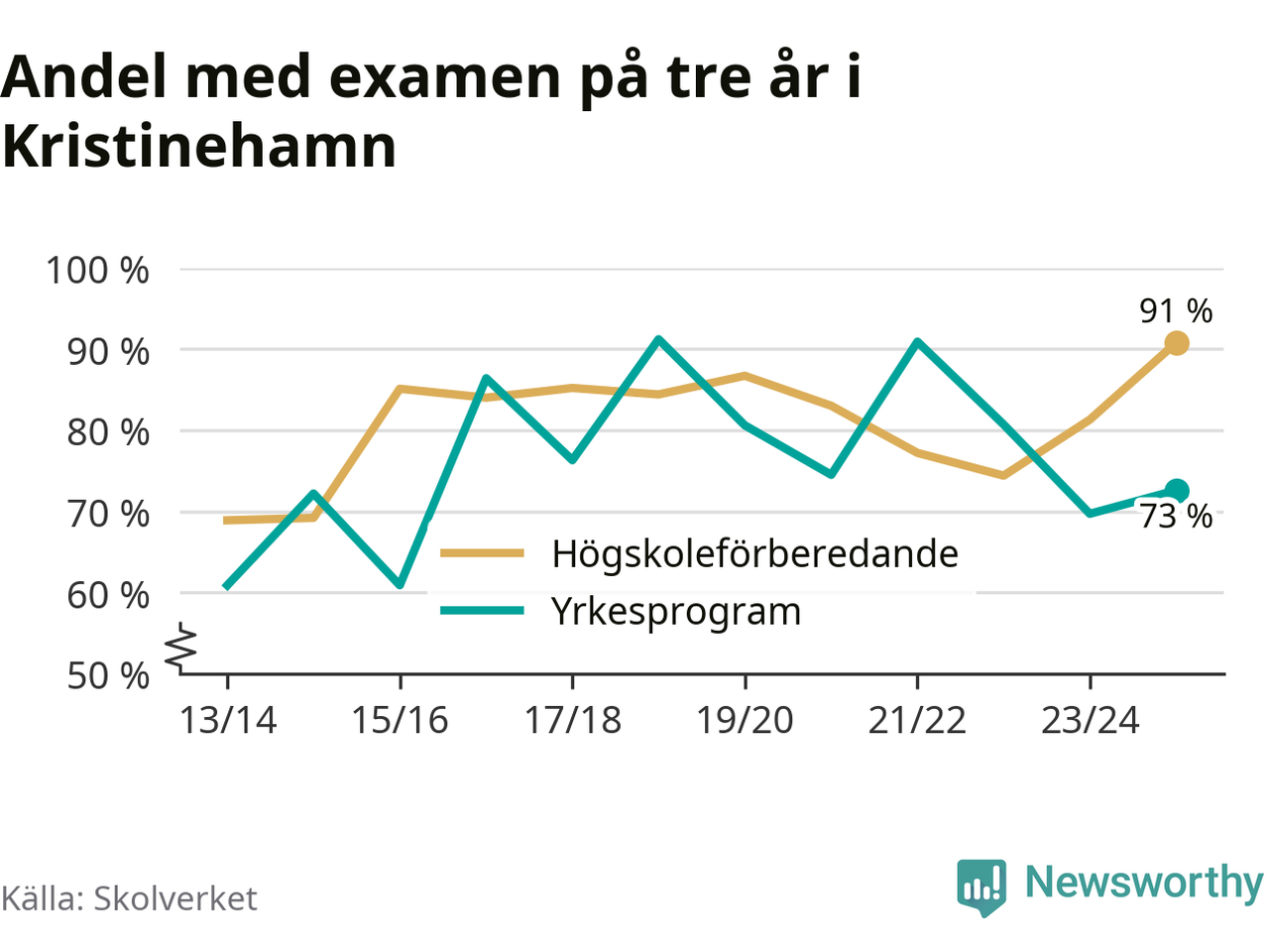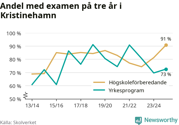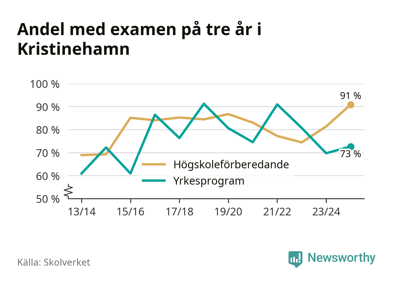Inte sedan åtminstone läsåret 2013/14 har andelen elever som klarat gymnasieexamen på högskoleförberedande program varit högre i Kristinehamn. Det visar Skolverkets senaste statistik.