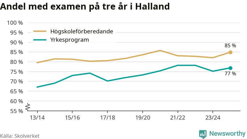 Enligt Skolverket är den främsta anledningen att andelen elever som har avbrutit eller förlängt sina gymnasiestudier minskat. Samtidigt har fler elever på högskoleförberedande program blivit godkända på gymnasiearbetet.