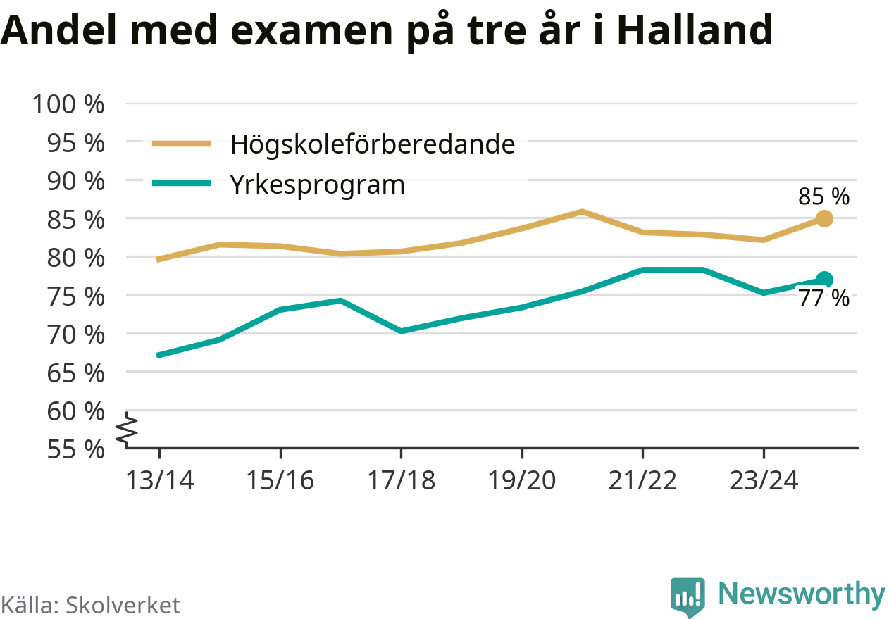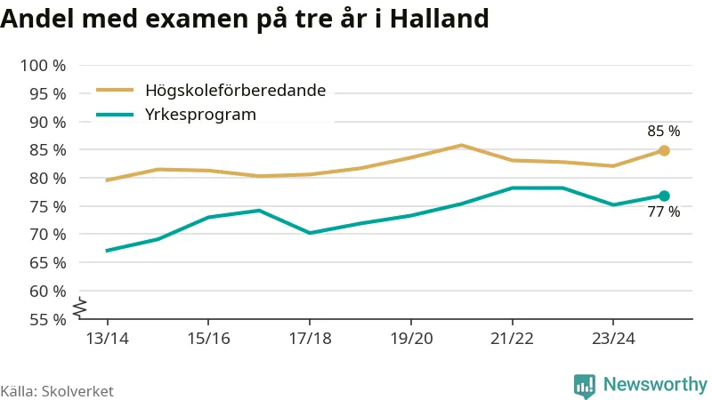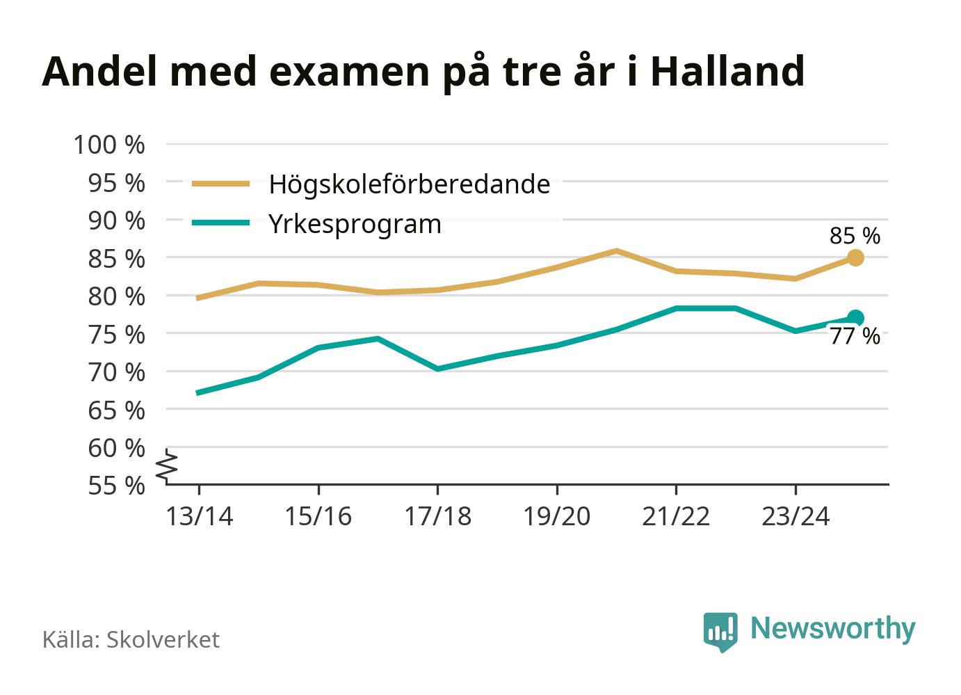 I riket som helhet ökade andelen som tog gymnasieexamen på tre år, både för högskoleförberedande och yrkesprogram. I våras var det 82,6 respektive 75,9 procent som klarade examen på tre år.