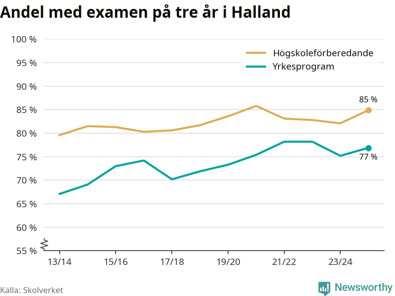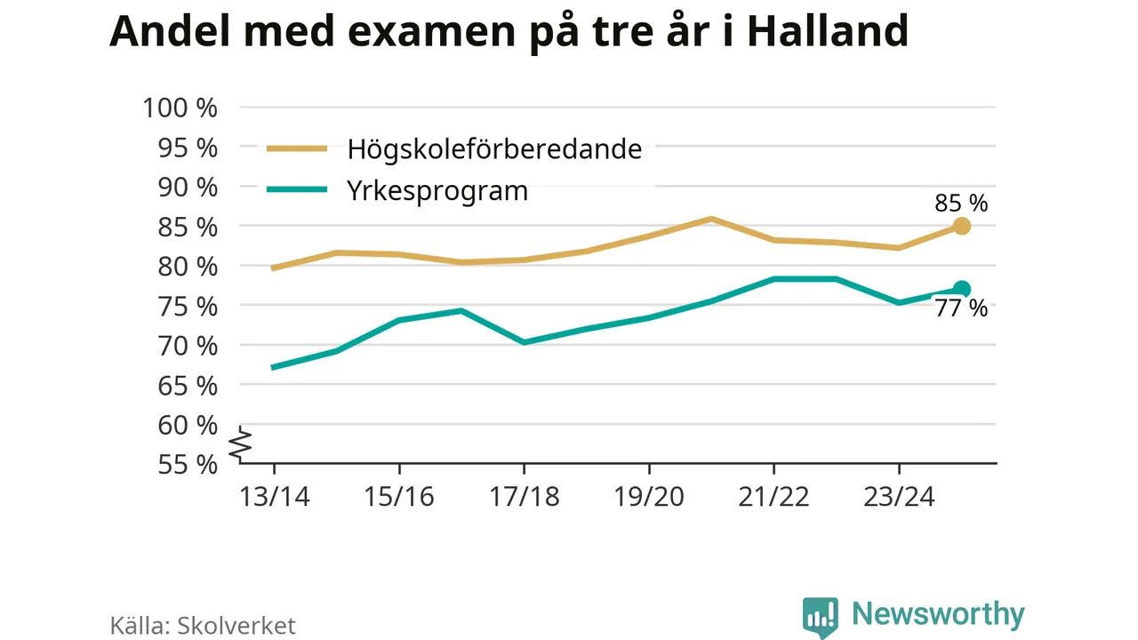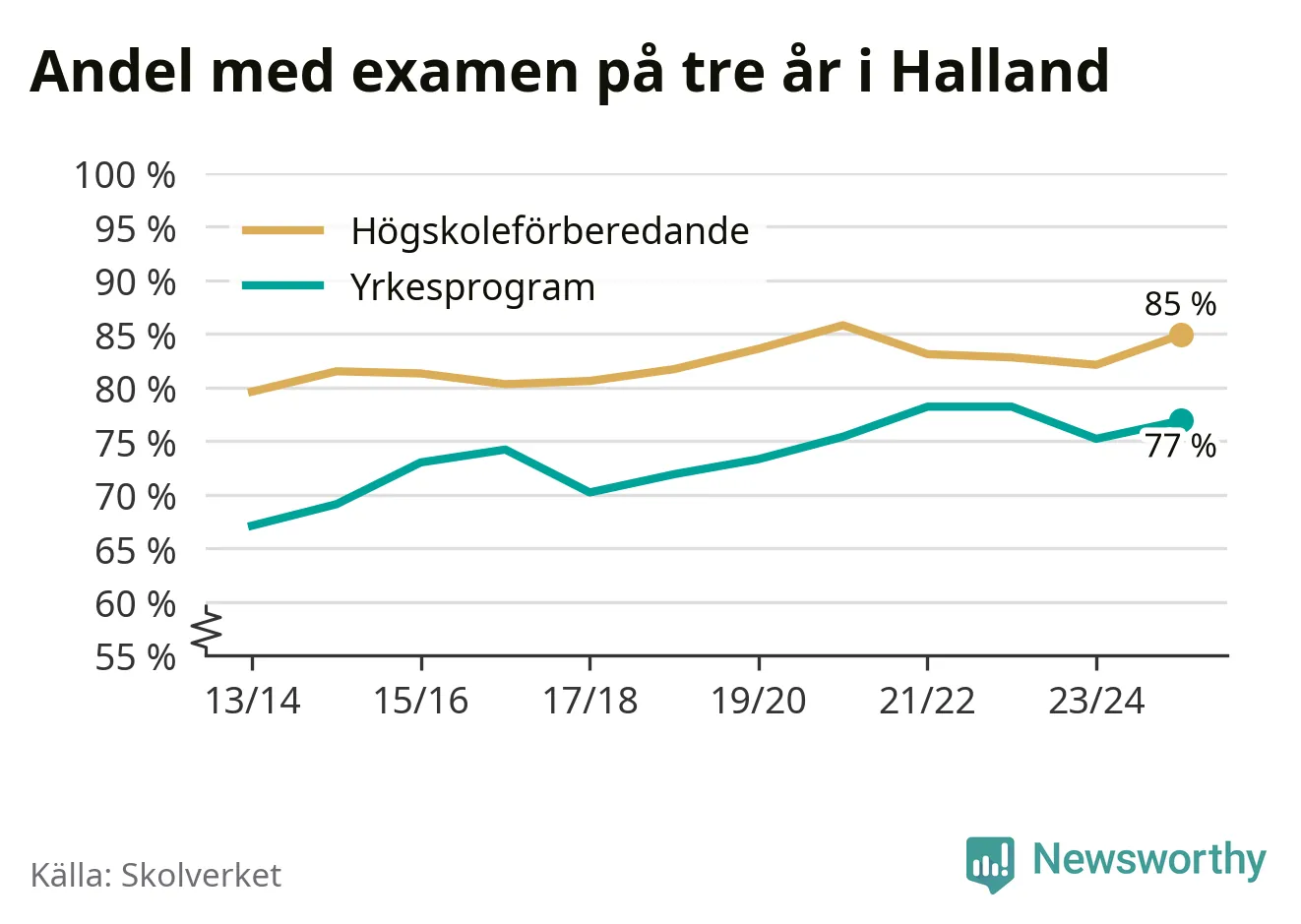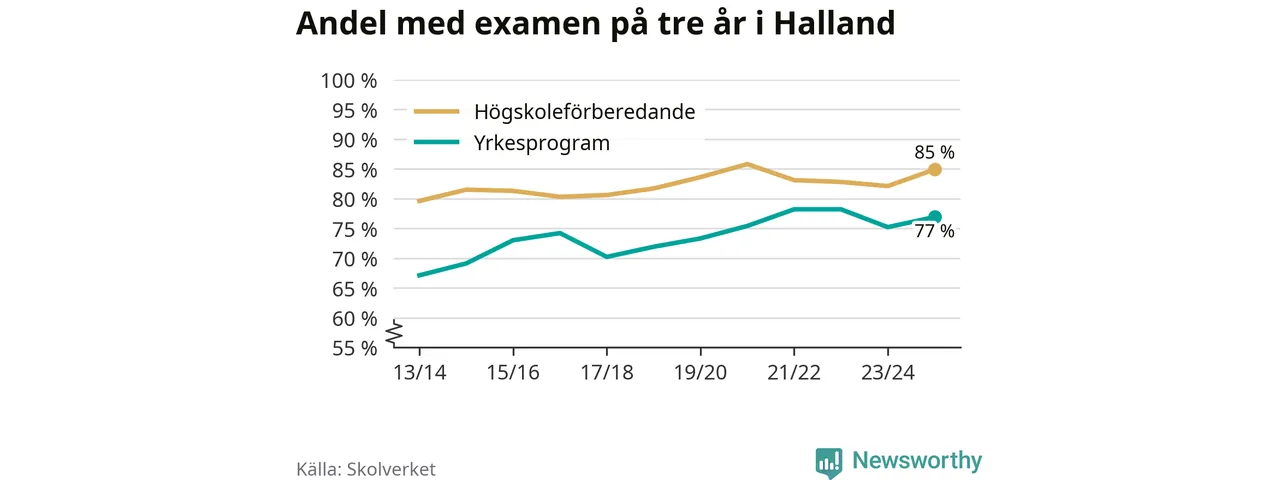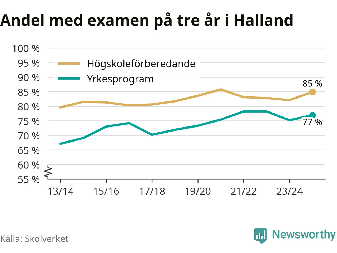 Andelen elever som klarade examen på tre år på gymnasieskolorna i Halland ökade i våras. Det visar Skolverkets statistik. Ökningen följer trenden i riket som helhet.