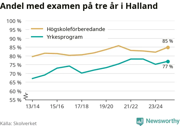 När eleverna på de yrkesförberedande programmen i Hallands län sprang ut i våras hade 77 procent klarat gymnasieexamen på tre år. Det är två procentenheter fler än året innan.