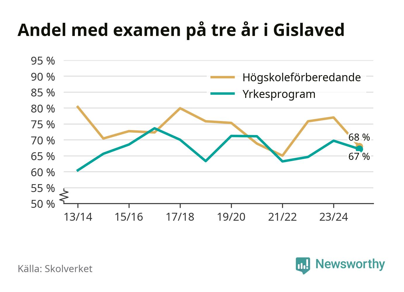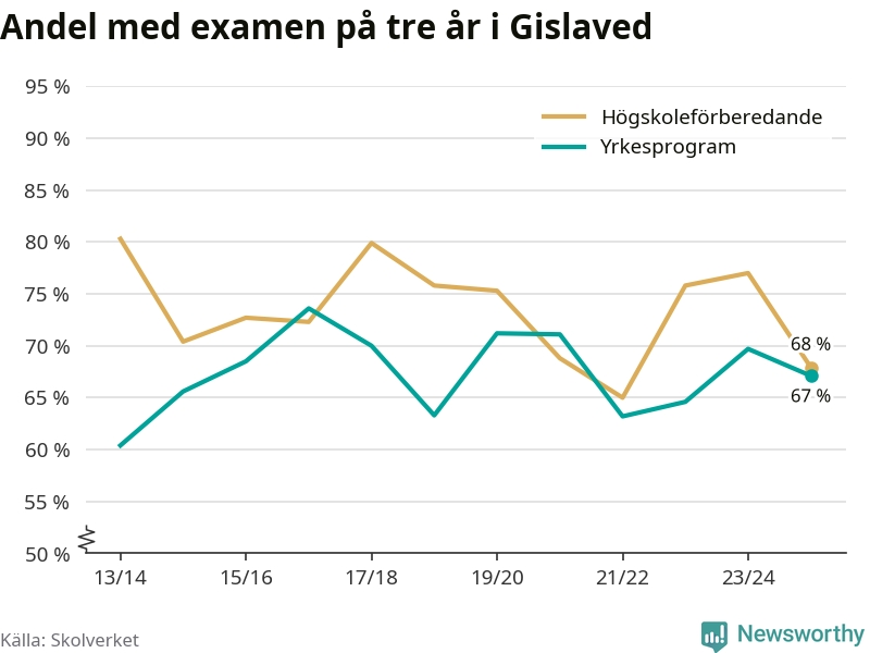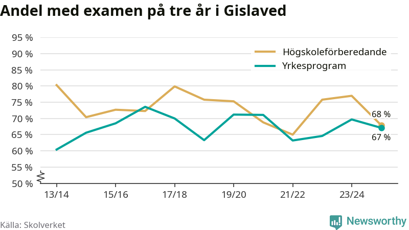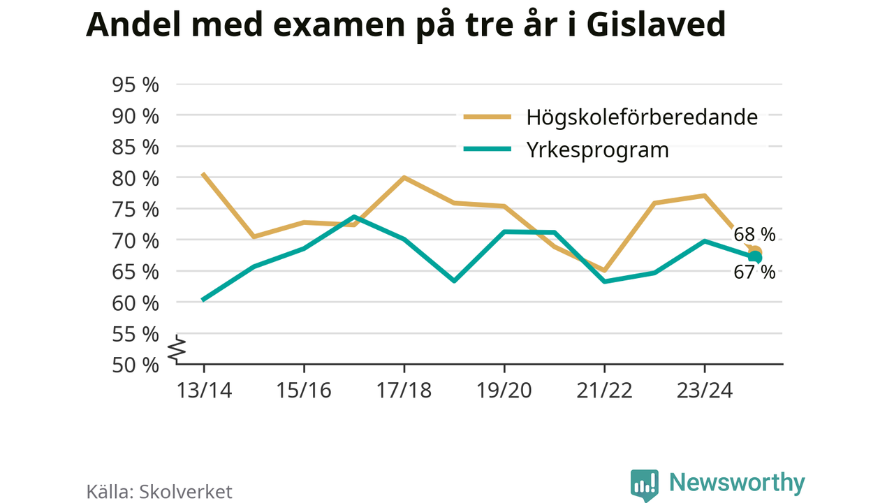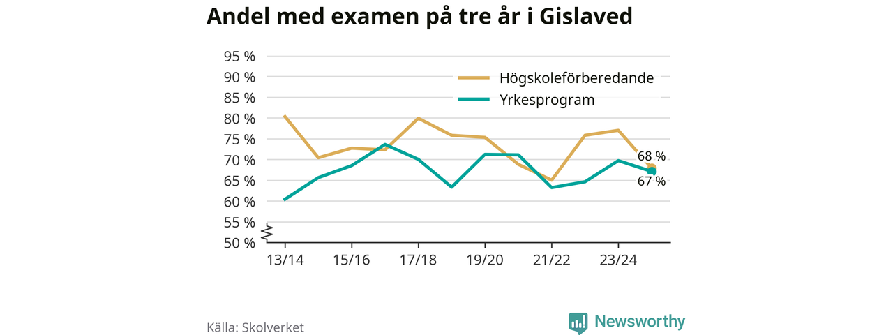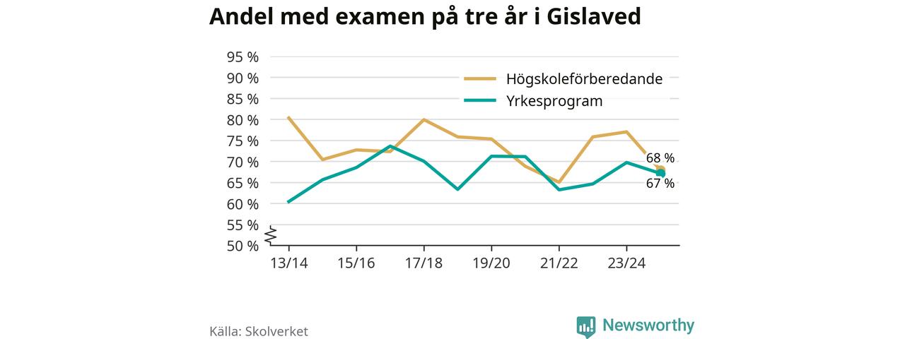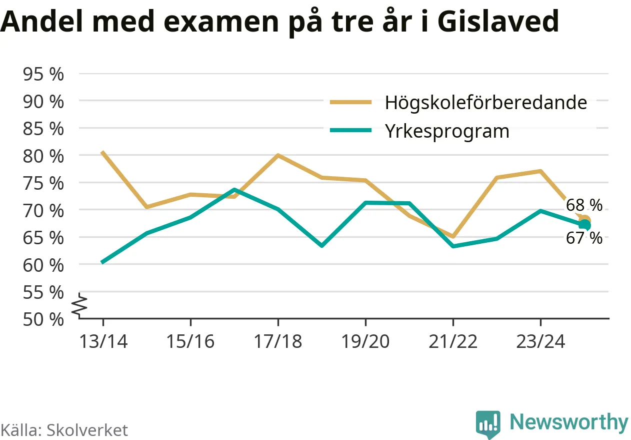 Högst andel som klarade examen i Gislaveds kommun, de nationella programmen sammantaget, fanns på Motorsportsgymnasiet i Anderstorp, där eleverna läser på fordons- och transportprogrammet. Där klarade 79 procent av de 28 elever som började gymnasiet 2022/23 examen i våras. Det är i närheten av rikssnittet.
