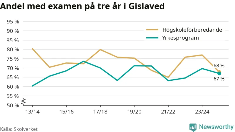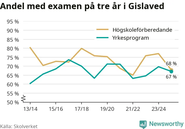 När eleverna på de yrkesförberedande programmen i Gislaveds kommun sprang ut i våras hade 67 procent klarat gymnasieexamen på tre år. Det är tre procentenheter färre än året innan.