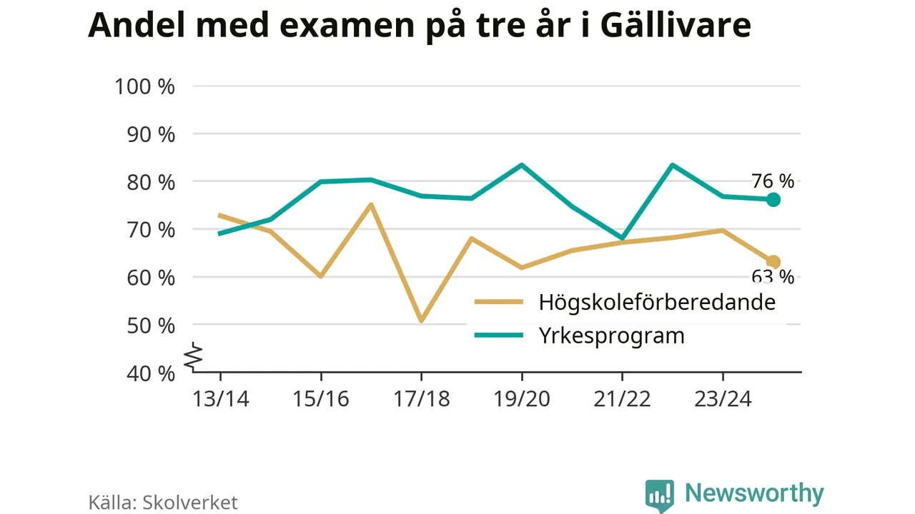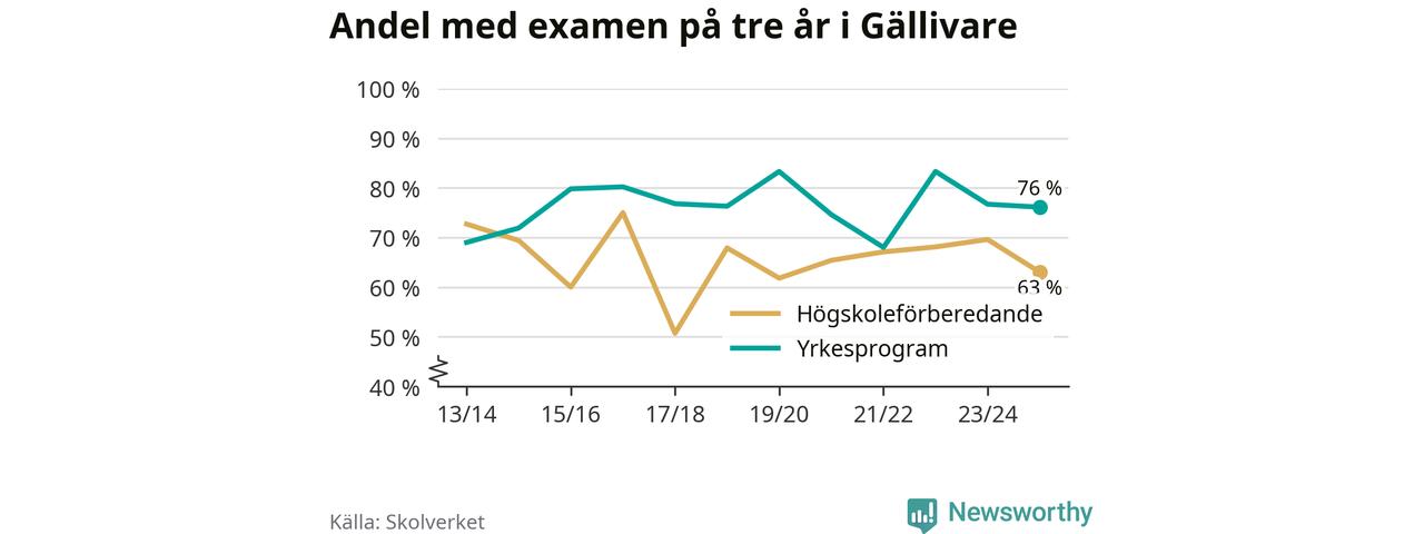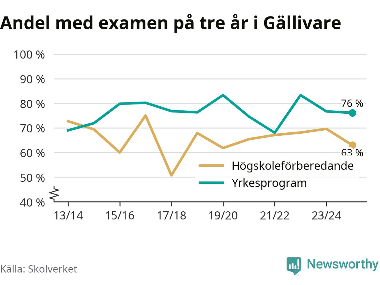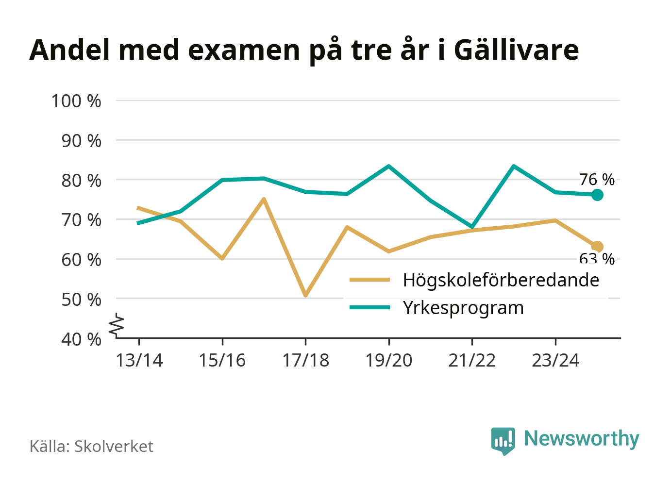 Högst andel som klarade examen i Gällivare kommun, de nationella programmen sammantaget, fanns på Lapplands Gymnasium Gällivare enhet 3, där eleverna läser på ekonomiprogrammet. Där klarade 76 procent av de 62 elever som började gymnasiet 2022/23 examen i våras. Det är i närheten av rikssnittet.