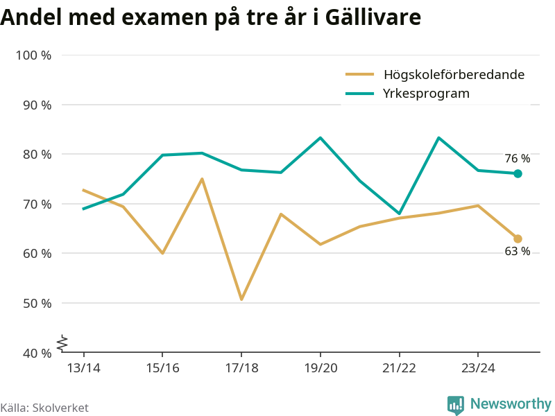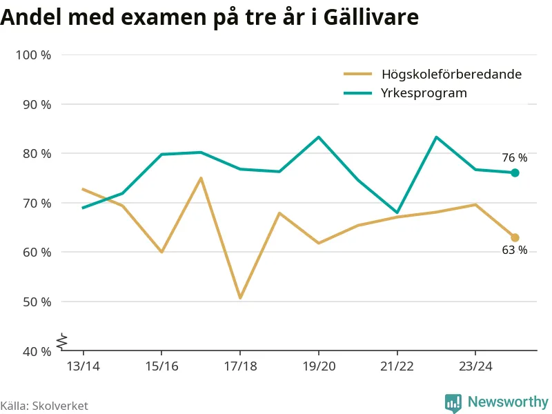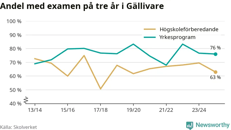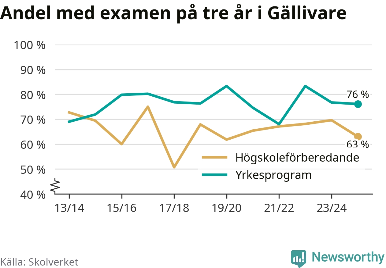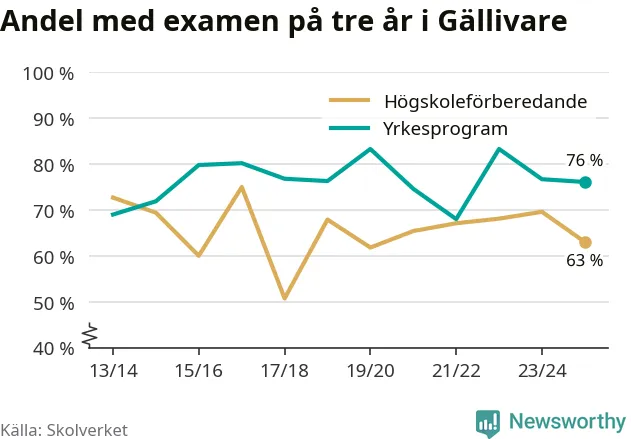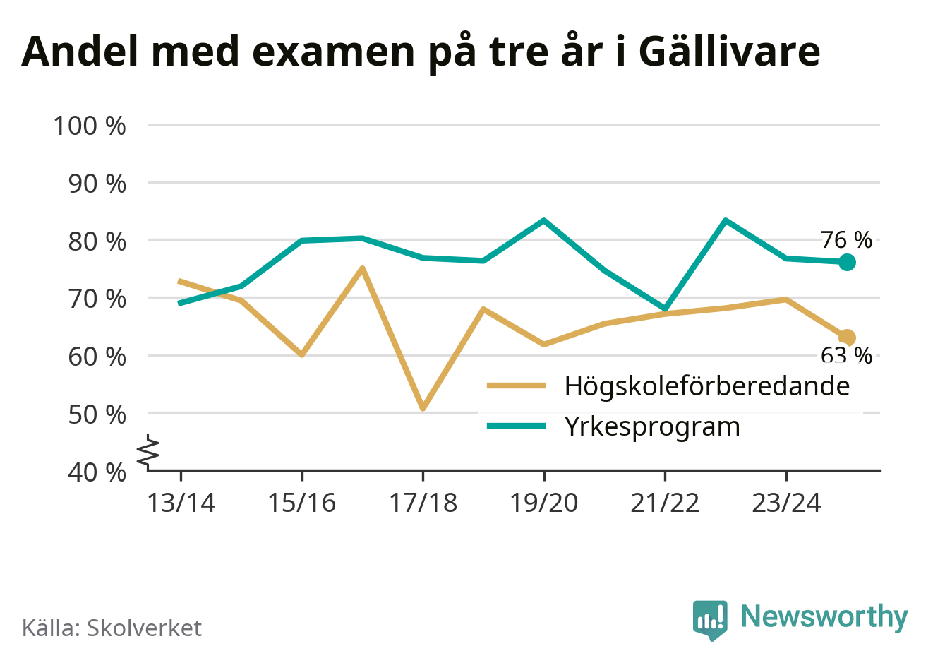 Högst andel som klarade examen i Gällivare kommun, de nationella programmen sammantaget, fanns på Lapplands Gymnasium Gällivare enhet 3, där eleverna läser på ekonomiprogrammet. Där klarade 76 procent av de 62 elever som började gymnasiet 2022/23 examen i våras. Det är i närheten av rikssnittet.