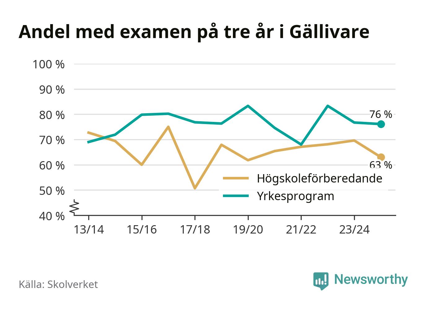 När eleverna på de yrkesförberedande programmen på Lapplands Gymnasium Gällivare enhet 3, Lapplands Gymnasium Gällivare enhet 2 och Lapplands Gymnasium Gällivare enhet 1 sprang ut i våras hade 76 procent klarat gymnasieexamen på tre år. Det är en procentenhet färre än året innan.