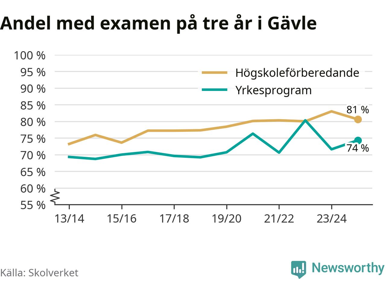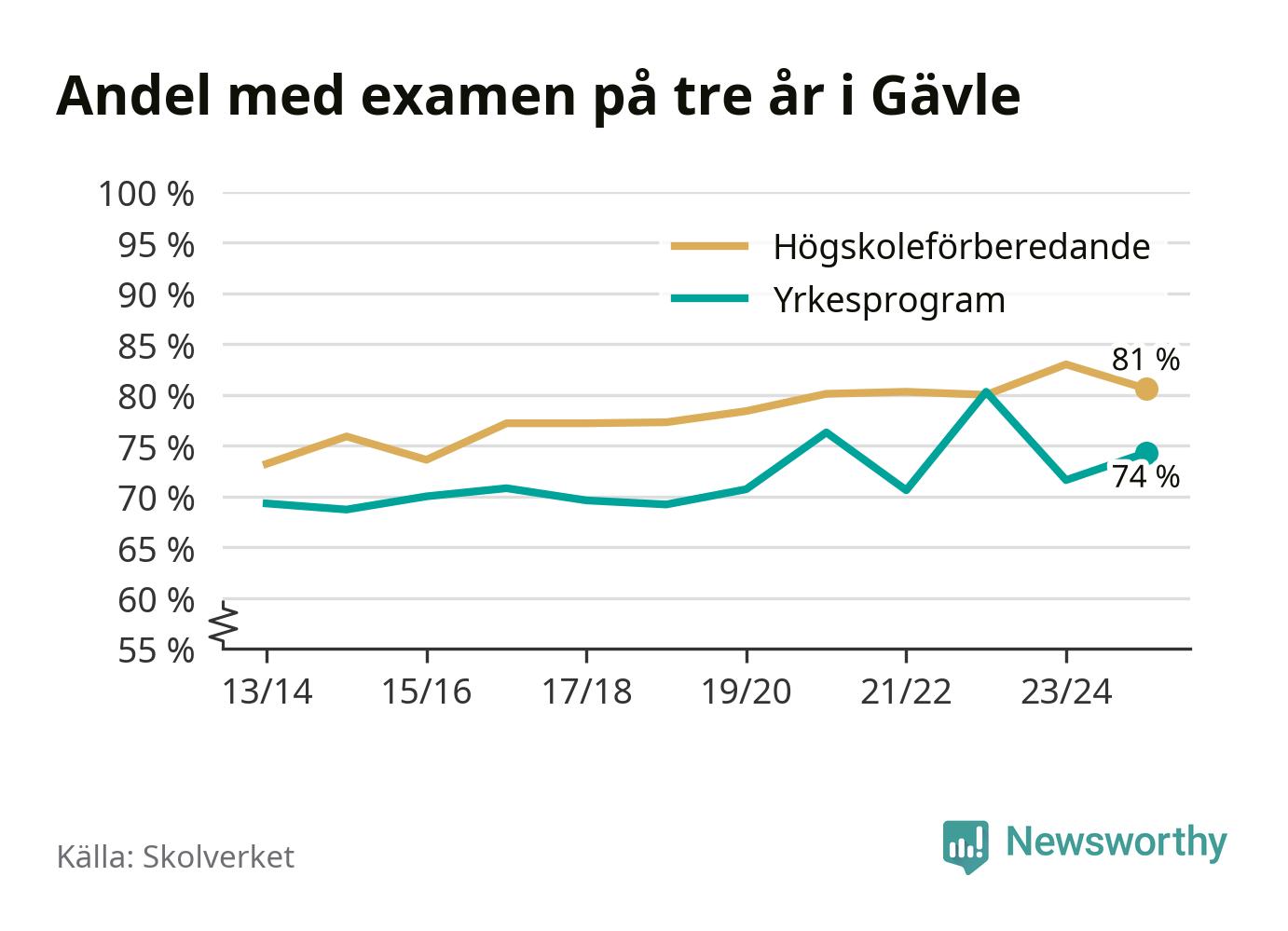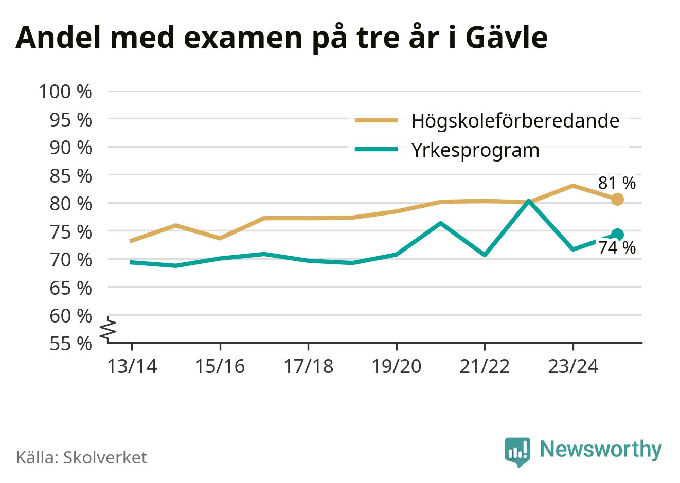 När eleverna på de yrkesförberedande programmen i Gävle kommun sprang ut i våras hade 74 procent klarat gymnasieexamen på tre år. Det är två procentenheter fler än året innan.