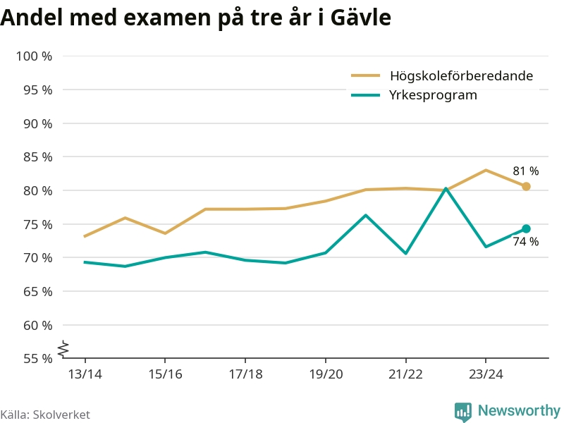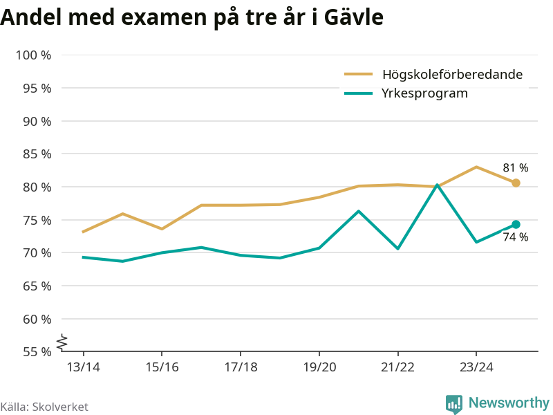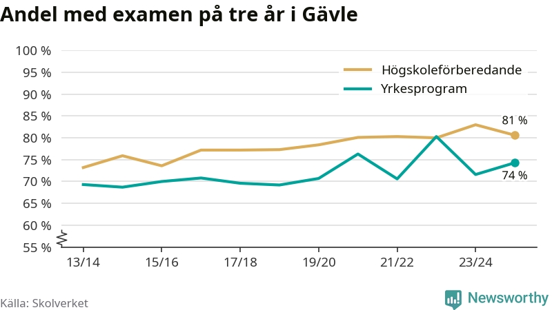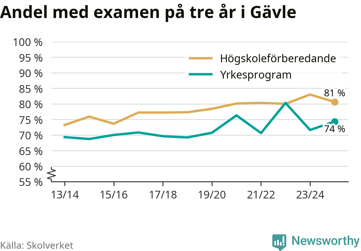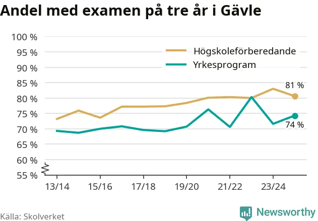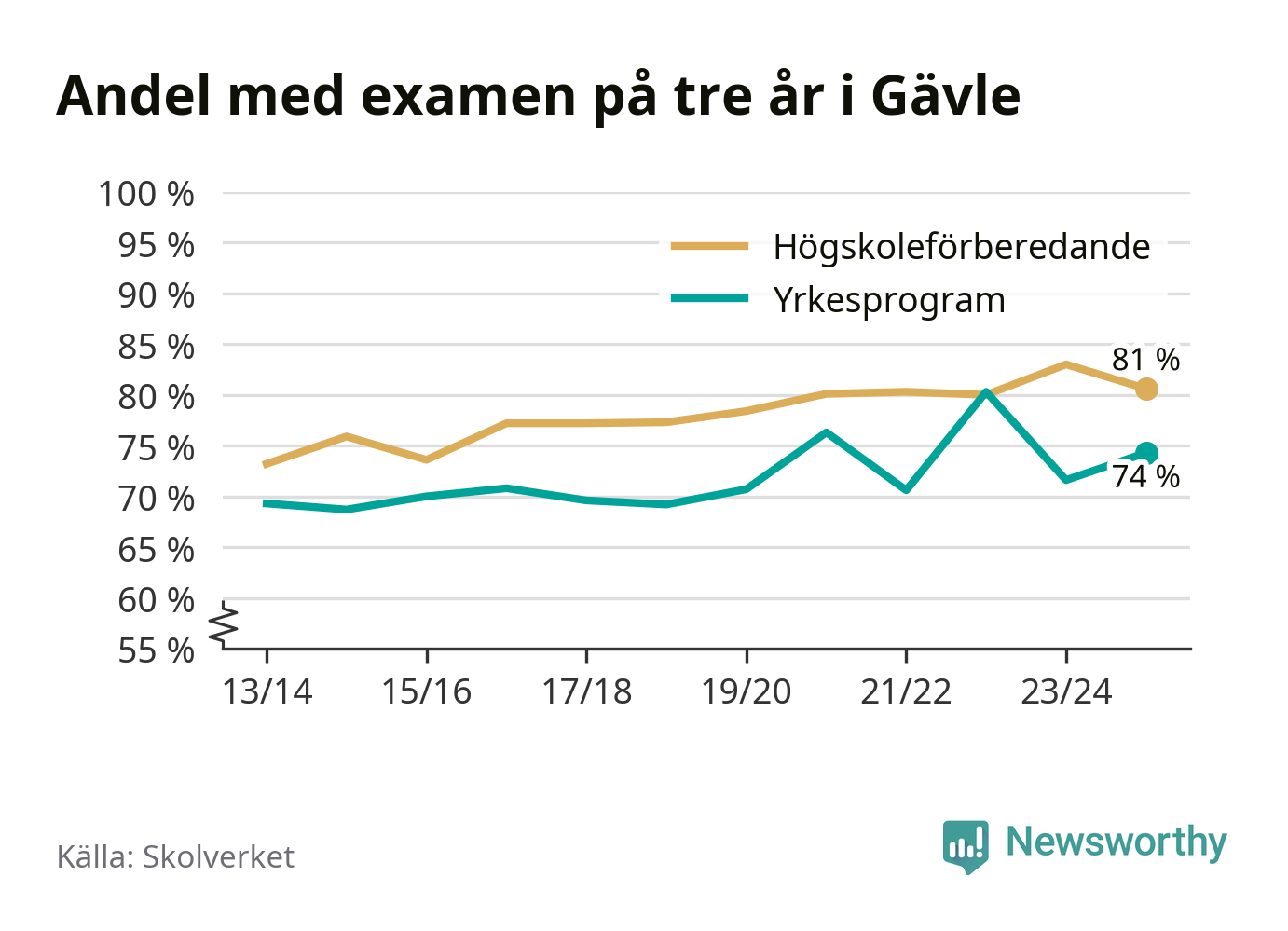 När eleverna på de yrkesförberedande programmen i Gävle kommun sprang ut i våras hade 74 procent klarat gymnasieexamen på tre år. Det är två procentenheter fler än året innan.