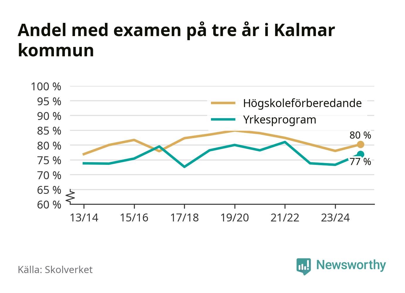 Andelen elever som klarade examen på tre år på gymnasieskolorna i Kalmar kommun ökade i våras. Det visar Skolverkets statistik. Ökningen följer trenden i riket som helhet.