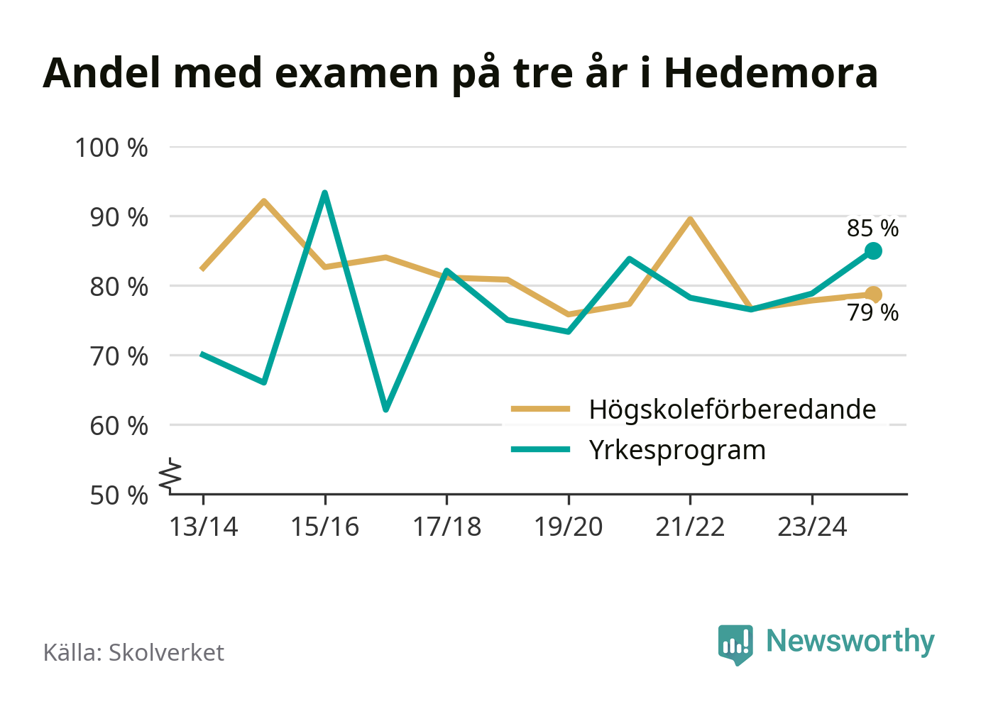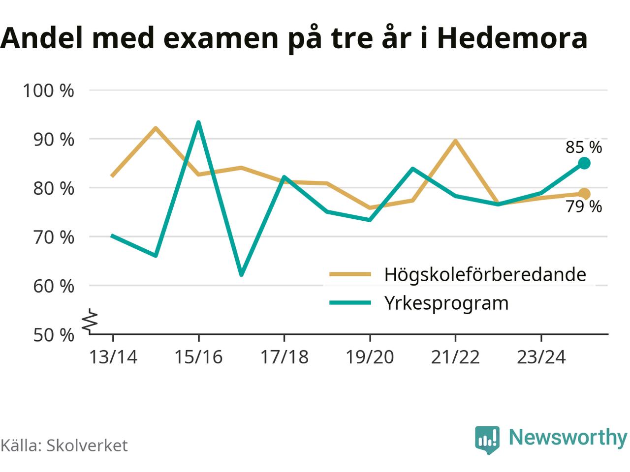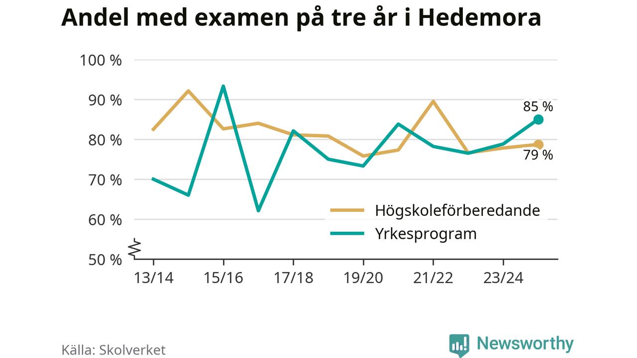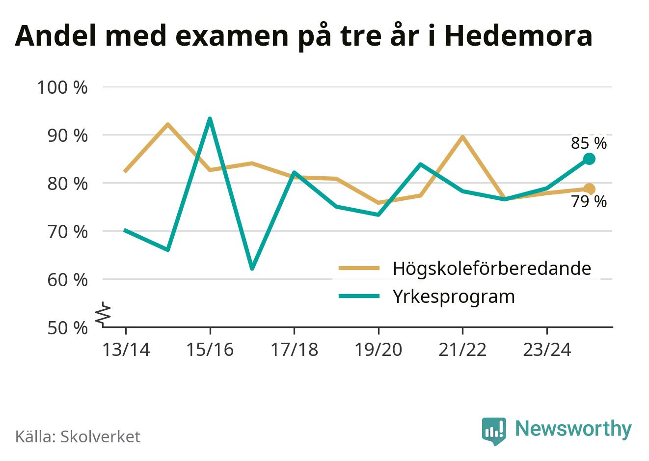Precis som i riket som helhet ökade andelen som klarade gymnasieexamen från yrkesprogram på tre år i Hedemora.