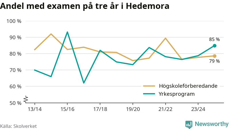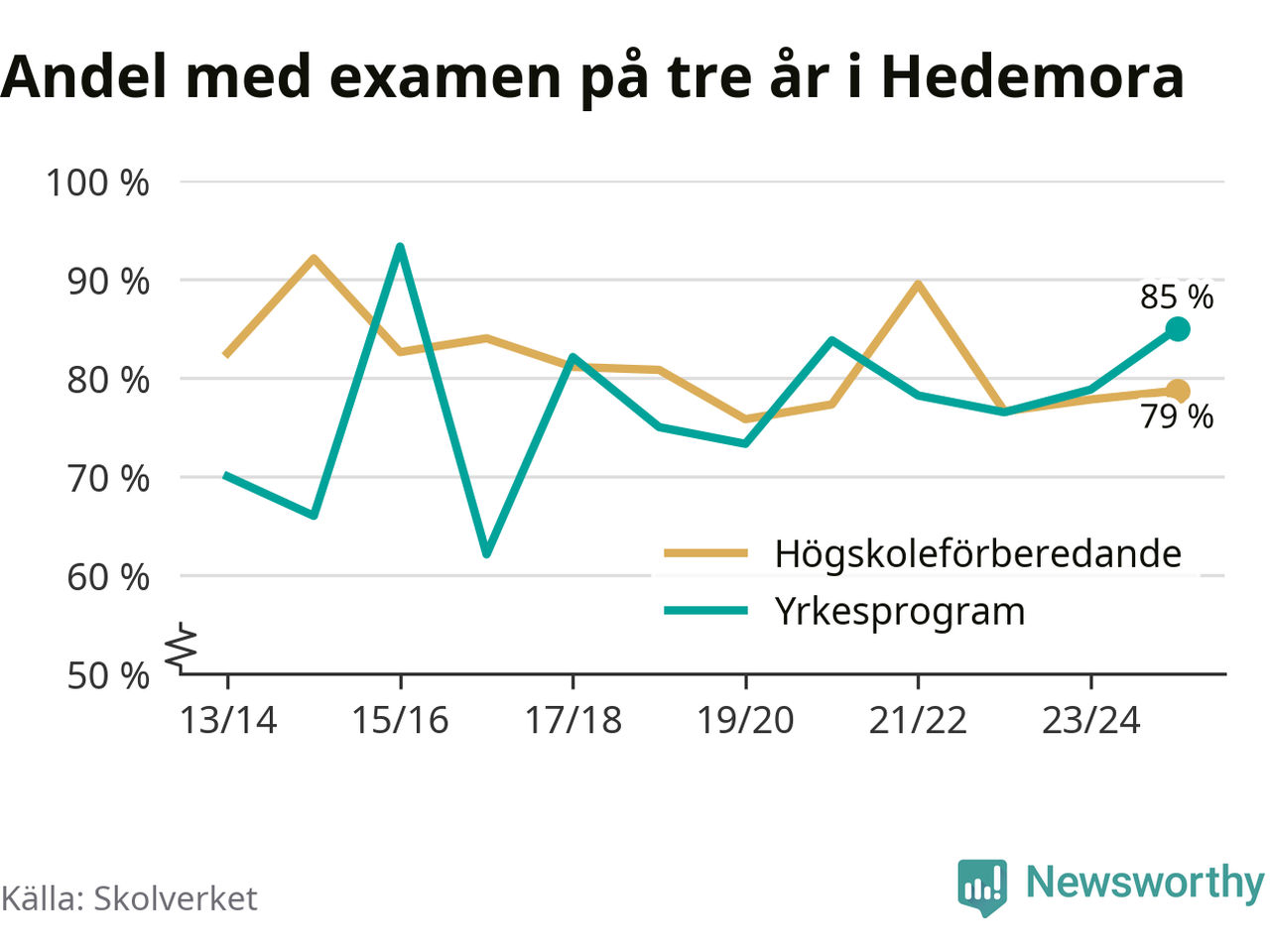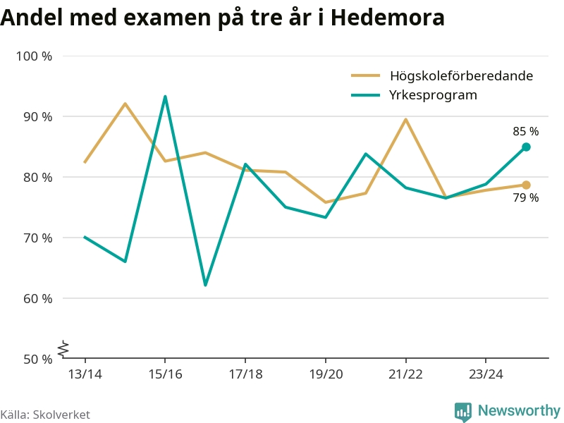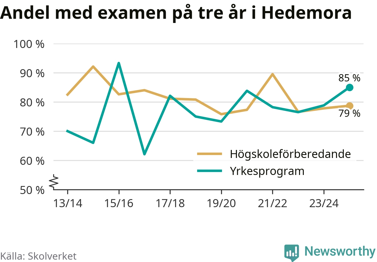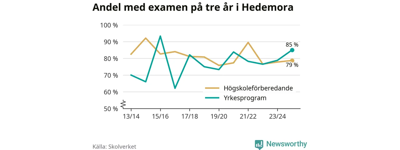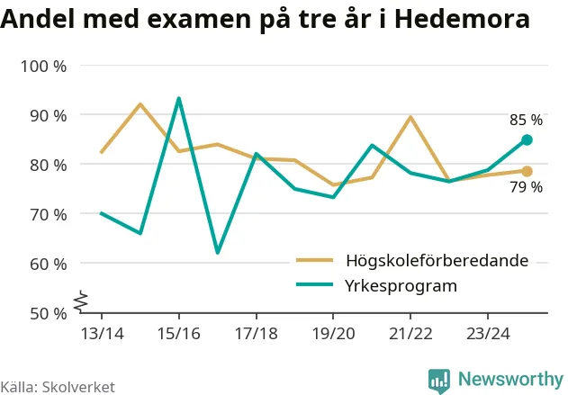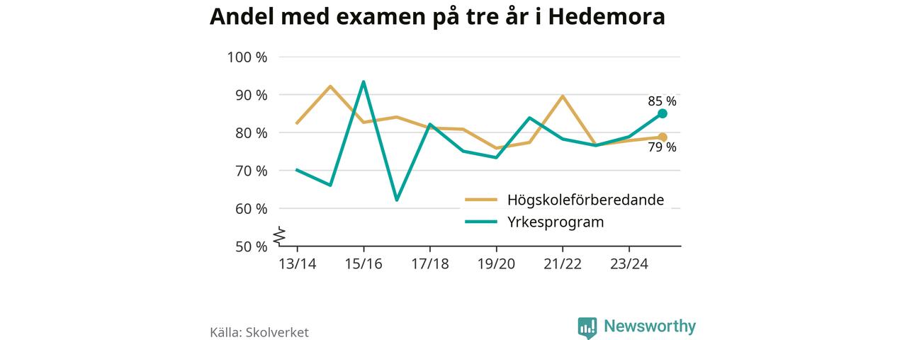 Precis som i riket som helhet ökade andelen som klarade gymnasieexamen från yrkesprogram på tre år i Hedemora.