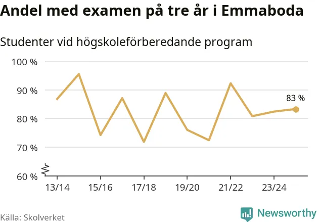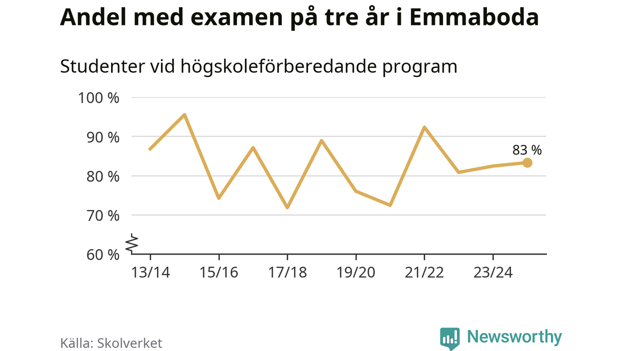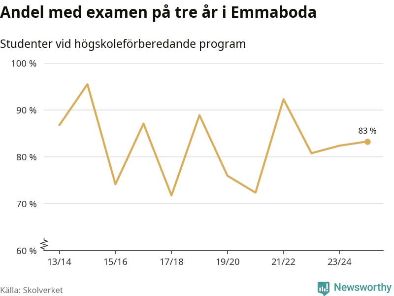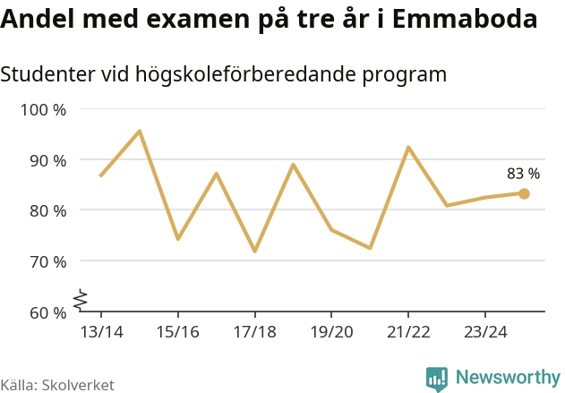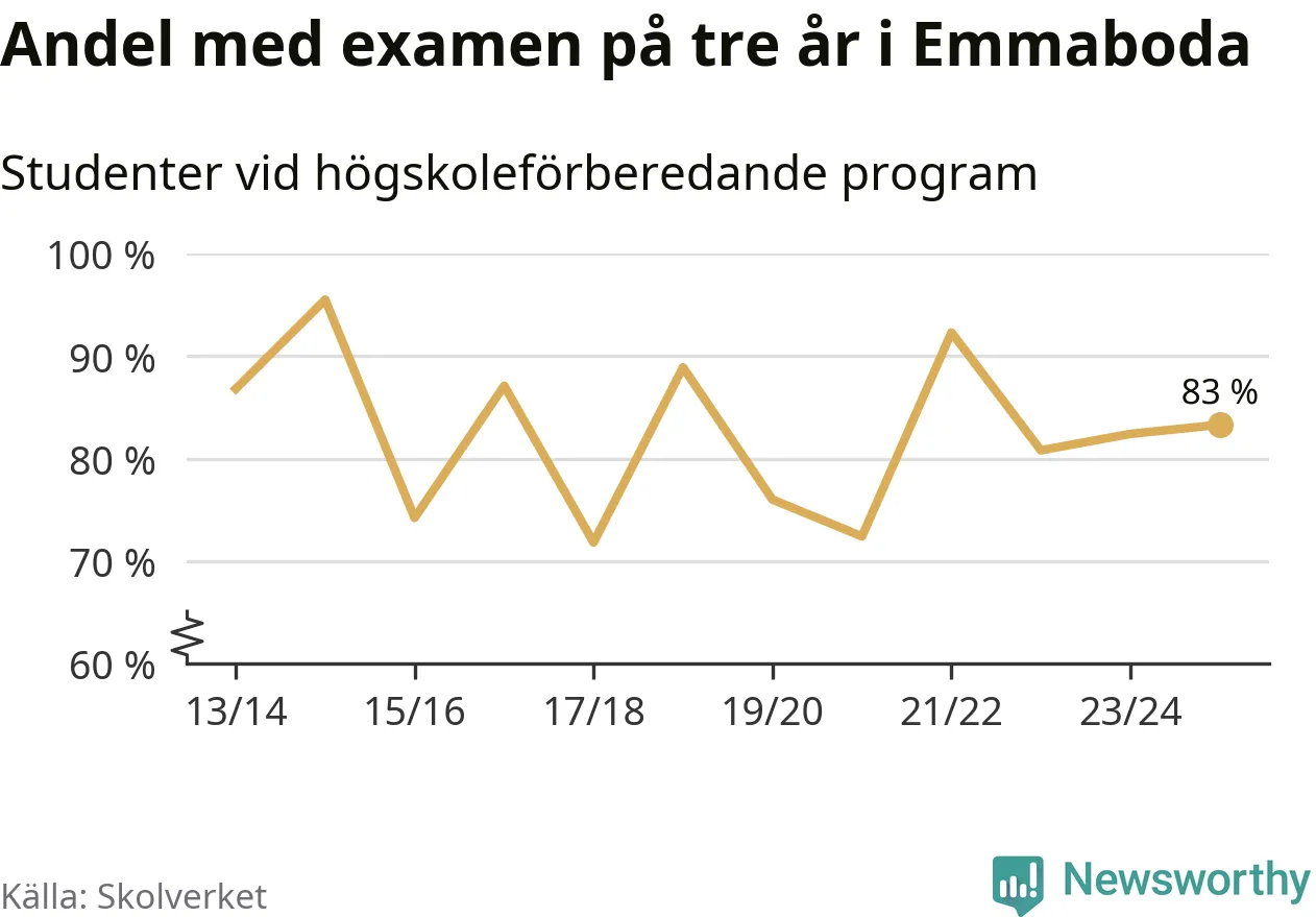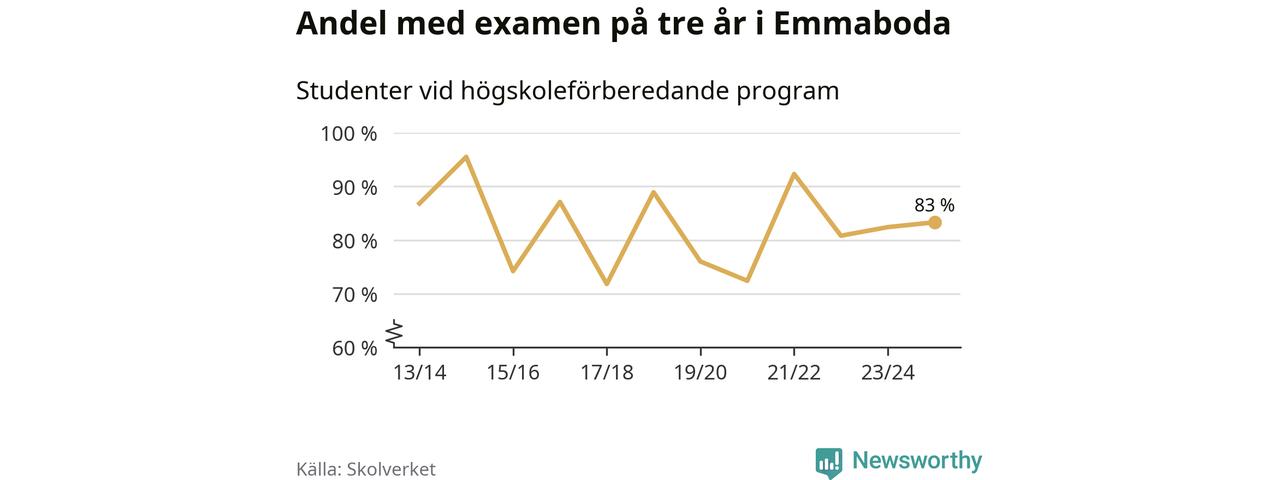 När eleverna på de högskoleförberedande programmen på Vilhelm Mobergsgymnasiet i Emmaboda sprang ut i våras hade 83 procent av dem klarat gymnasieexamen på tre år. Det är en ökning med en procentenhet jämfört med året innan. För yrkesprogrammen på skolan saknas uppgift eftersom det rör sig om för få elever.