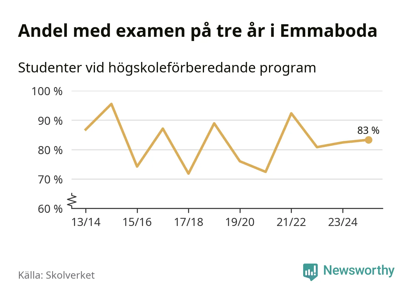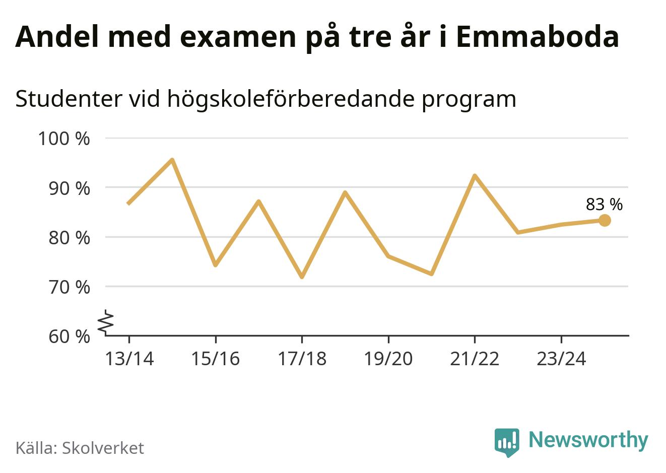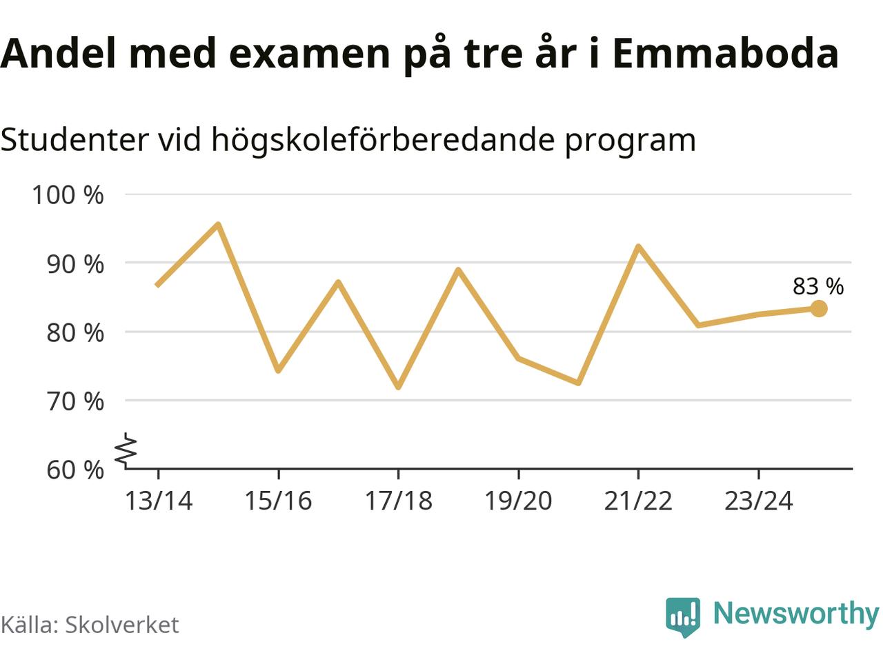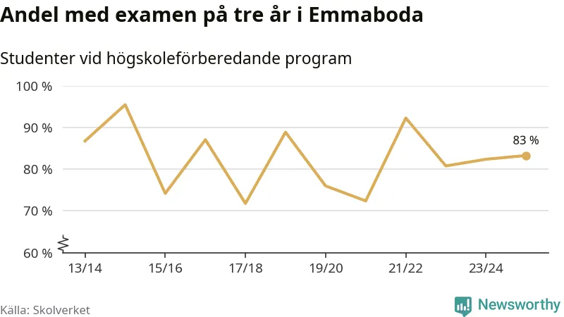 När eleverna på de högskoleförberedande programmen på Vilhelm Mobergsgymnasiet i Emmaboda sprang ut i våras hade 83 procent av dem klarat gymnasieexamen på tre år. Det är en ökning med en procentenhet jämfört med året innan. För yrkesprogrammen på skolan saknas uppgift eftersom det rör sig om för få elever.