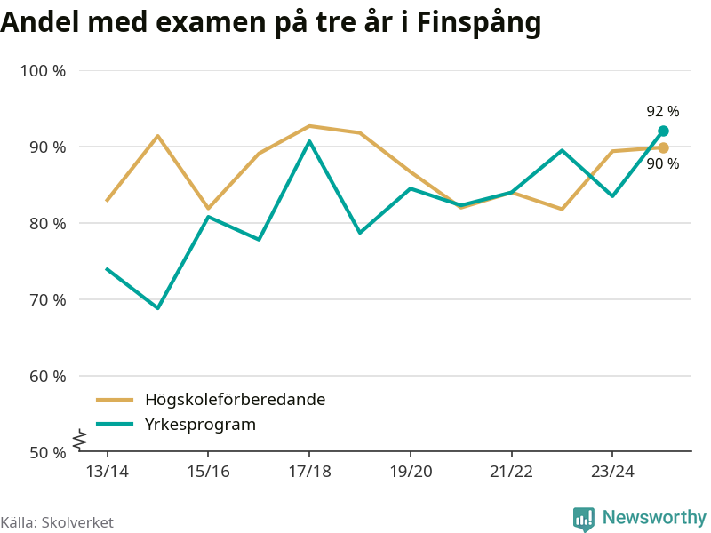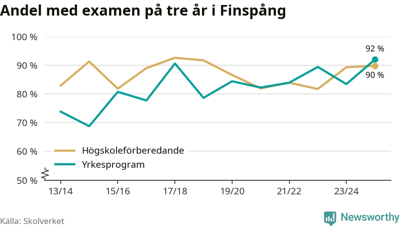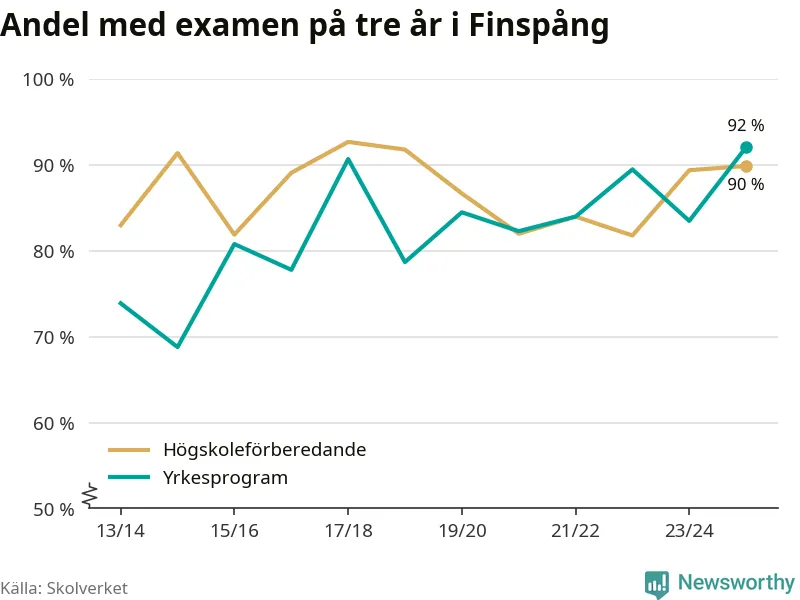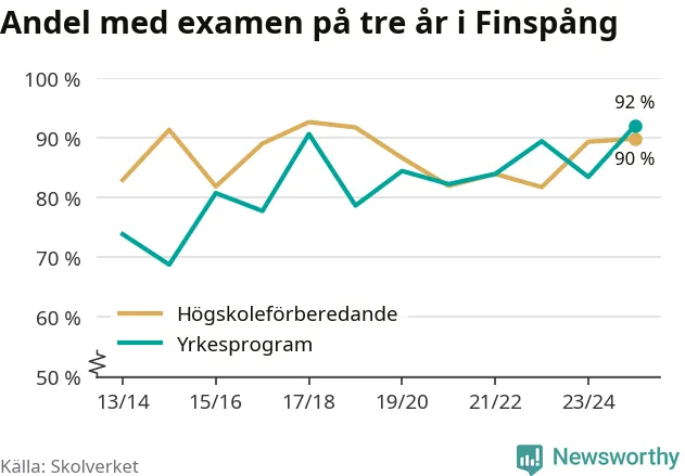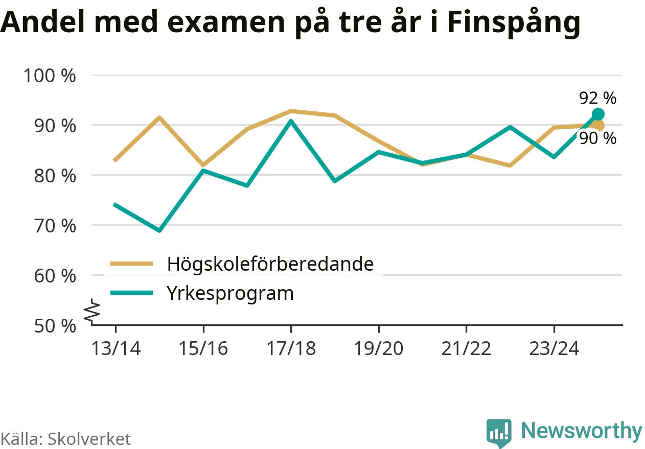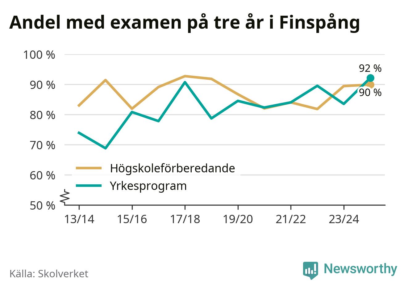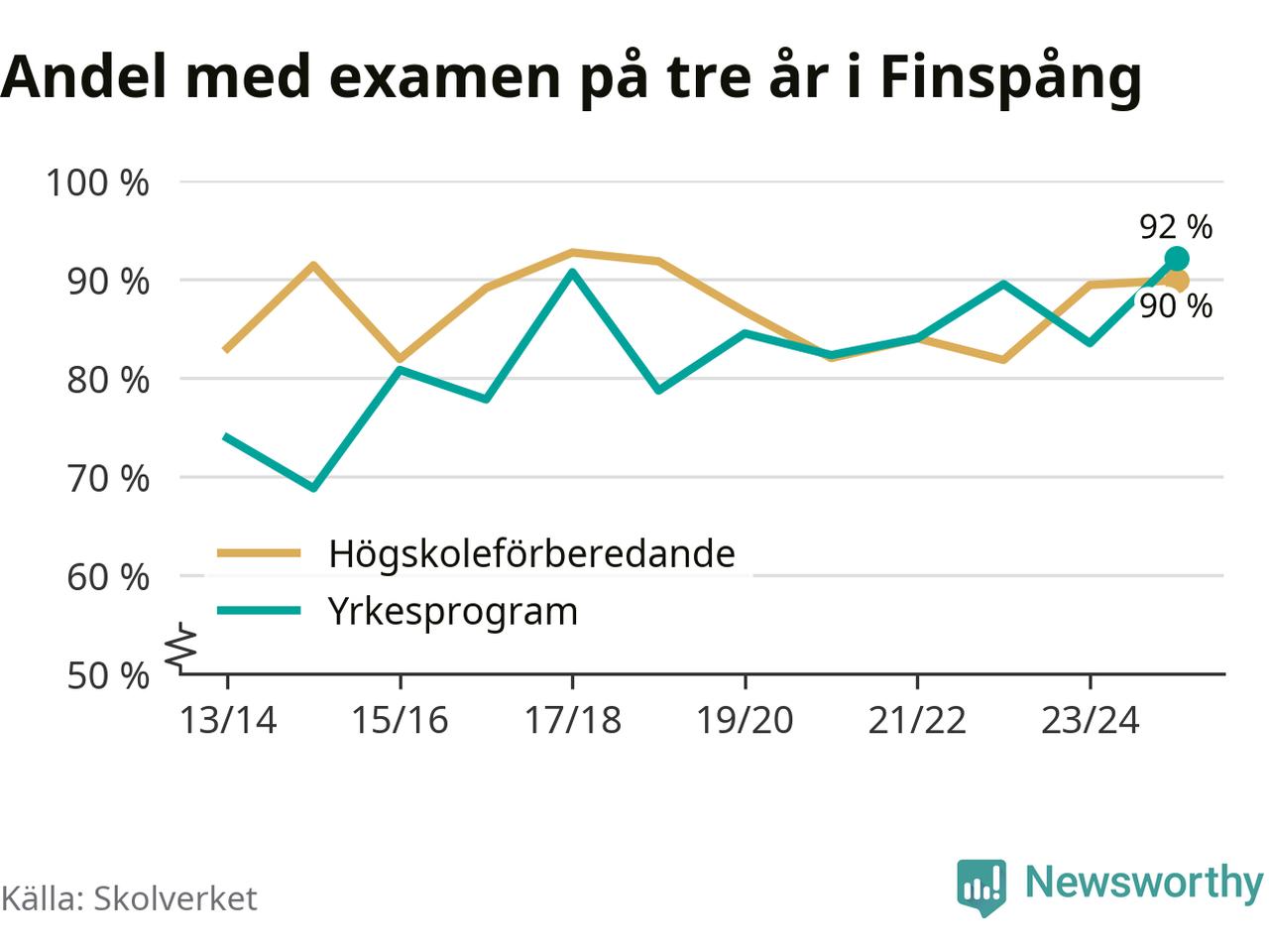 Inte sedan åtminstone läsåret 2013/14 har andelen elever som klarat gymnasieexamen på yrkesprogram varit högre i Finspång. Det visar Skolverkets senaste statistik.