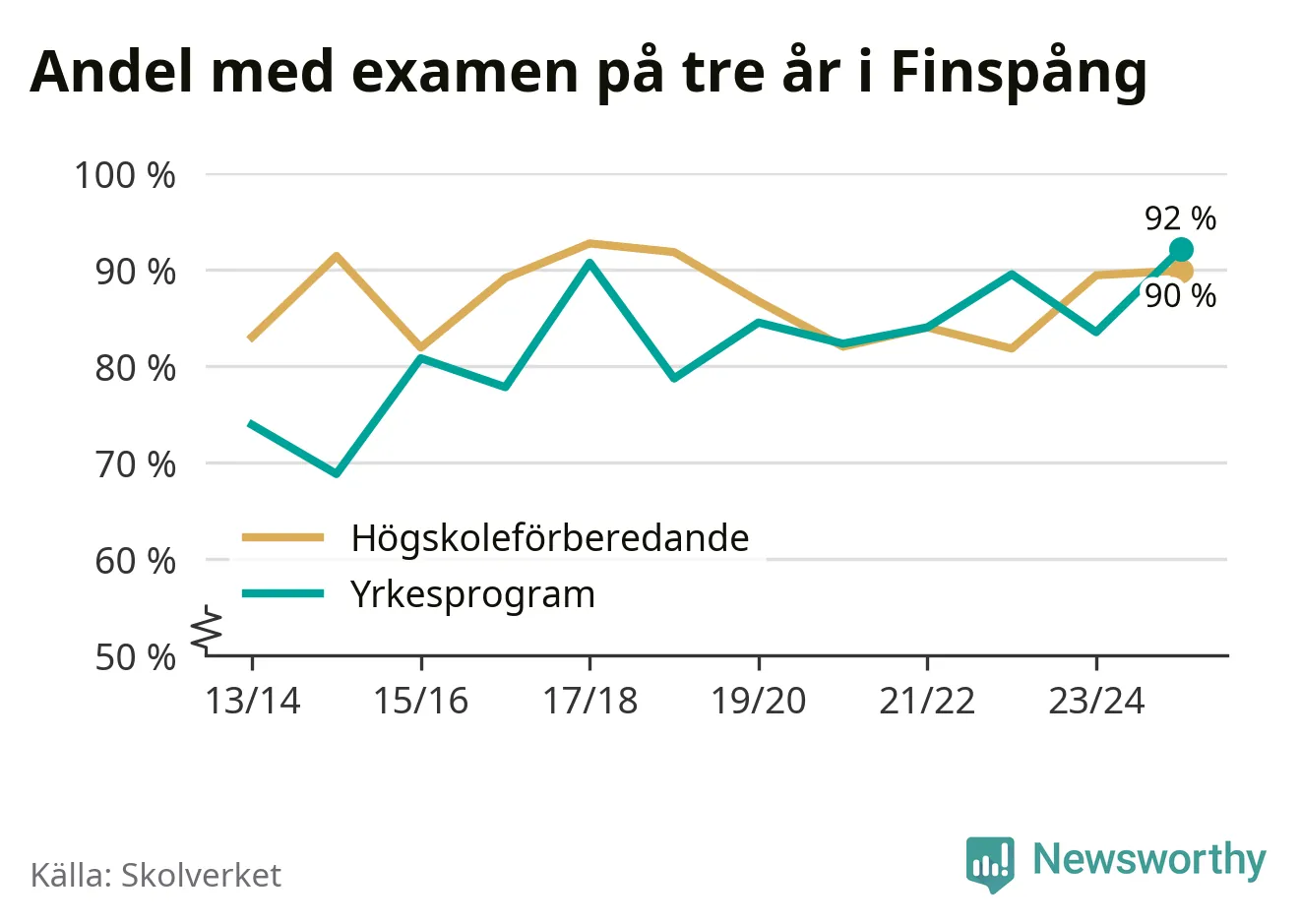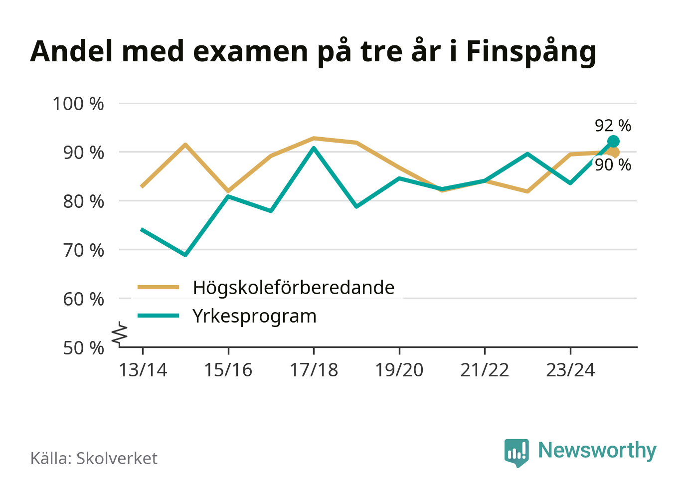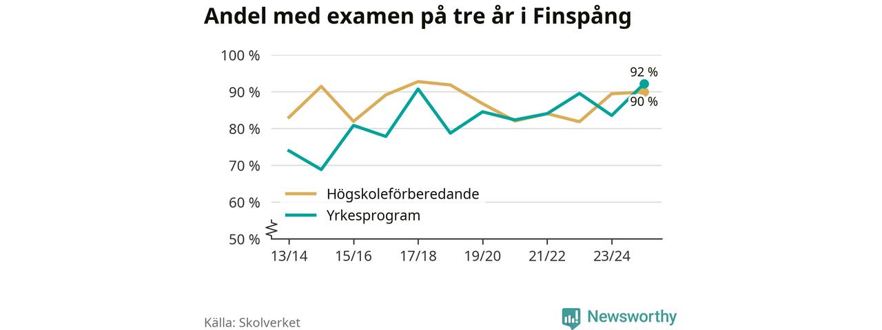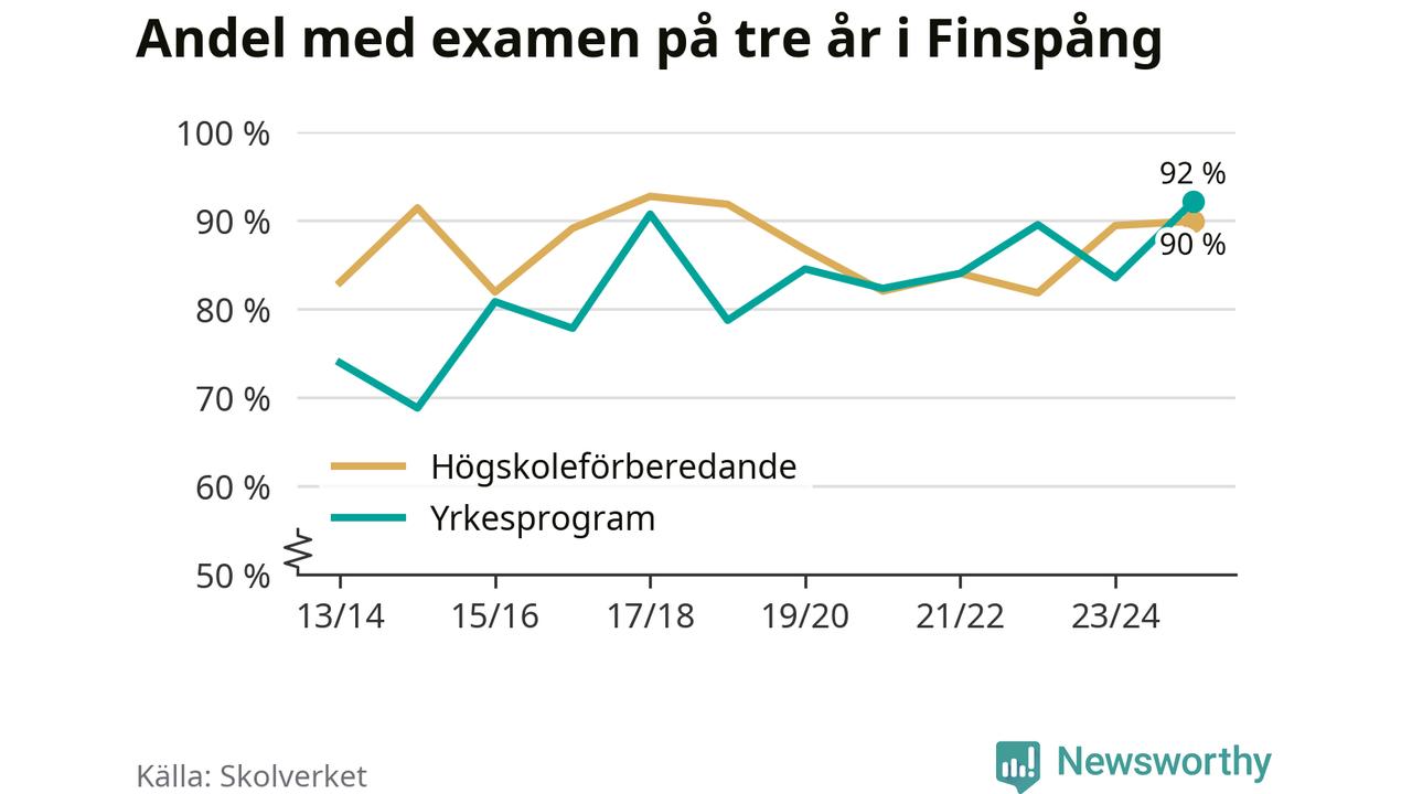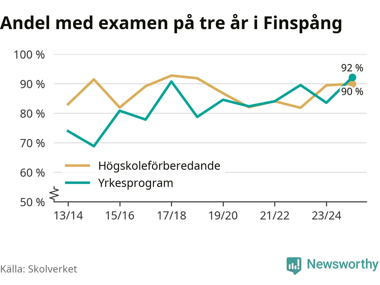 Högst andel som klarade examen i Finspångs kommun, de nationella programmen sammantaget, fanns på Curt Nicolin-gymnasiet, där eleverna läser på teknikprogrammet. Där klarade 92 procent av de 176 elever som började gymnasiet 2022/23 examen i våras. Det är en högre siffra än i riket som helhet.