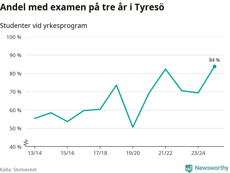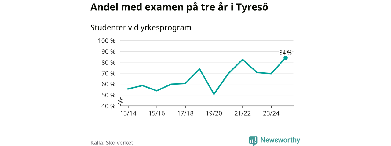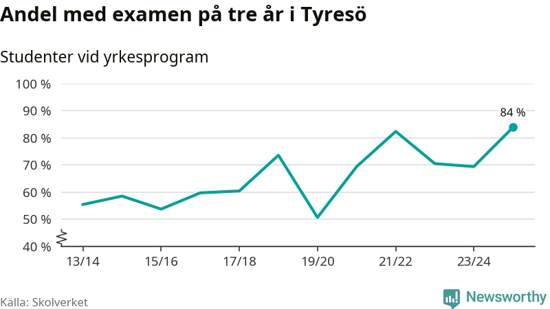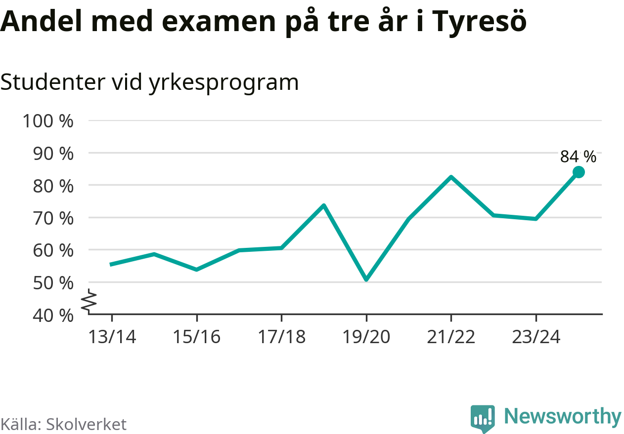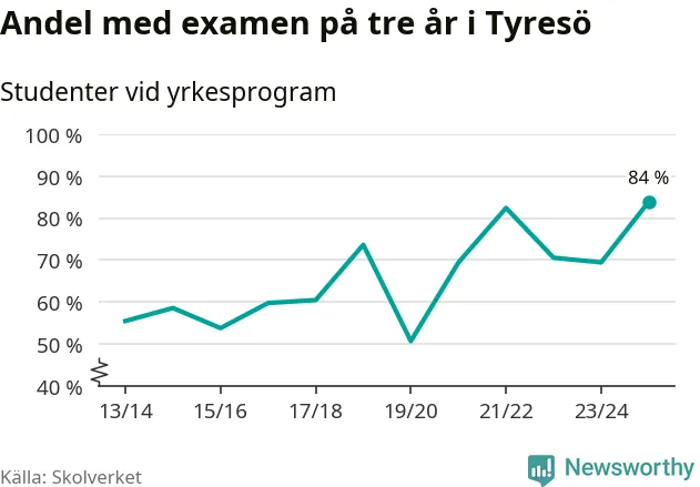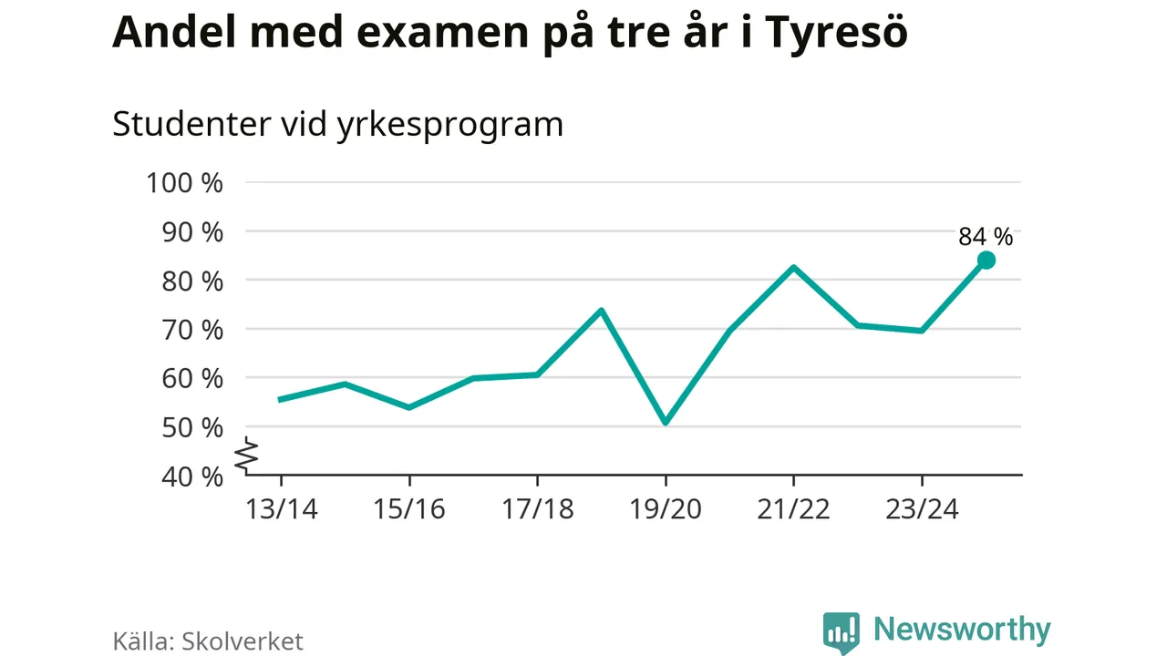 När eleverna på de yrkesförberedande programmen på Tyresö gymnasium sprang ut i våras hade 84 procent klarat gymnasieexamen på tre år. Det är 15 procentenheter fler än året innan och den högsta andelen sedan åtminstone läsåret 2013/14.