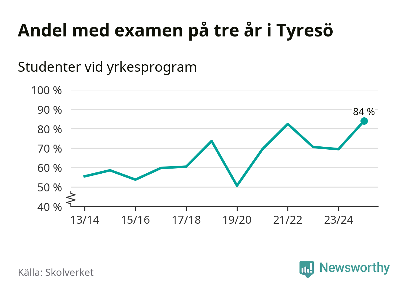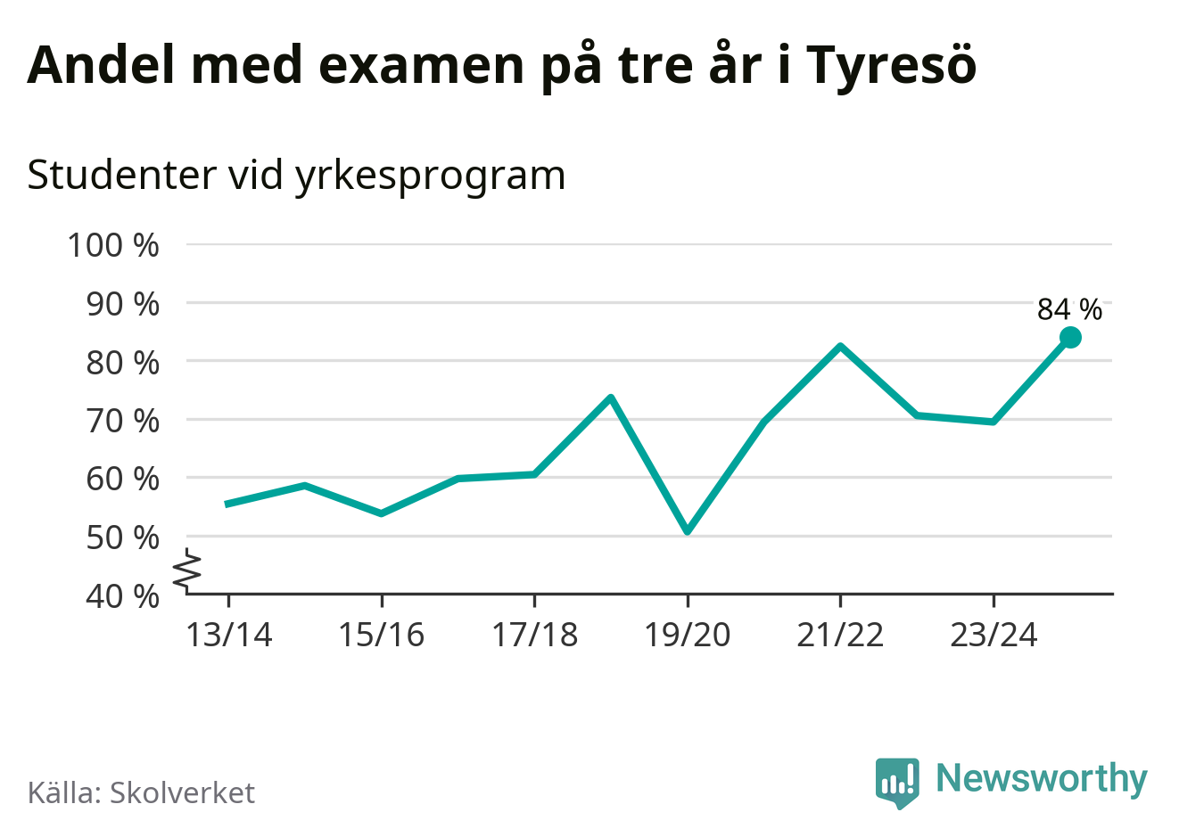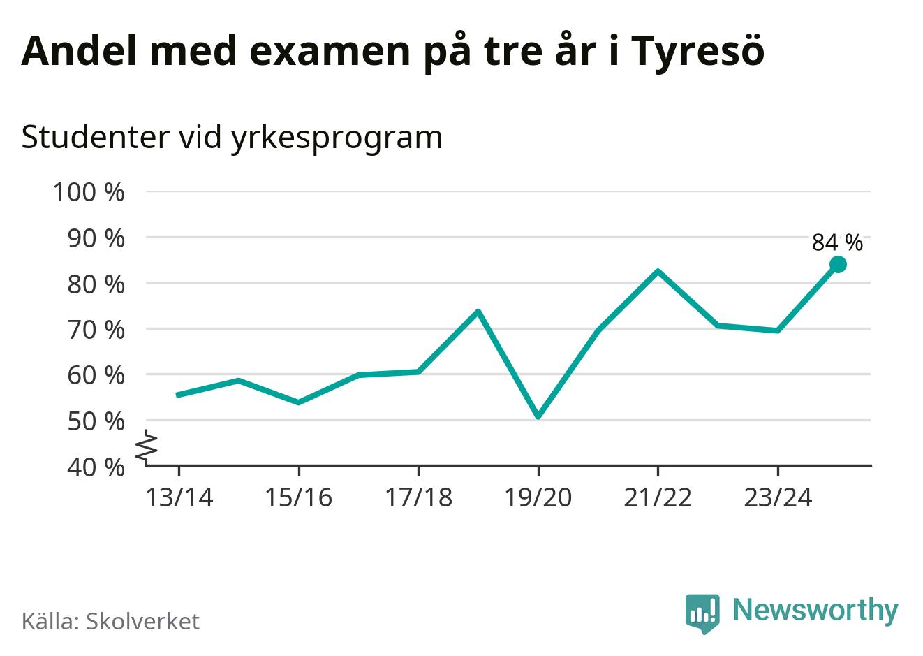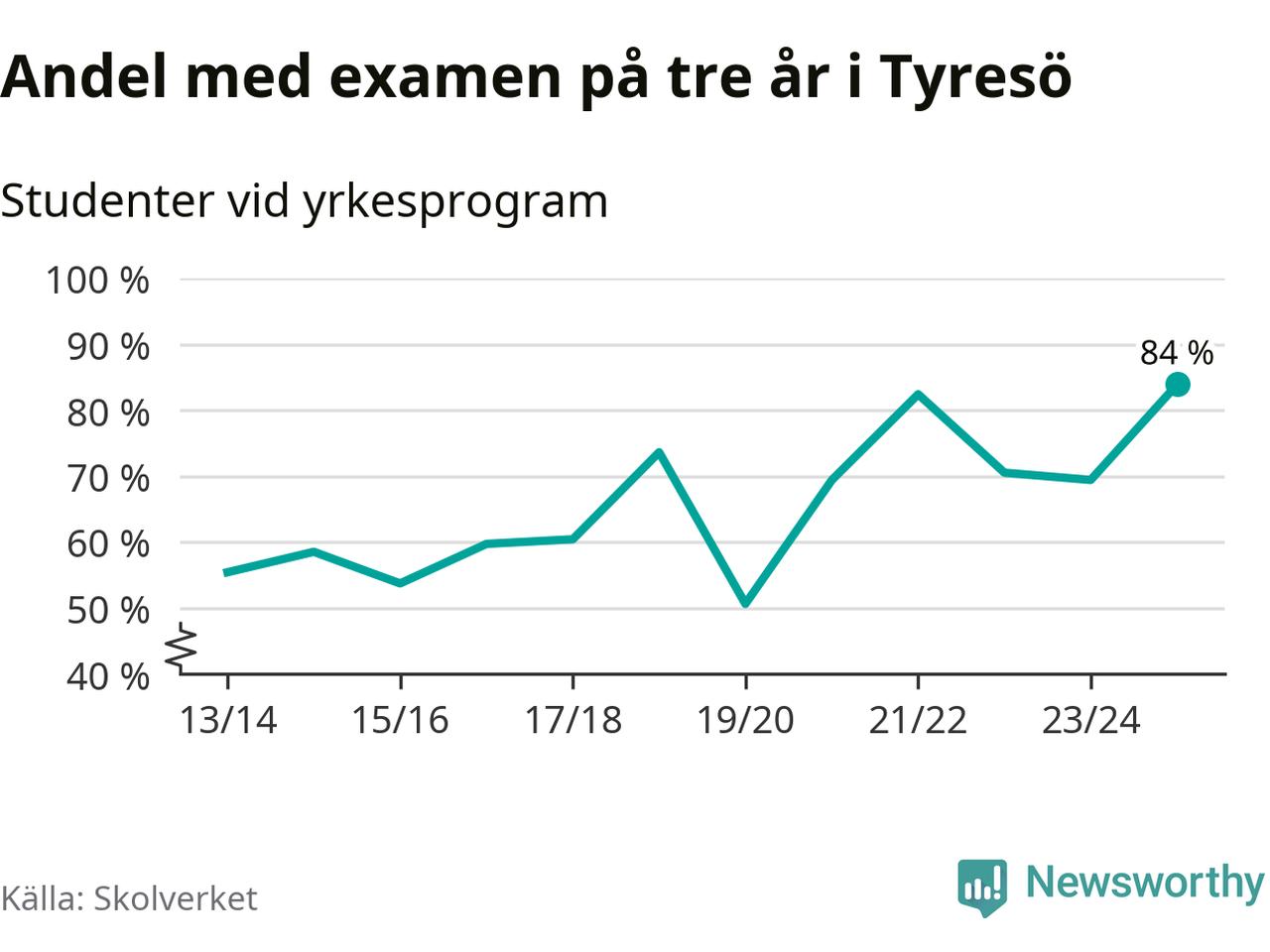 När eleverna på de yrkesförberedande programmen på Tyresö gymnasium sprang ut i våras hade 84 procent klarat gymnasieexamen på tre år. Det är 15 procentenheter fler än året innan och den högsta andelen sedan åtminstone läsåret 2013/14.