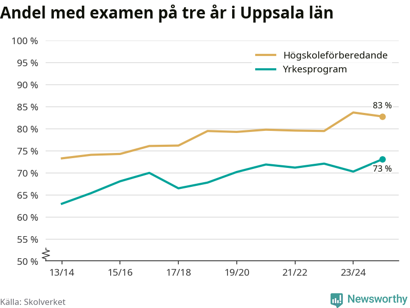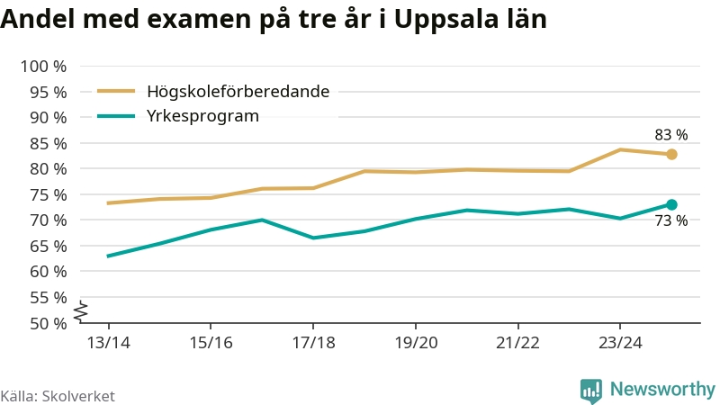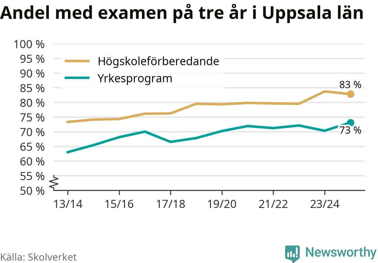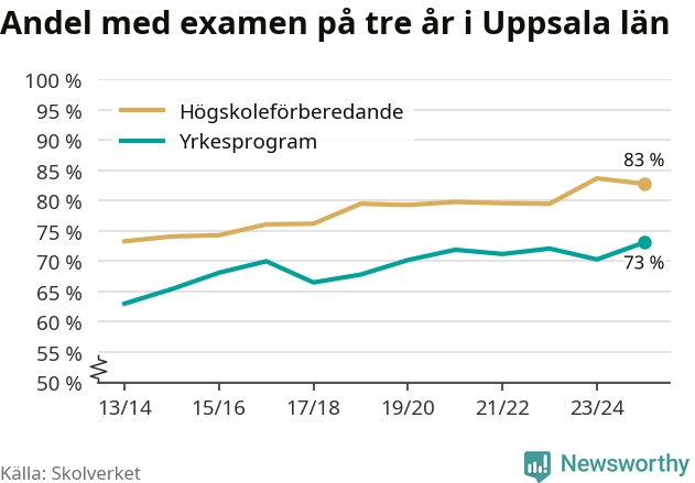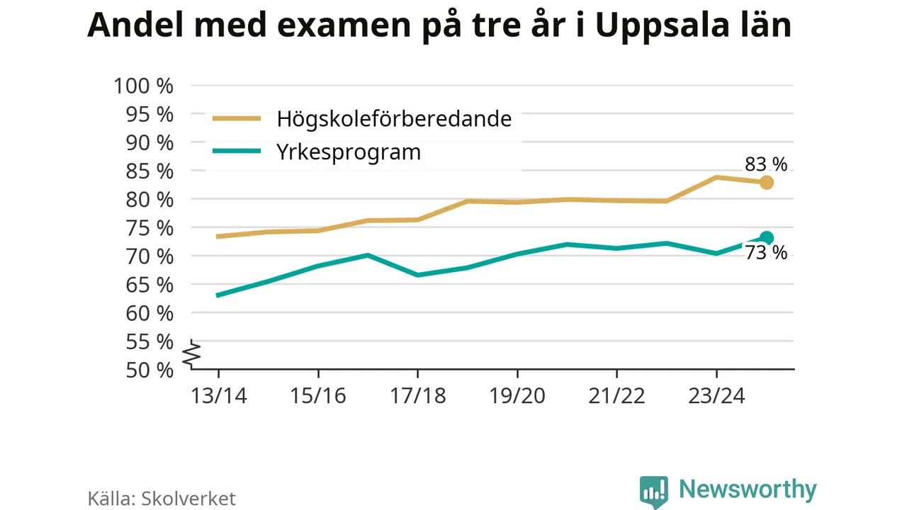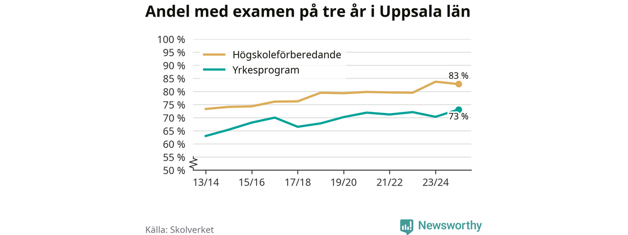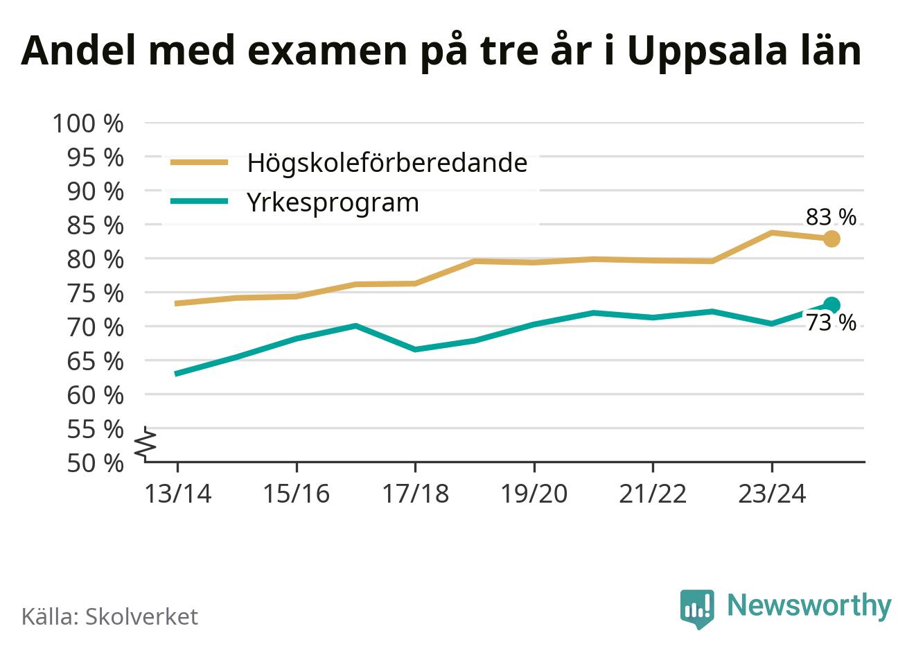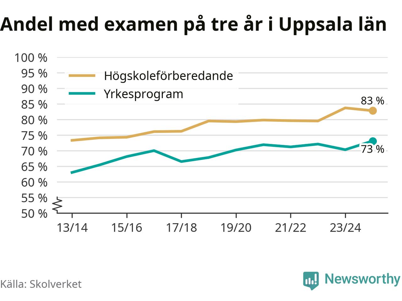 Inte sedan åtminstone läsåret 2013/14 har andelen elever som klarat gymnasieexamen på yrkesprogram varit högre i Uppsala län. Det visar Skolverkets senaste statistik.