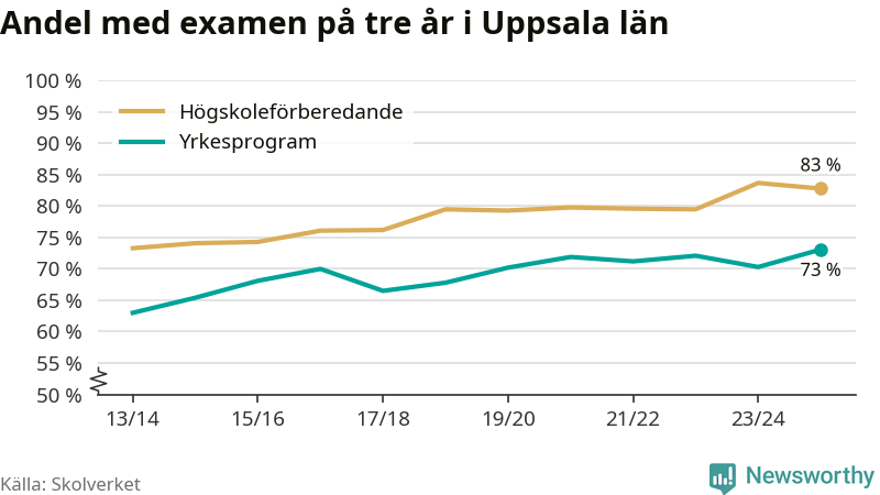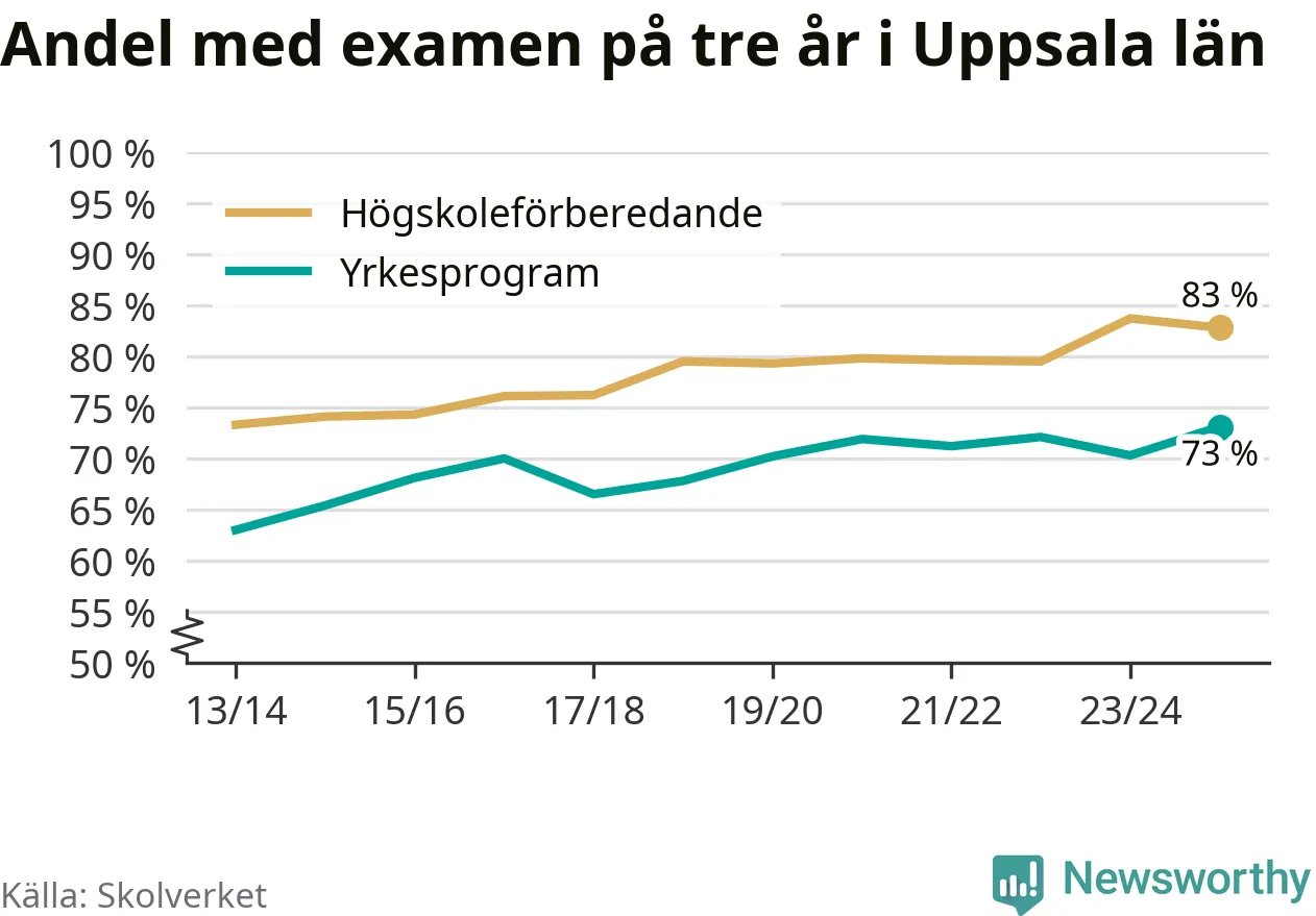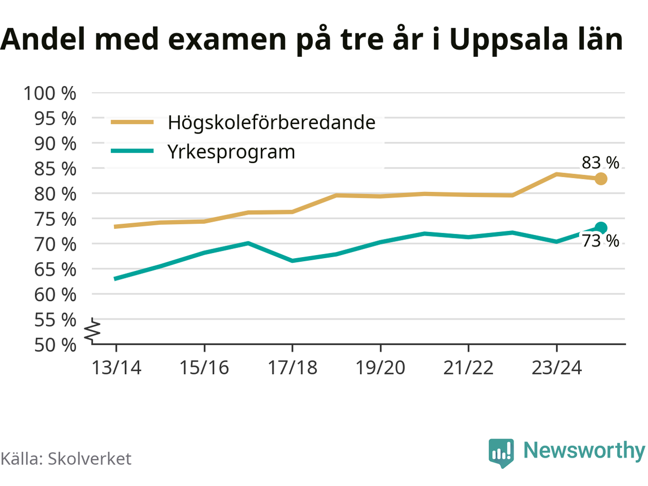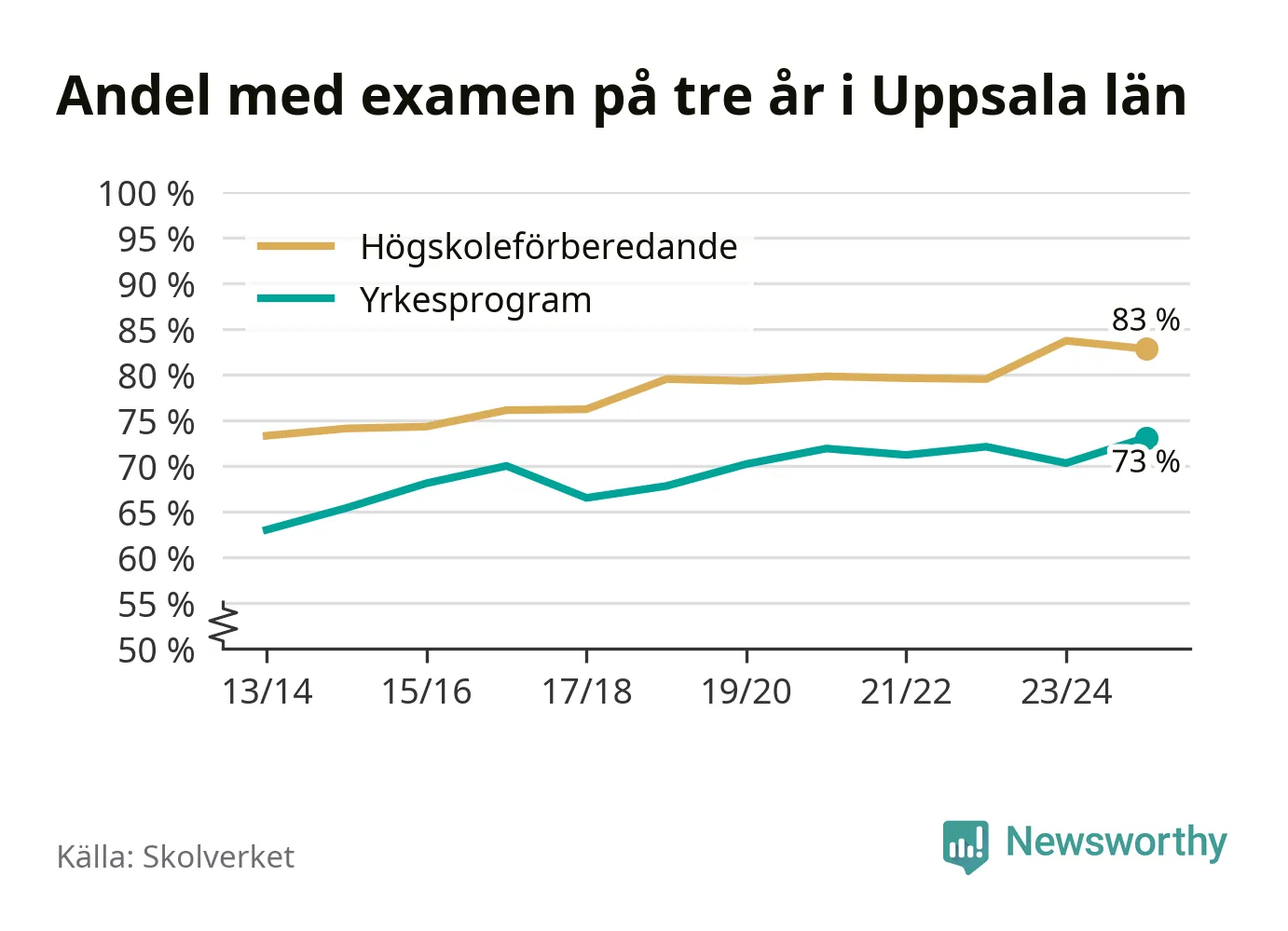 | Uppsala yrkesgymnasium Ekeby | Uppsala | 69 % (−2 %) | 77 % (+12 %) |
