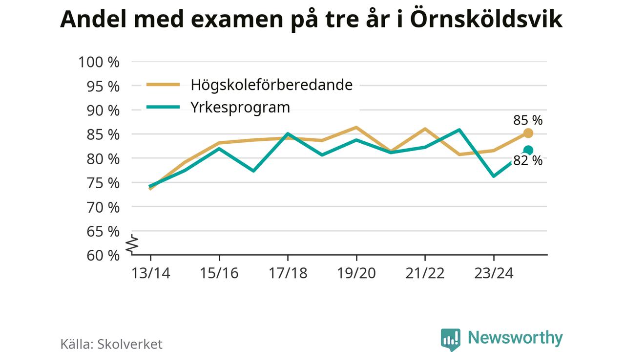 Högst andel som klarade examen i Örnsköldsviks kommun, de nationella programmen sammantaget, fanns på Örnsköldsviks Gymnasium Delta, där eleverna läser på naturvetenskapsprogrammet. Där klarade 97 procent av de 62 elever som började gymnasiet 2022/23 examen i våras. Det är en högre siffra än i riket som helhet.