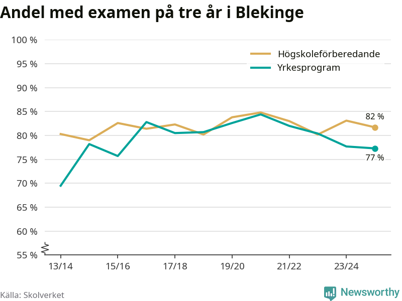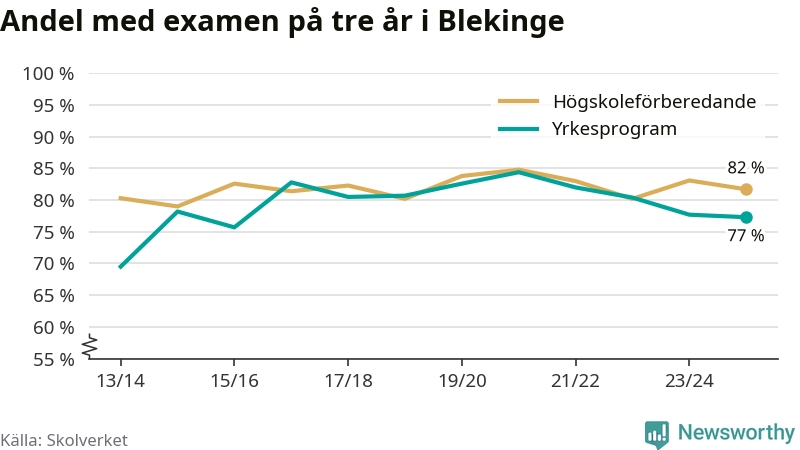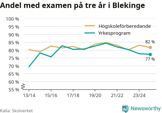 När eleverna på de yrkesförberedande programmen i Blekinge län sprang ut i våras hade 77 procent klarat gymnasieexamen på tre år. Det är en procentenhet färre än året innan och inte sedan kullen som tog studenten läsåret 2015/16 har andelen varit lägre.