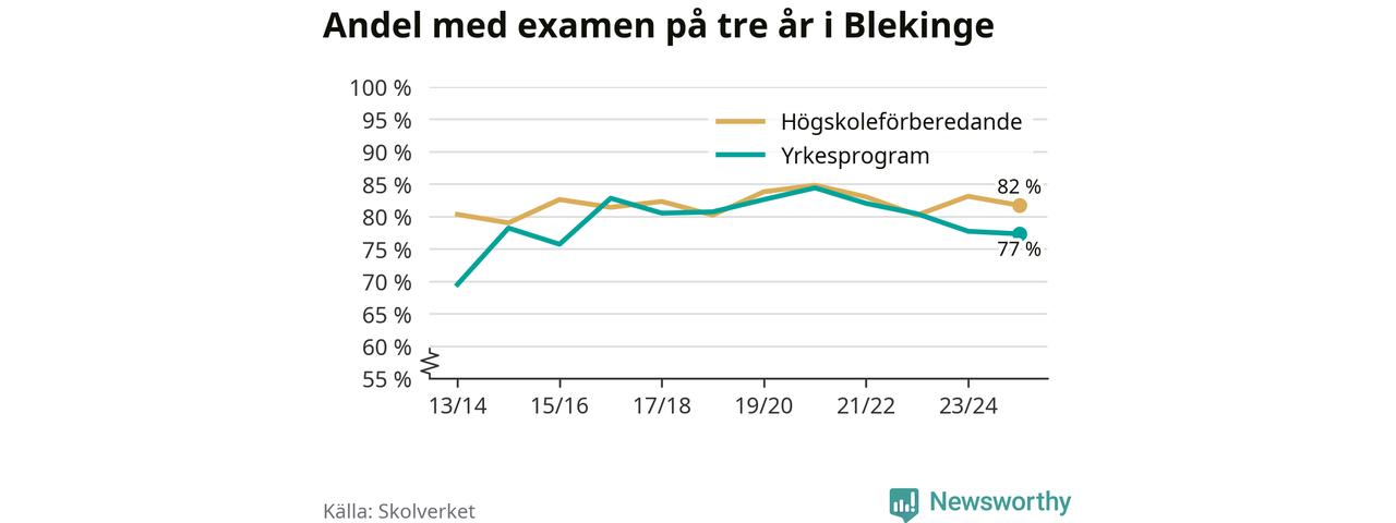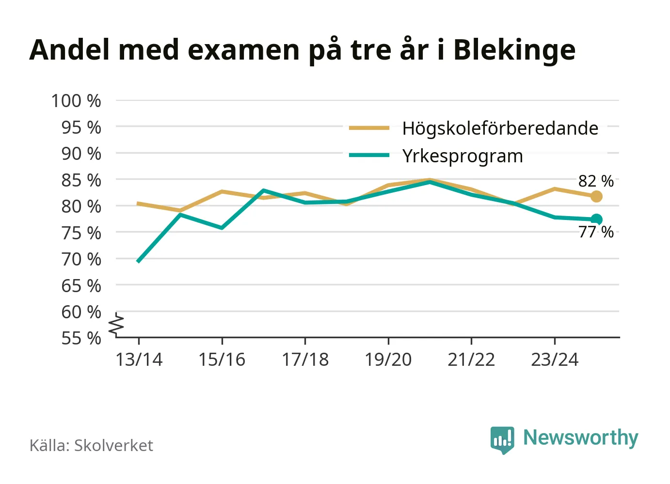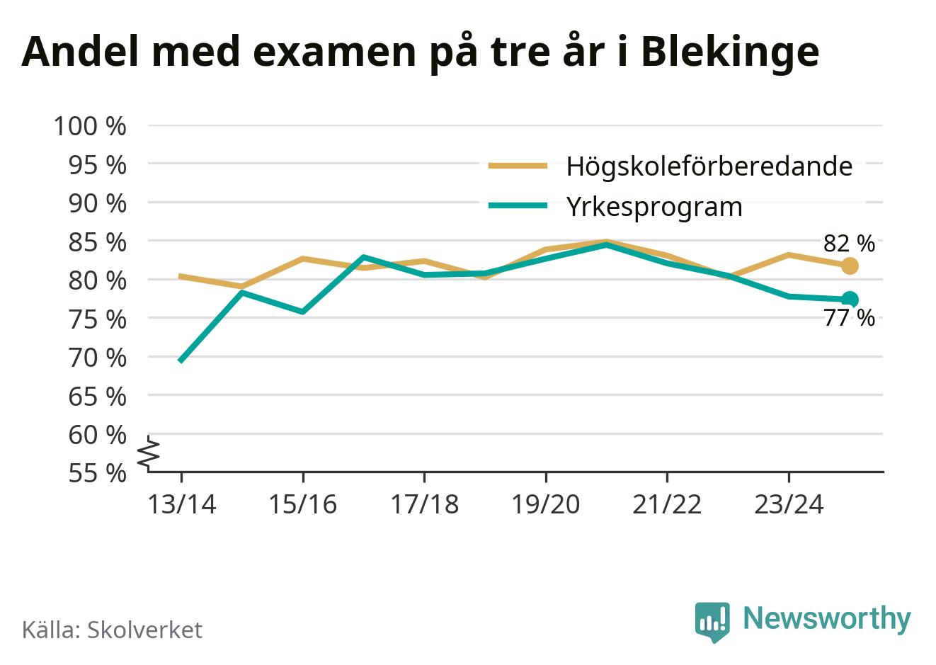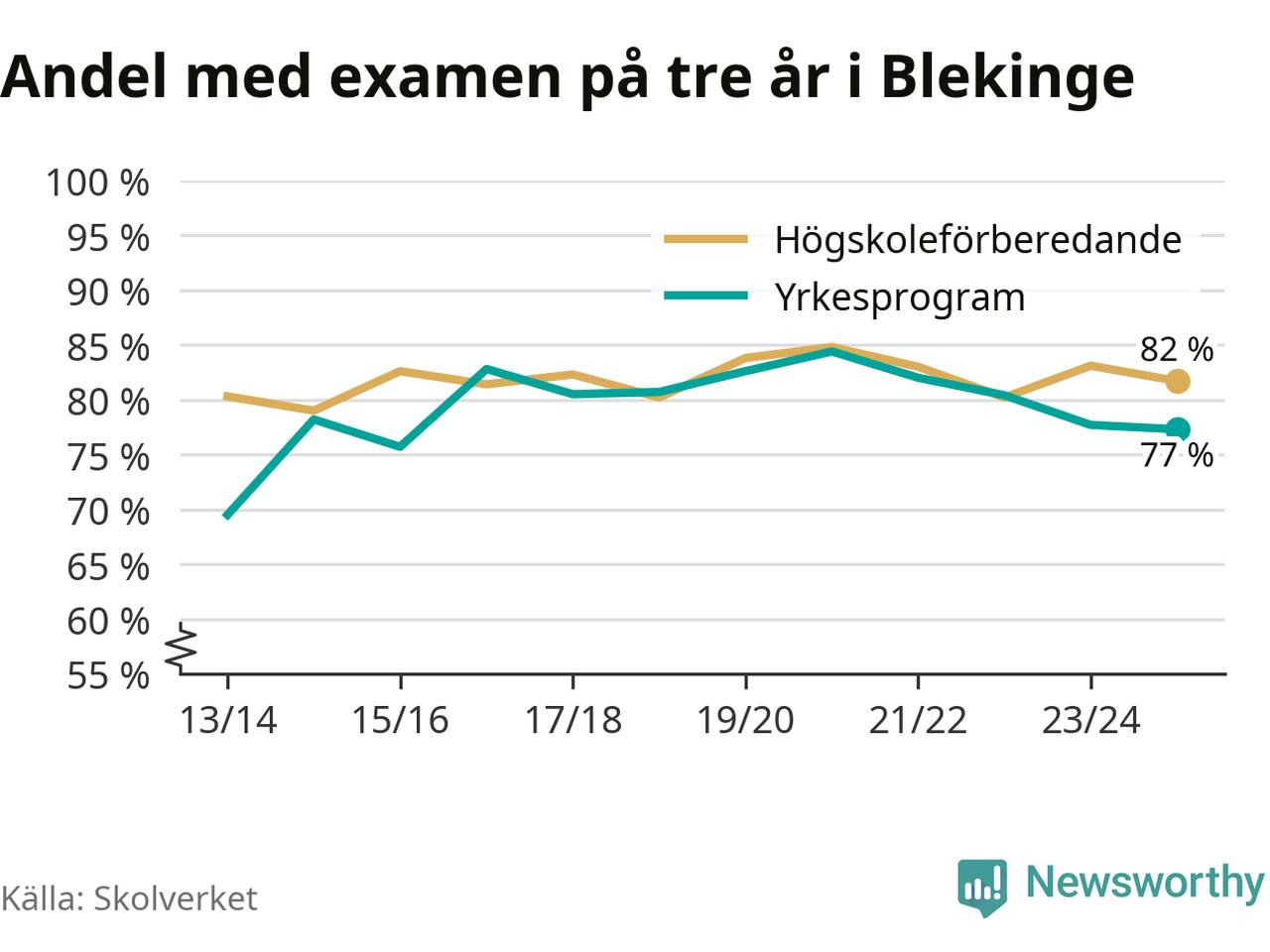 Andelen elever på yrkesprogrammen som klarade gymnasieexamen ökade i Sverige i fjol. Så gick det på gymnasieskolorna i Blekinge.