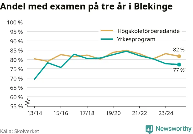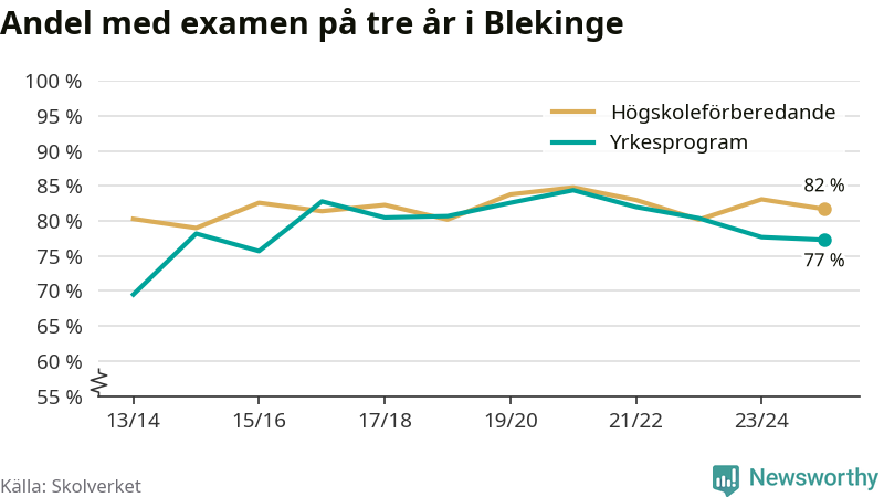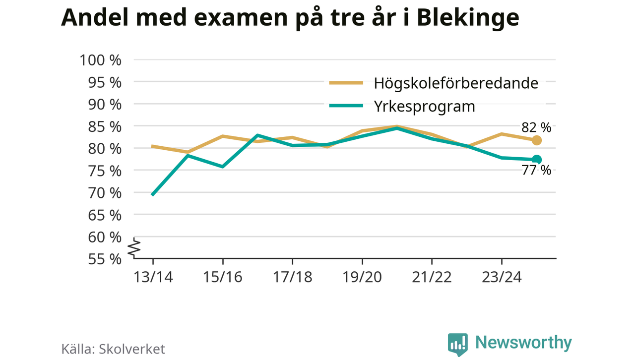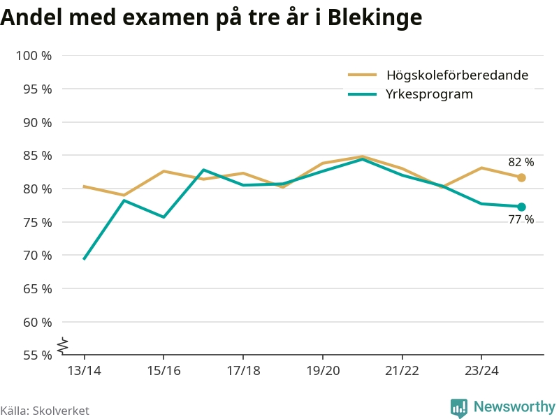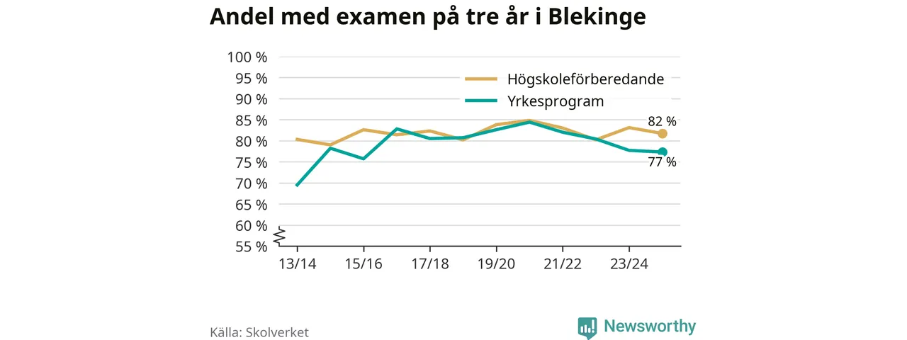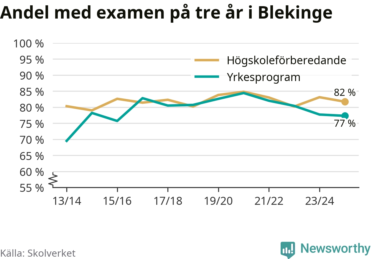 Andelen elever på yrkesprogrammen som klarade gymnasieexamen ökade i Sverige i fjol. Så gick det på gymnasieskolorna i Blekinge.
