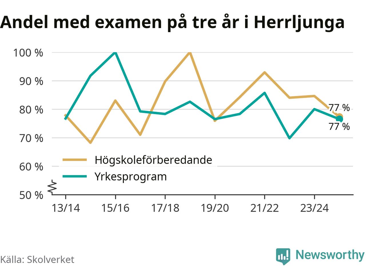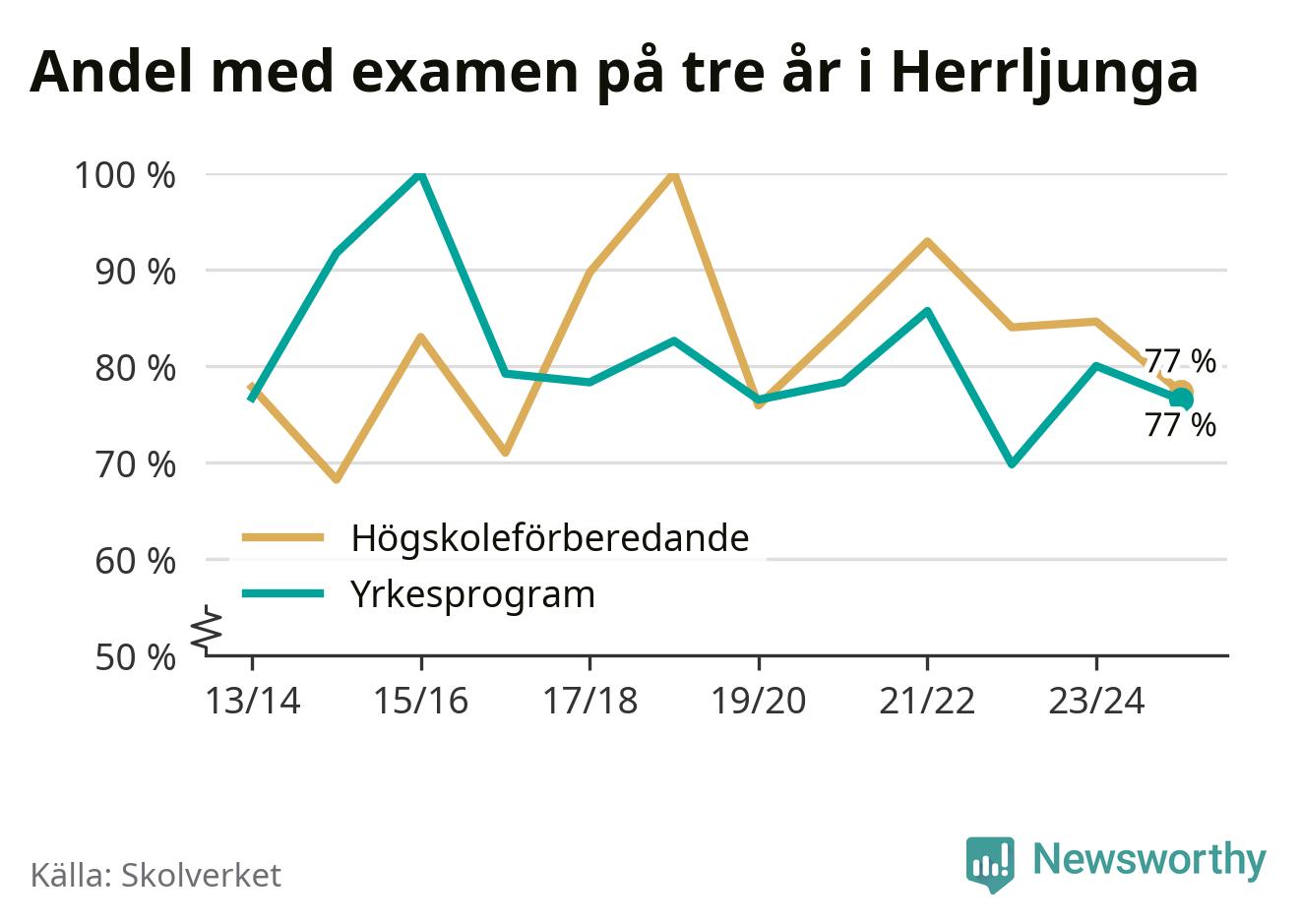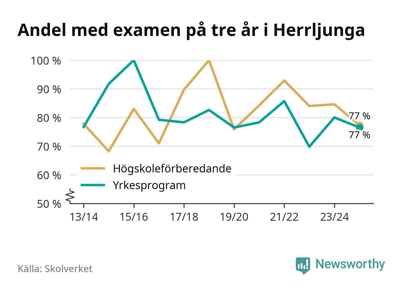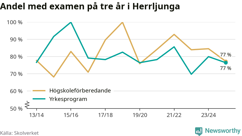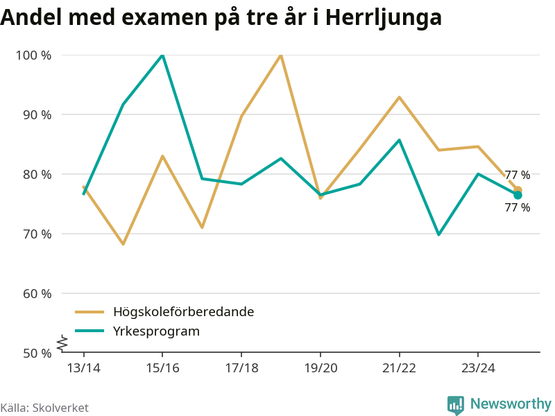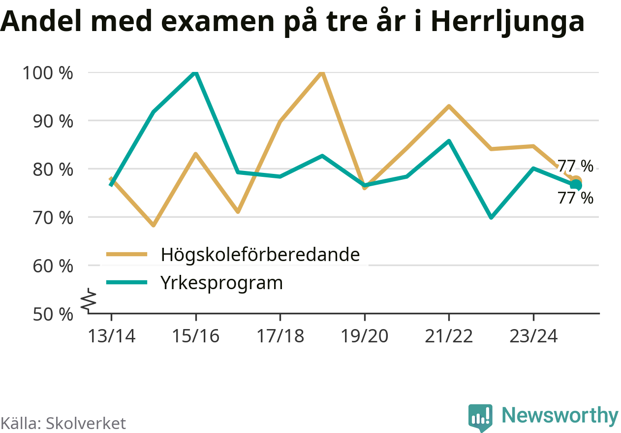 Bland deras kamrater på högskoleförberedande program hade 77 procent klarat examen på tre år – vilket är åtta procentenheter mindre än året innan. Inte sedan kullen som tog studenten läsåret 2019/20 har andelen varit lägre.