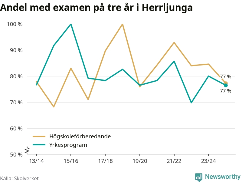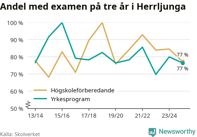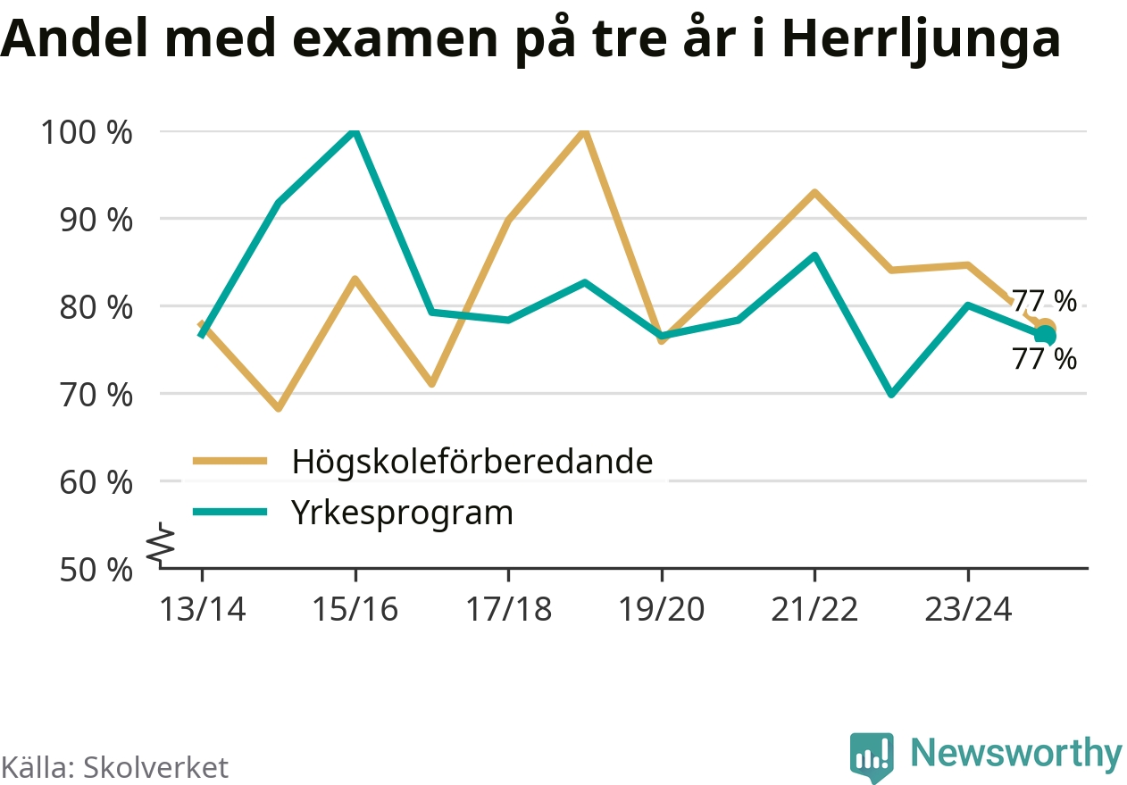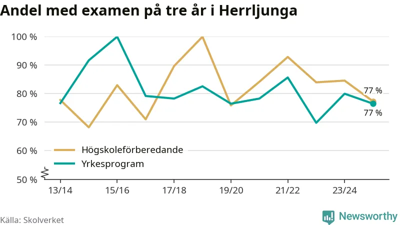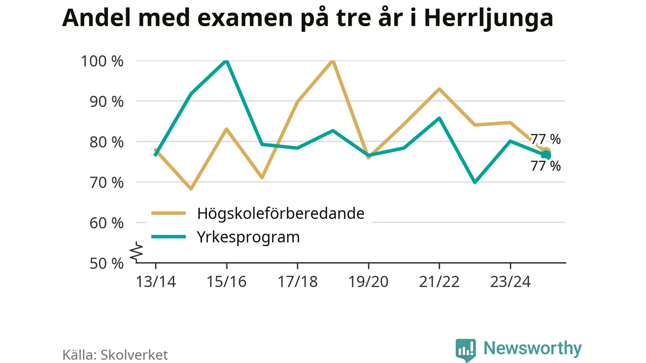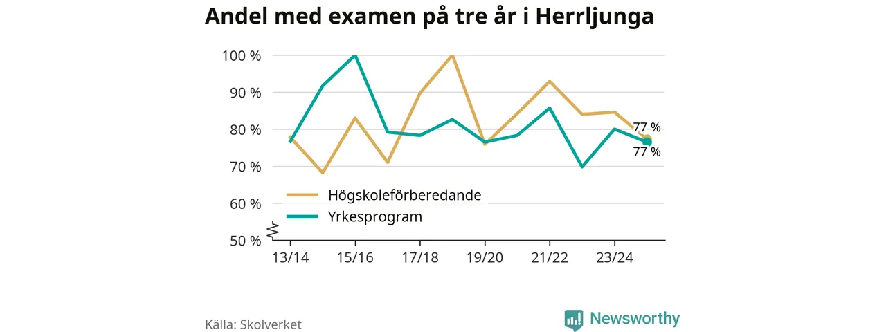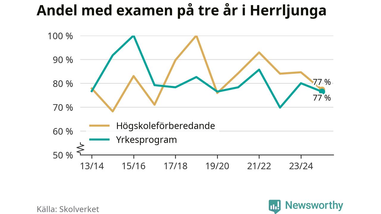 Andelen elever som klarade examen på tre år på gymnasieskolan i Herrljunga minskade förra läsåret. Det visar Skolverkets statistik. Därmed går Herrljungastudenterna mot strömmen jämfört med riket som helhet.