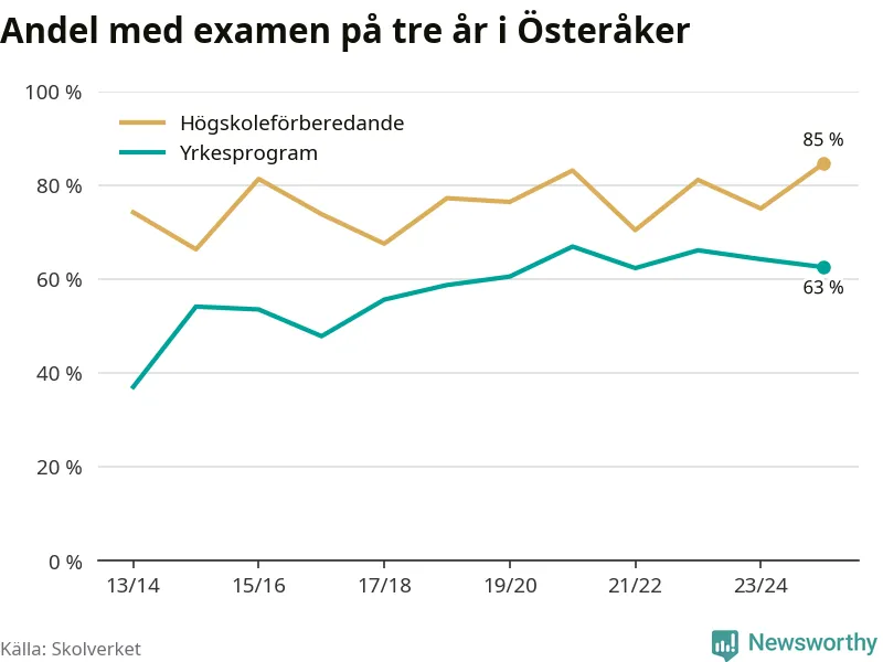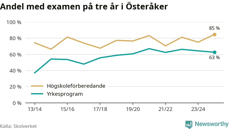 Bland deras kamrater på högskoleförberedande program hade 85 procent klarat examen på tre år – vilket är tio procentenheter mer än året innan. Det är den högsta andelen sedan åtminstone läsåret 2013/14.
