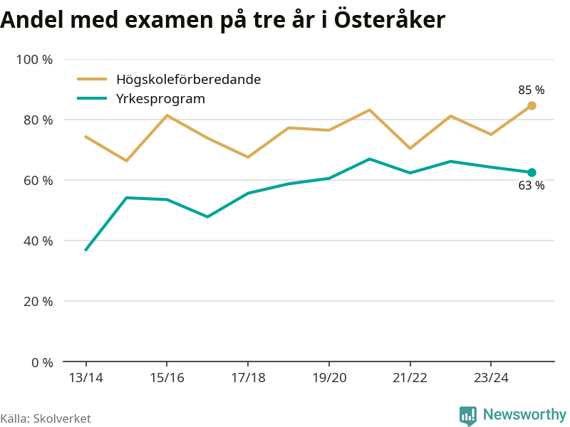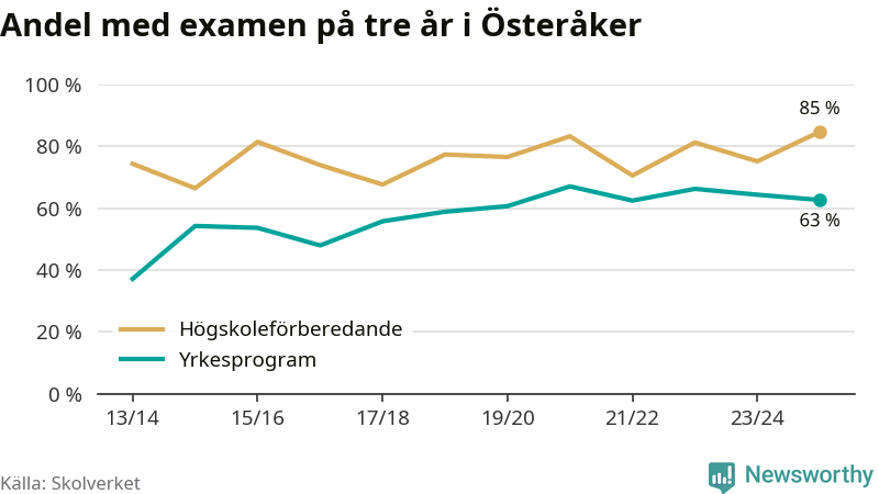 Inte sedan åtminstone läsåret 2013/14 har andelen elever som klarat gymnasieexamen på högskoleförberedande program varit högre i Österåker. Det visar Skolverkets senaste statistik.