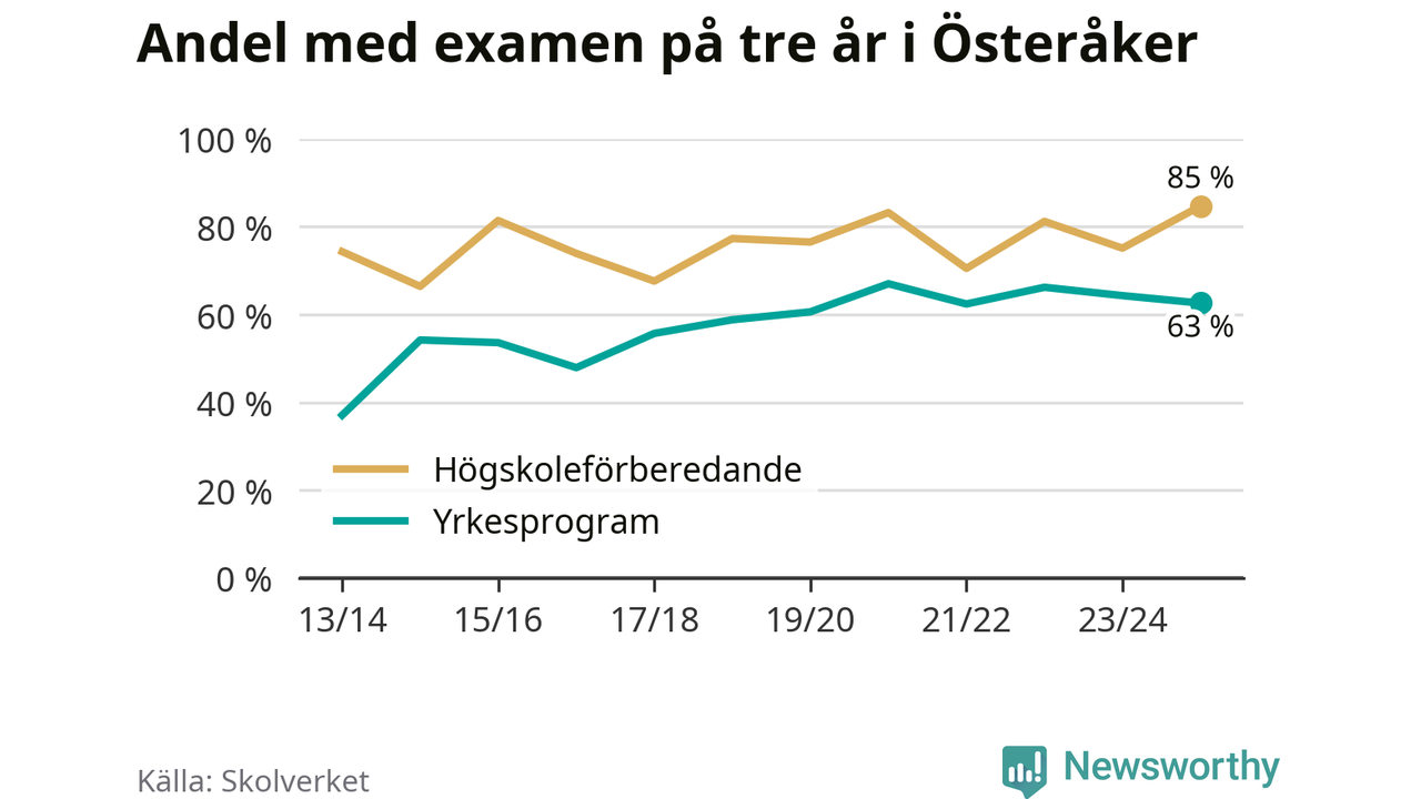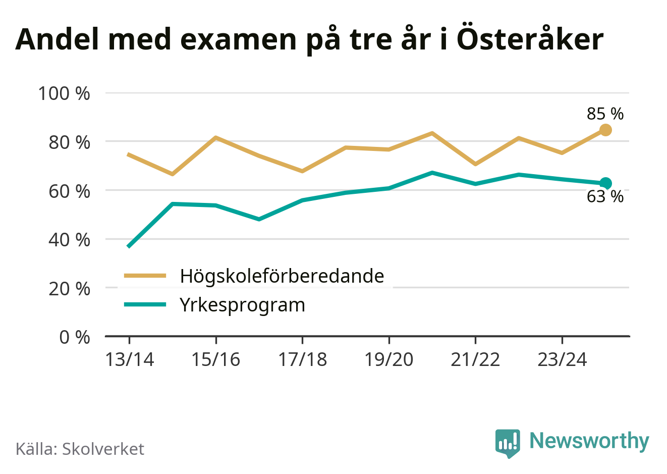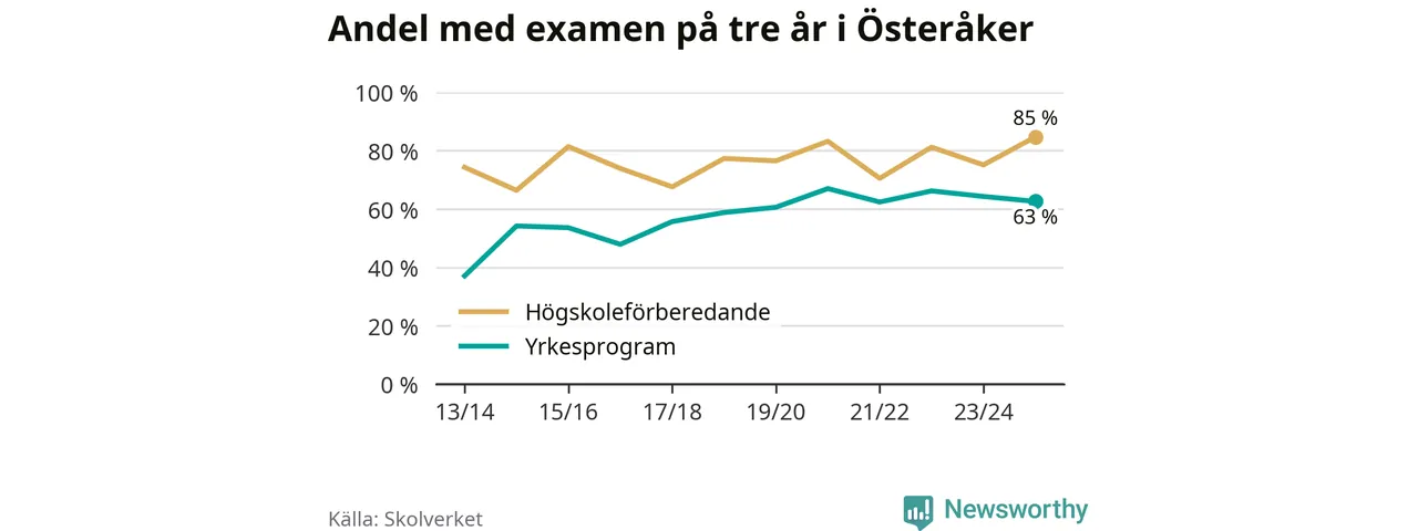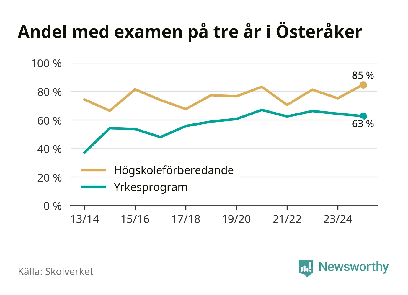 På Österåkers gymnasium klarade 85 procent av de 177 eleverna som började gymnasiet 2022/23 examen i våras. Det är en högre siffra än i riket som helhet. På Skärgårdsgymnasiet var motsvarande siffra 63 procent.