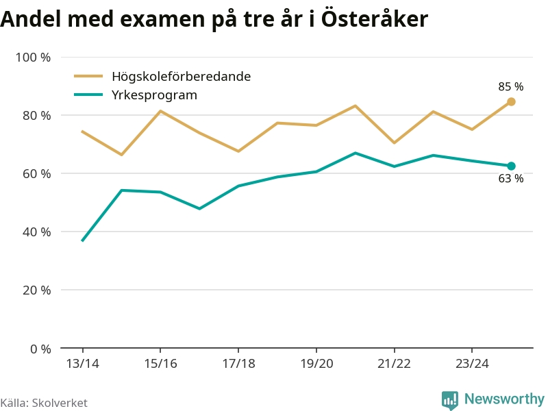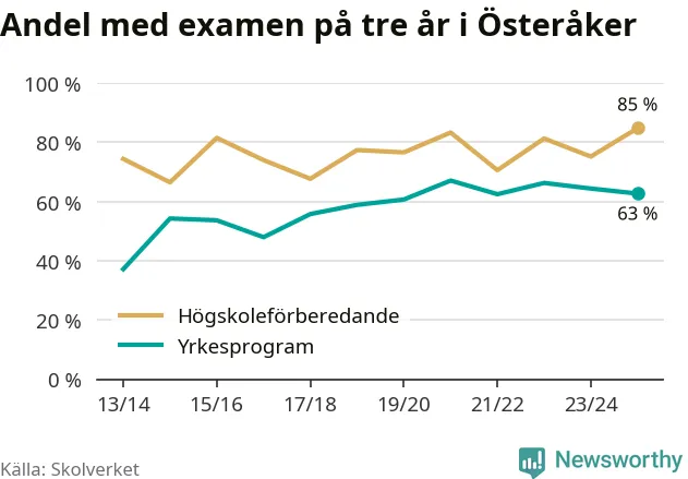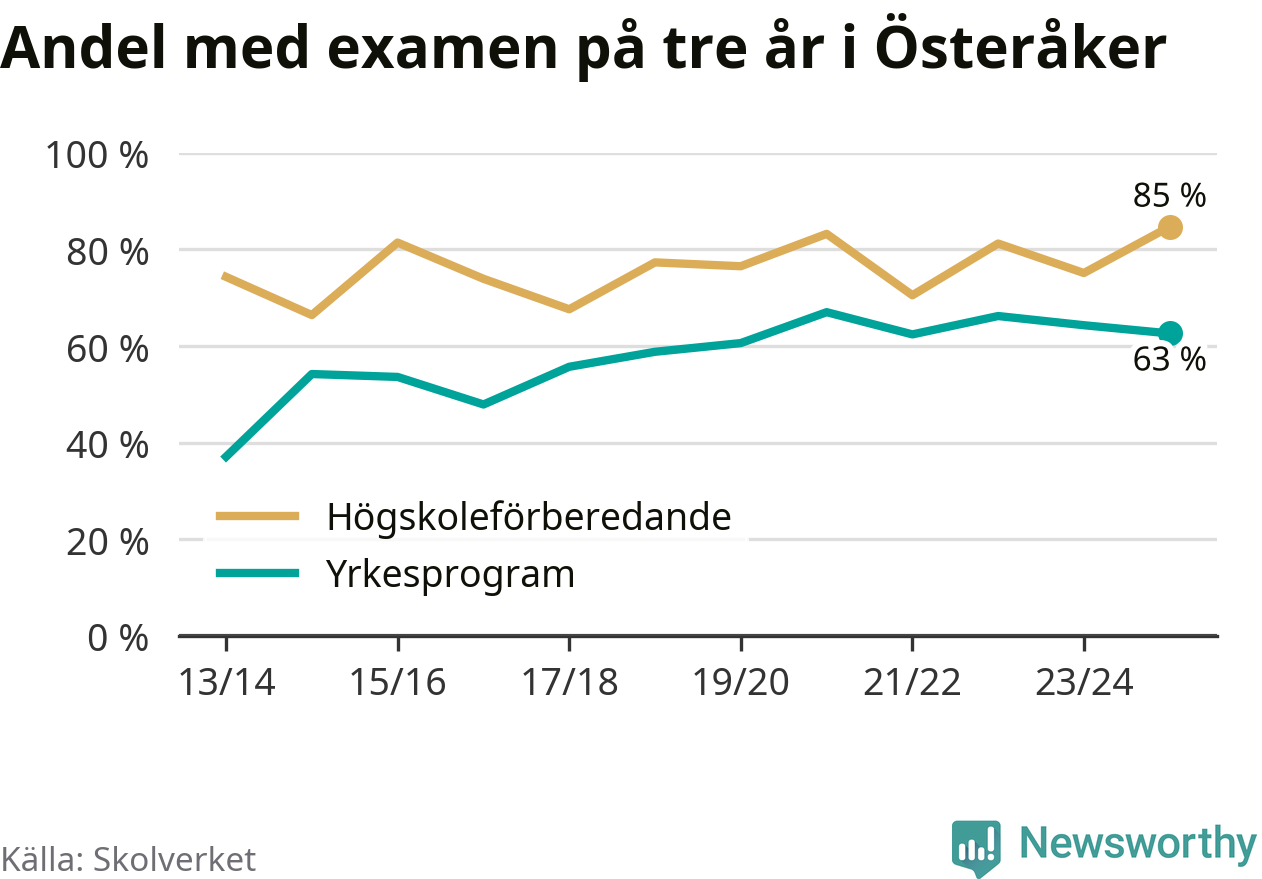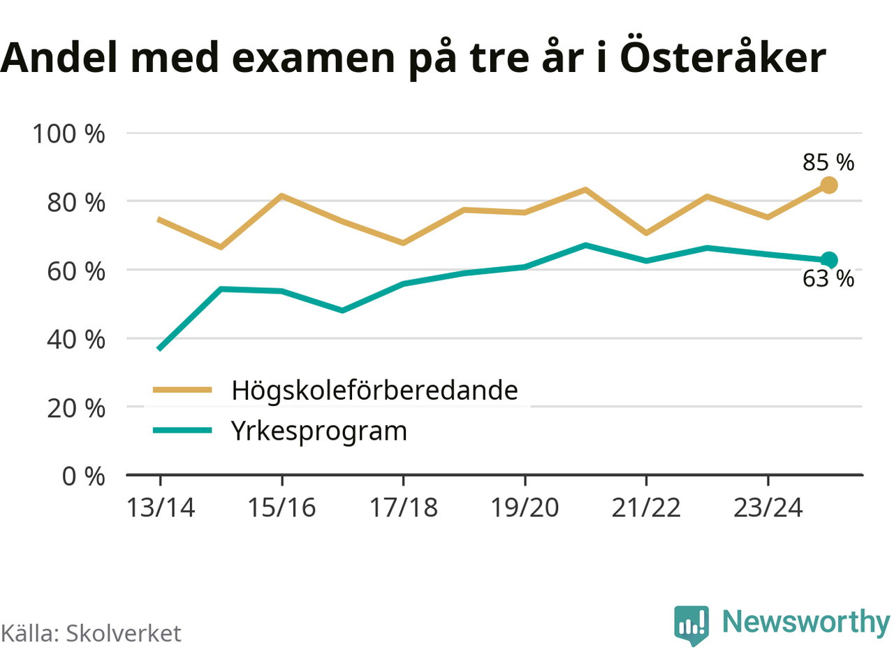 På Österåkers gymnasium klarade 85 procent av de 177 eleverna som började gymnasiet 2022/23 examen i våras. Det är en högre siffra än i riket som helhet. På Skärgårdsgymnasiet var motsvarande siffra 63 procent.