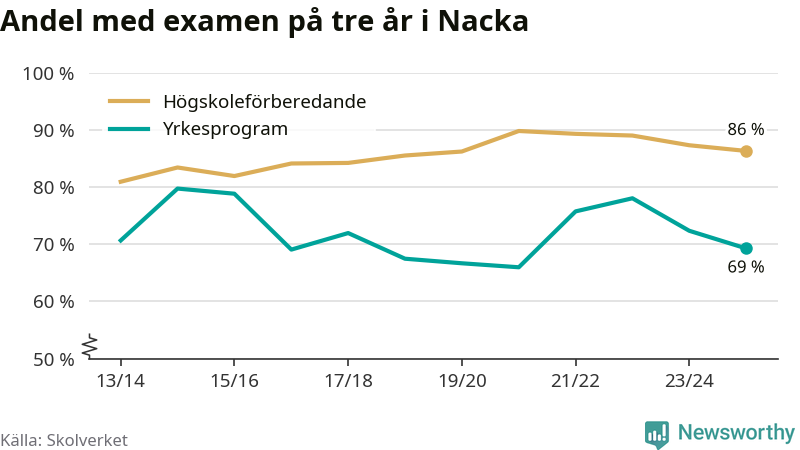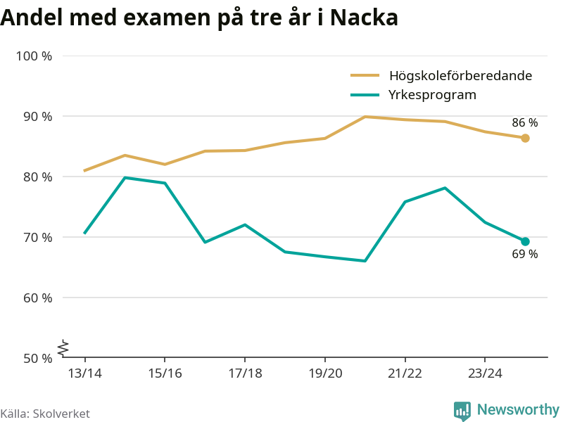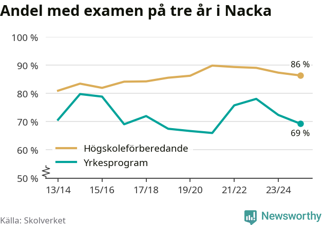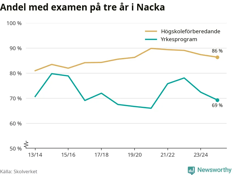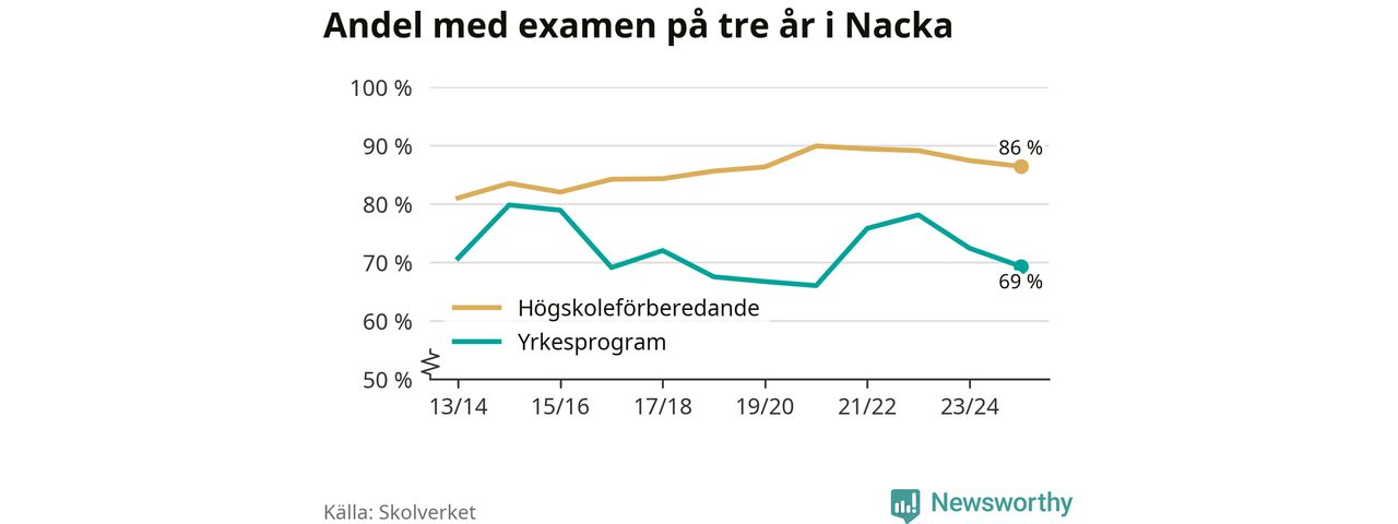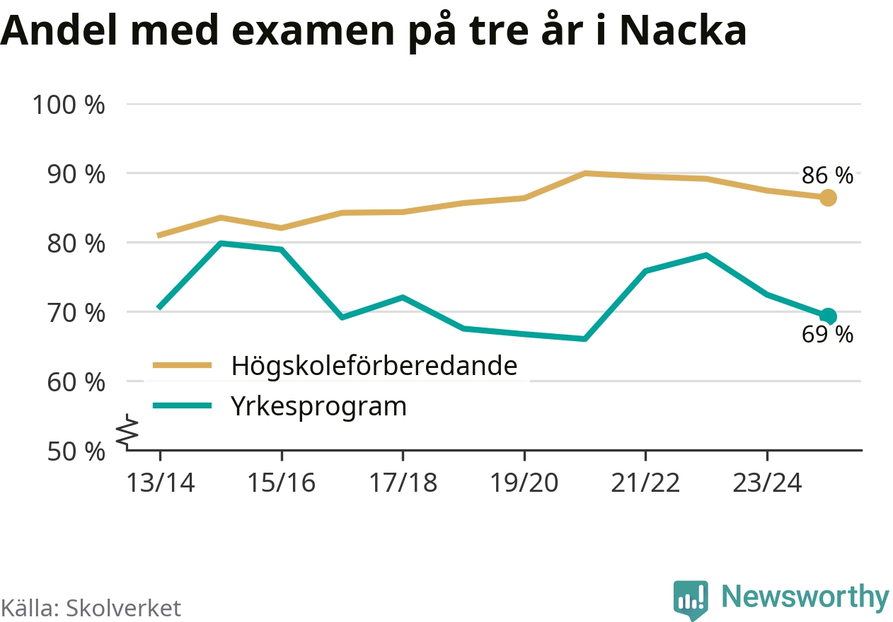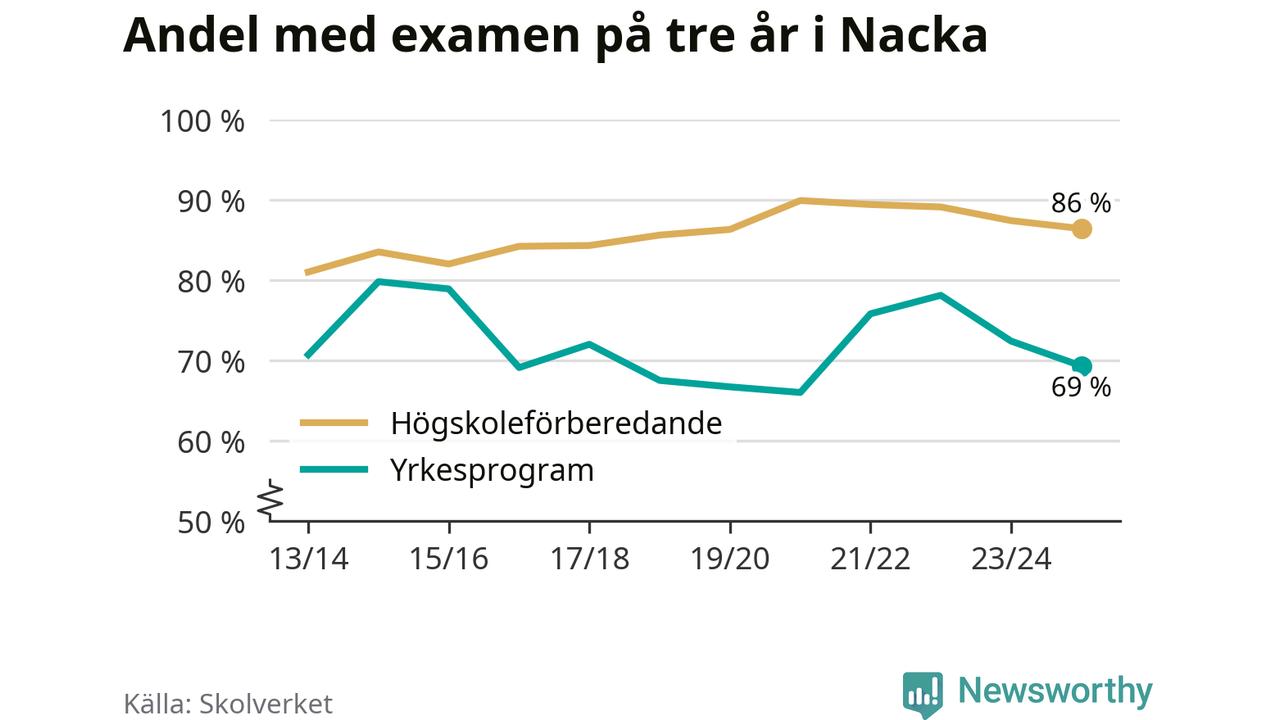 Medan andelen elever som klarade gymnasieexamen på yrkesprogram på tre år ökade i riket som helhet, minskade andelen i Nacka något. Här är resultaten – skola för skola.