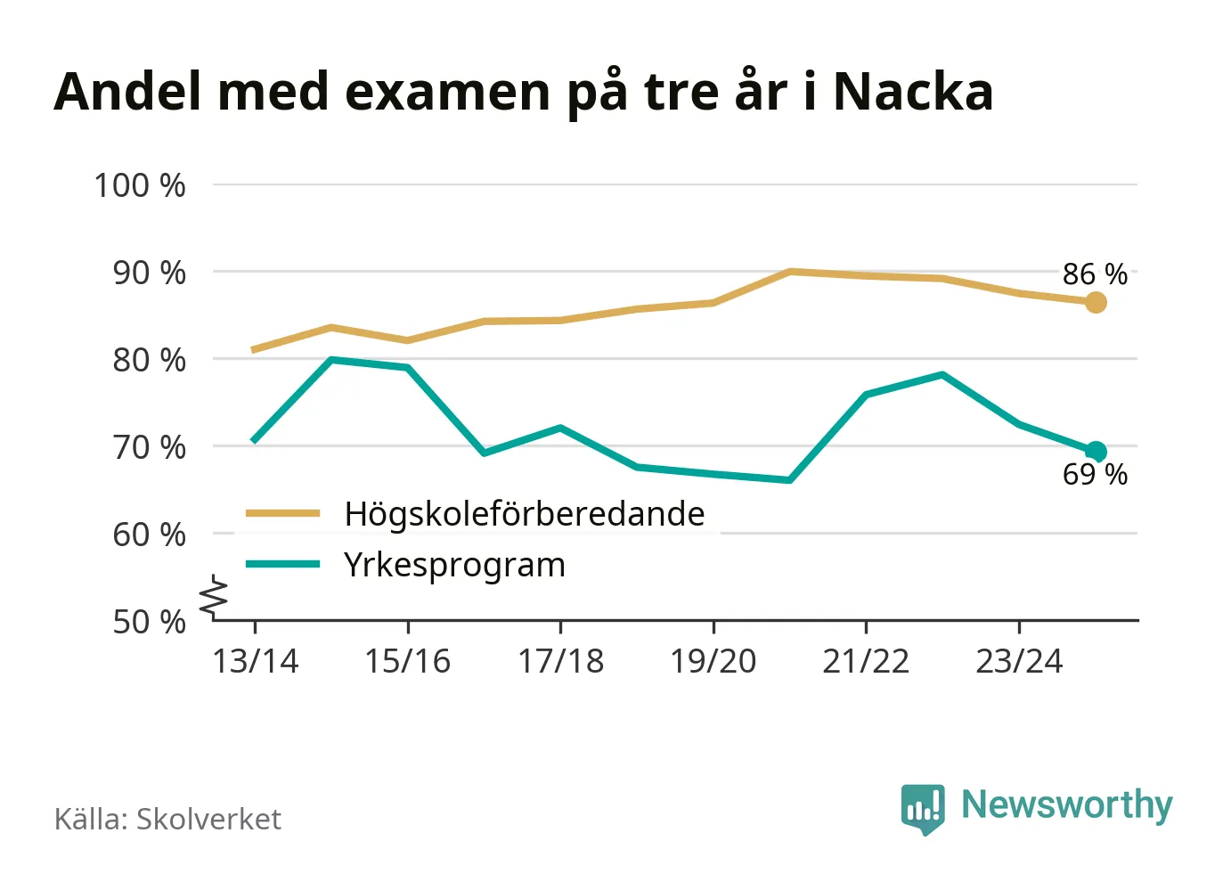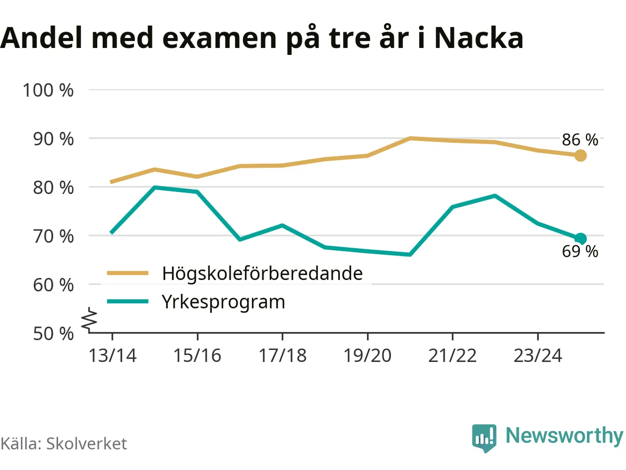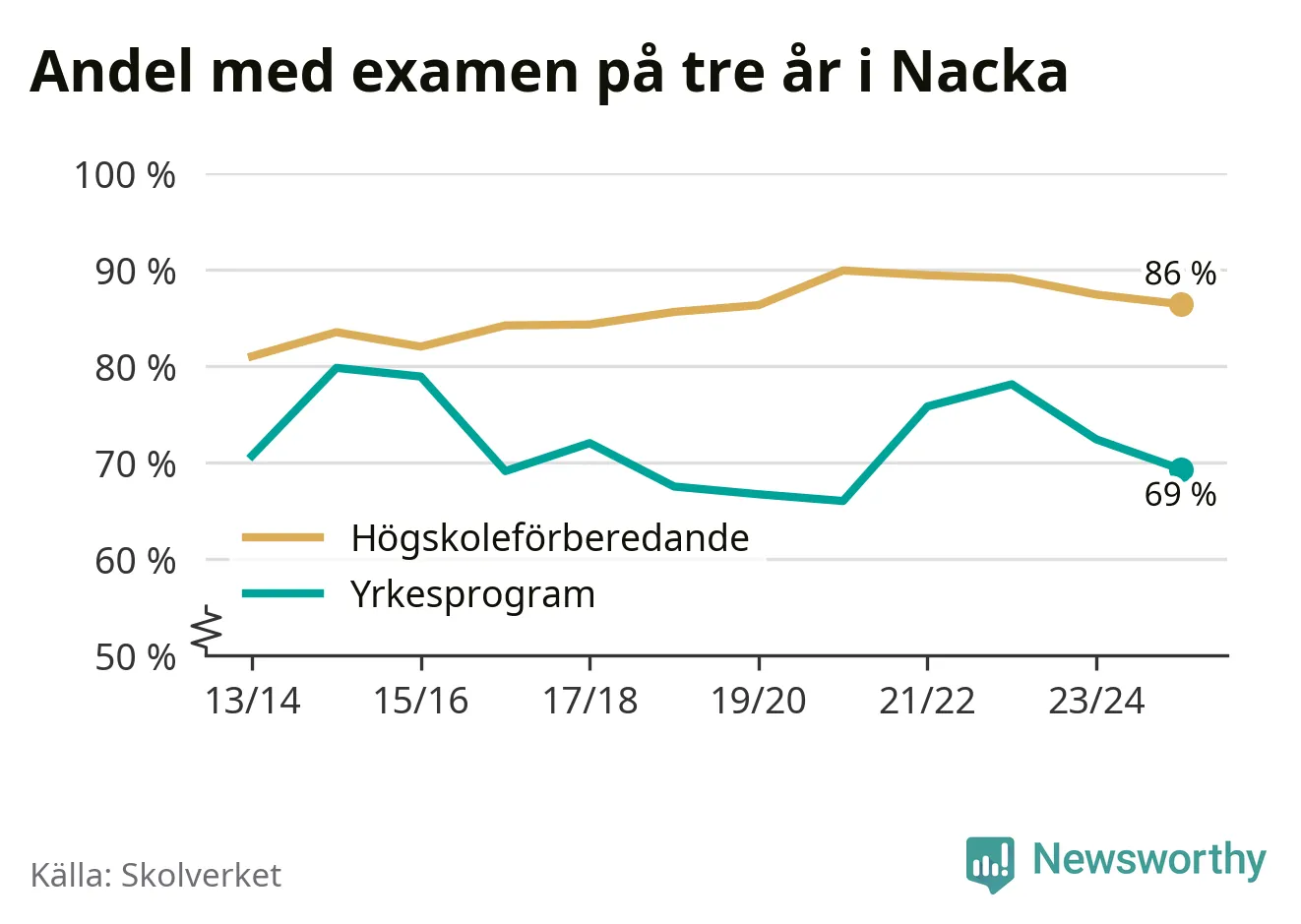 Bland deras kamrater på högskoleförberedande program hade 86 procent klarat examen på tre år – vilket är en procentenhet mindre än året innan. Inte sedan kullen som tog studenten läsåret 2019/20 har andelen varit lägre.