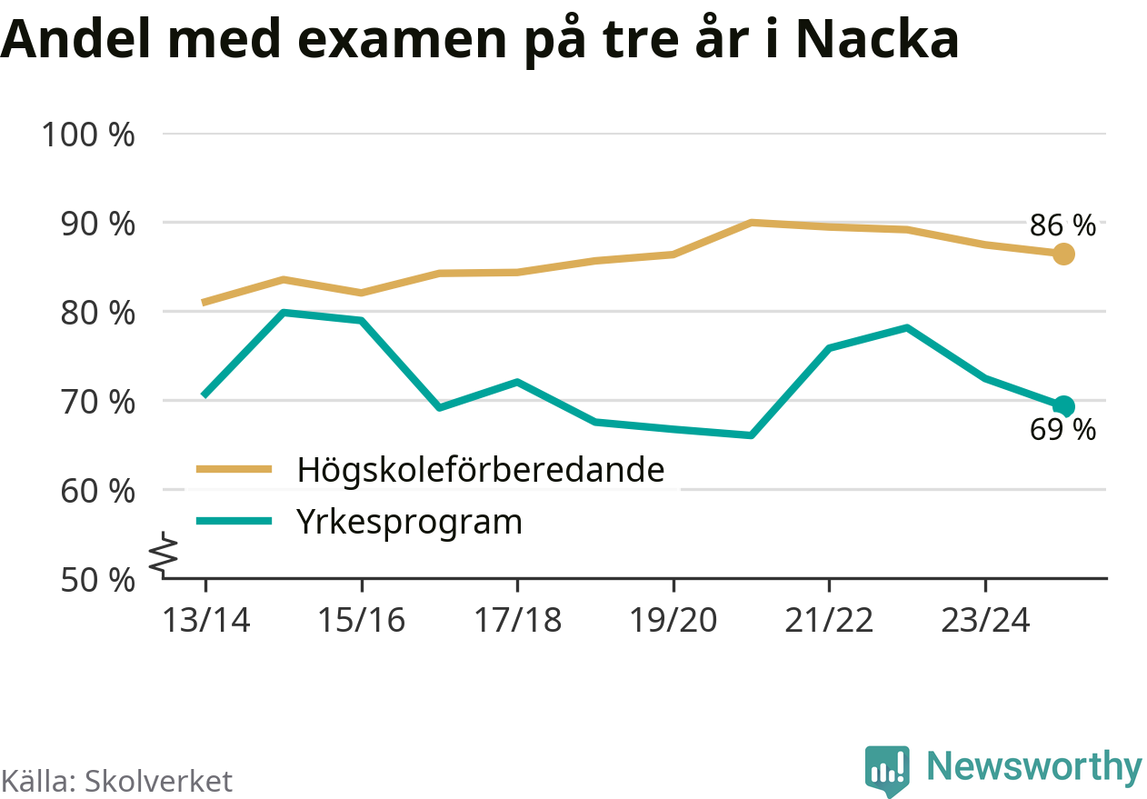 När eleverna på de yrkesförberedande programmen i Nacka kommun sprang ut i våras hade 69 procent klarat gymnasieexamen på tre år. Det är tre procentenheter färre än året innan.