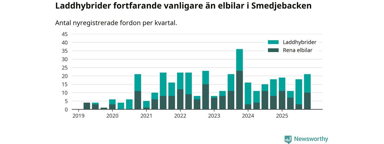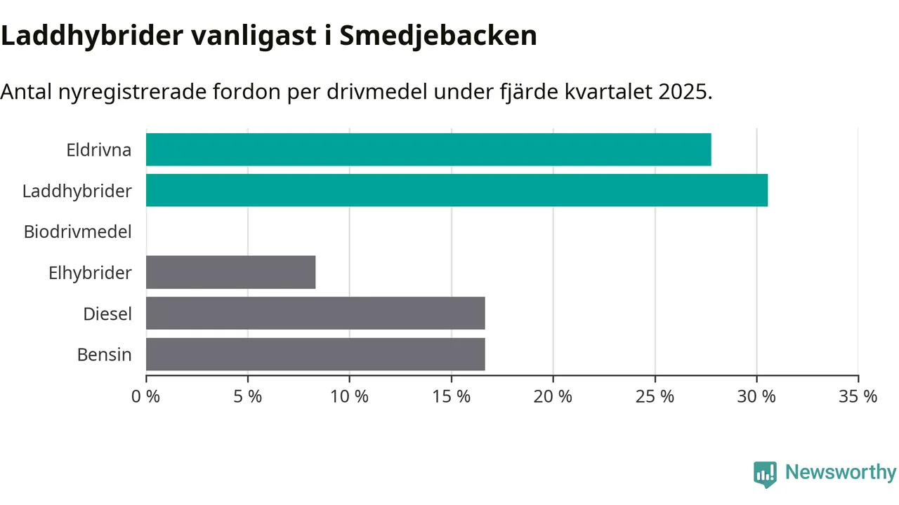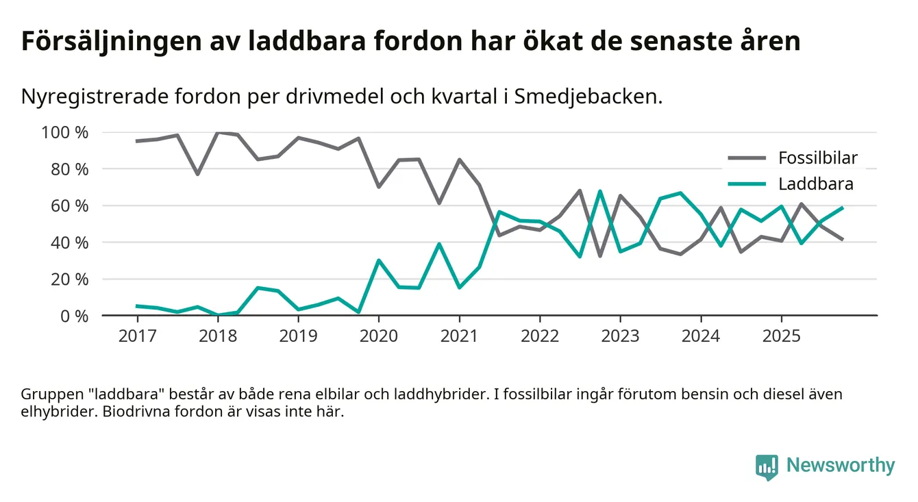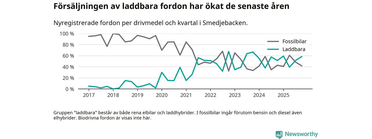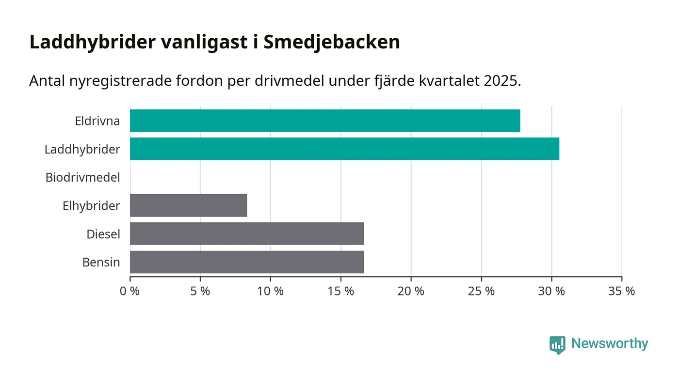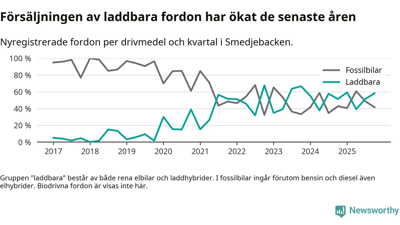 Under fjärde kvartalet 2025 var 58 procent av alla nyregistrerade personbilar i Smedjebacken laddbara (sammanlagt registrerades 36 nya bilar). Merparten av de laddbara bilarna var så kallade laddhybrider, det vill säga fordon som går att ladda och köra på el, men som även har en förbränningsmotor. 28 procent av alla nya bilar var rena elbilar.