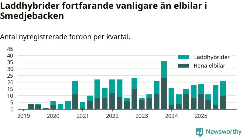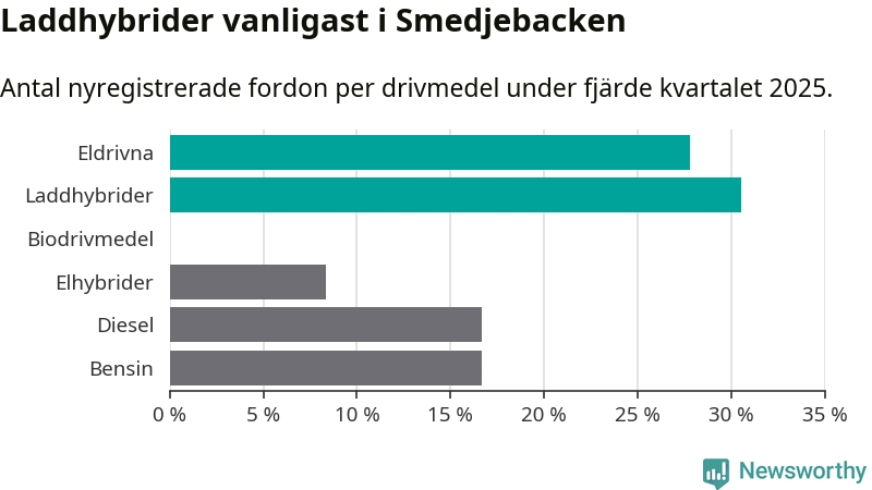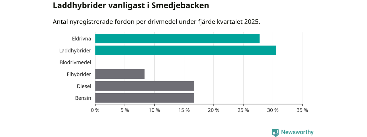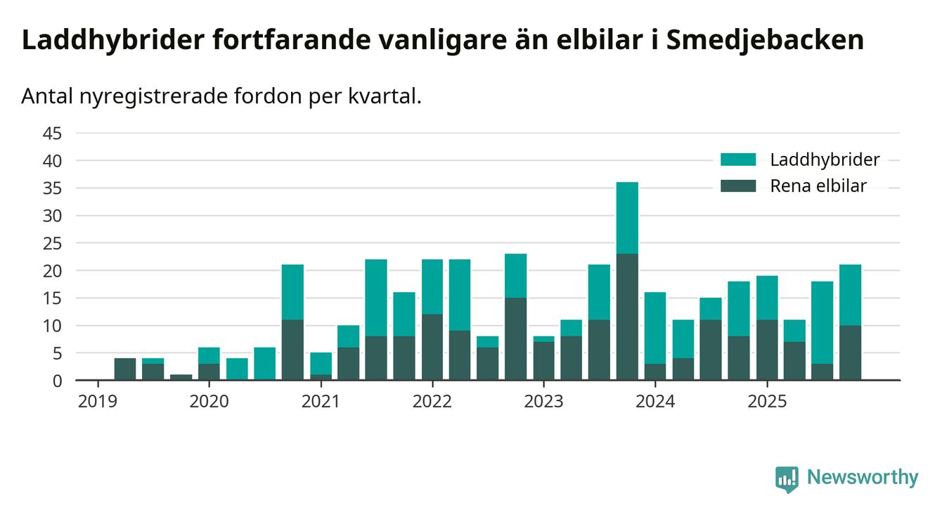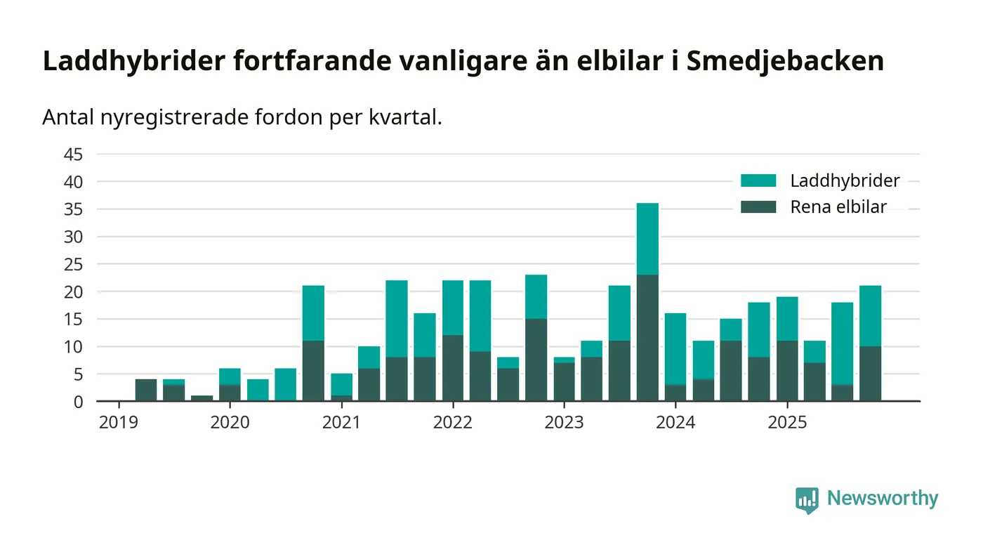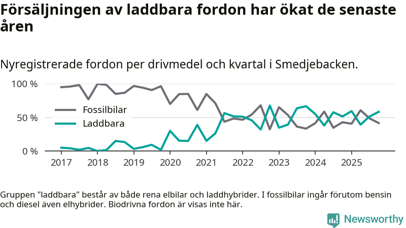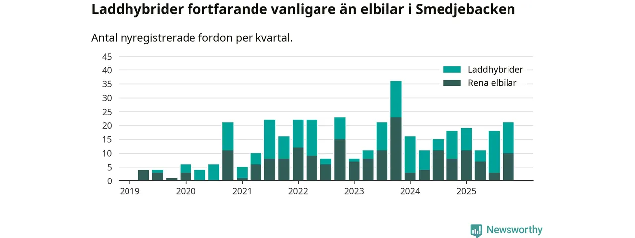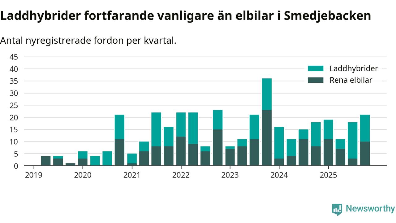 Under fjärde kvartalet 2025 var 58 procent av alla nyregistrerade personbilar i Smedjebacken laddbara (sammanlagt registrerades 36 nya bilar). Merparten av de laddbara bilarna var så kallade laddhybrider, det vill säga fordon som går att ladda och köra på el, men som även har en förbränningsmotor. 28 procent av alla nya bilar var rena elbilar.