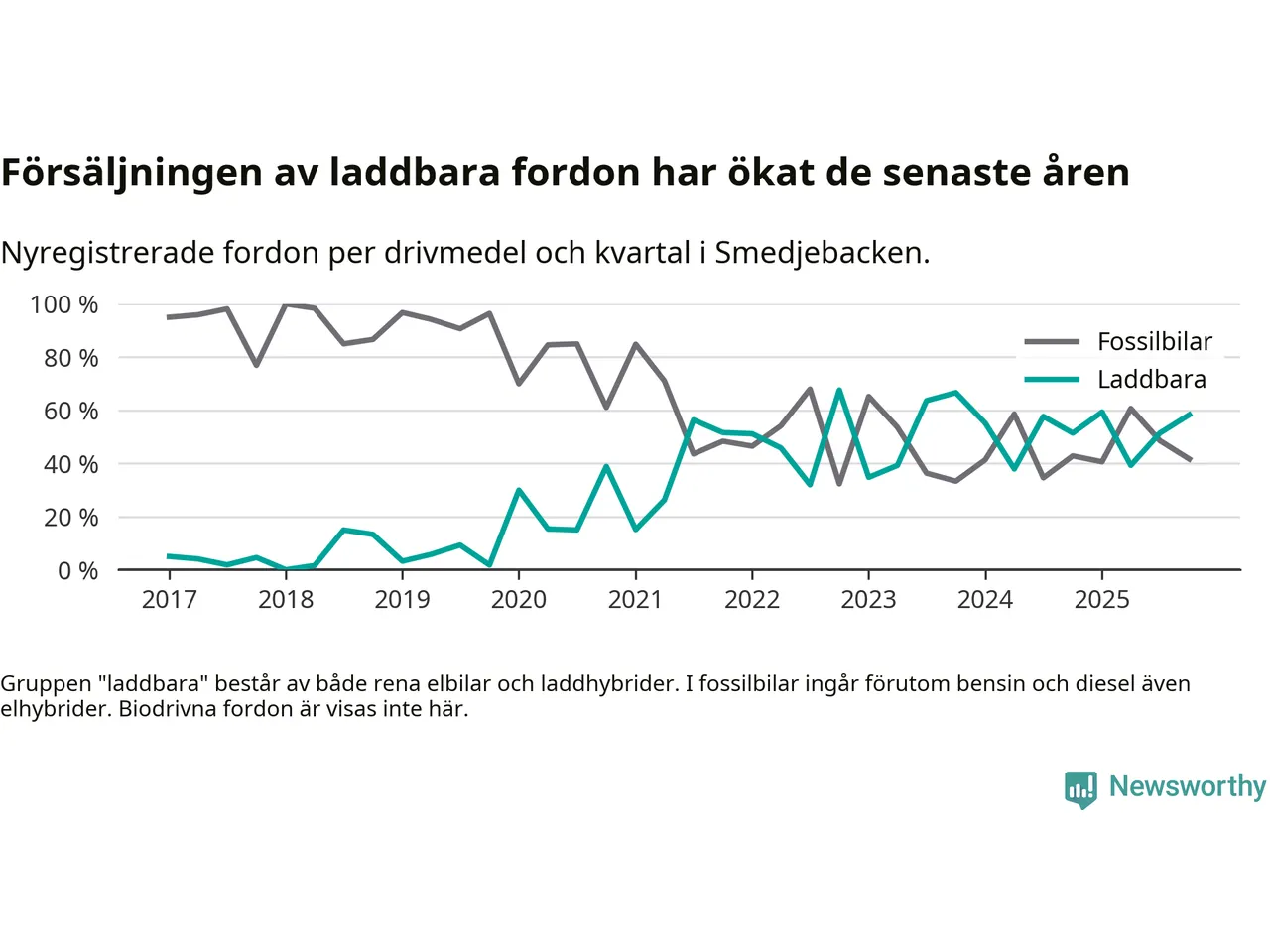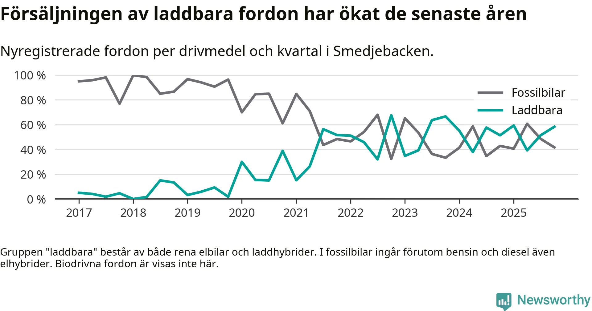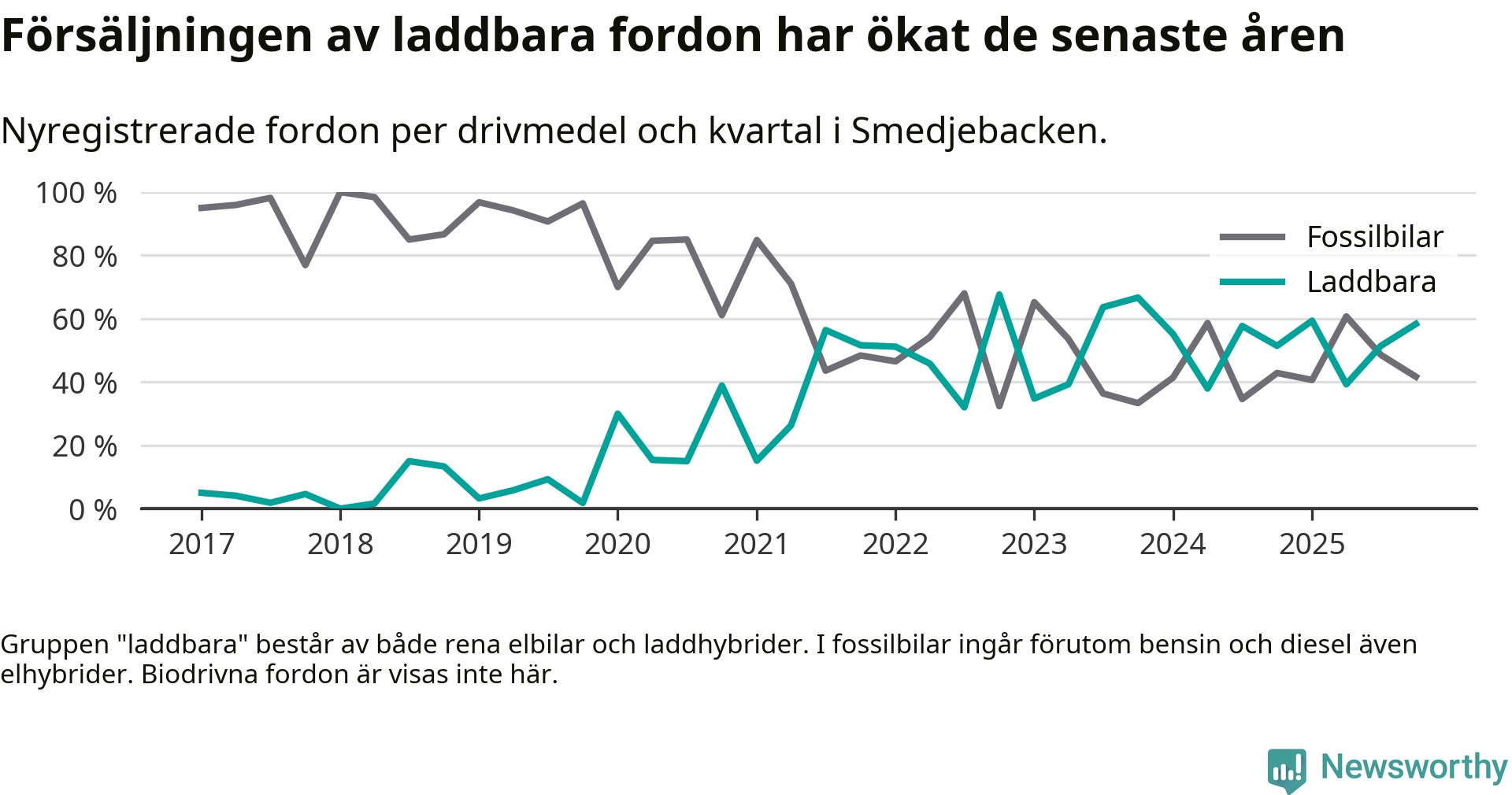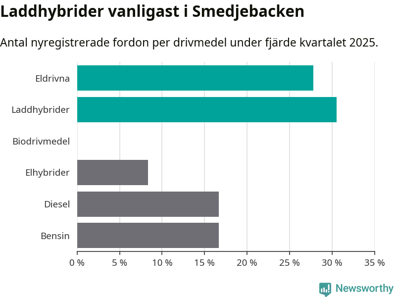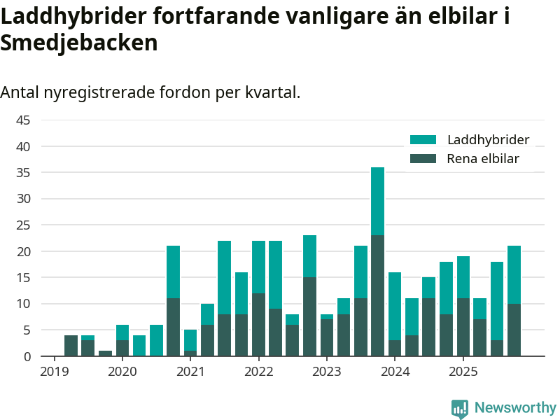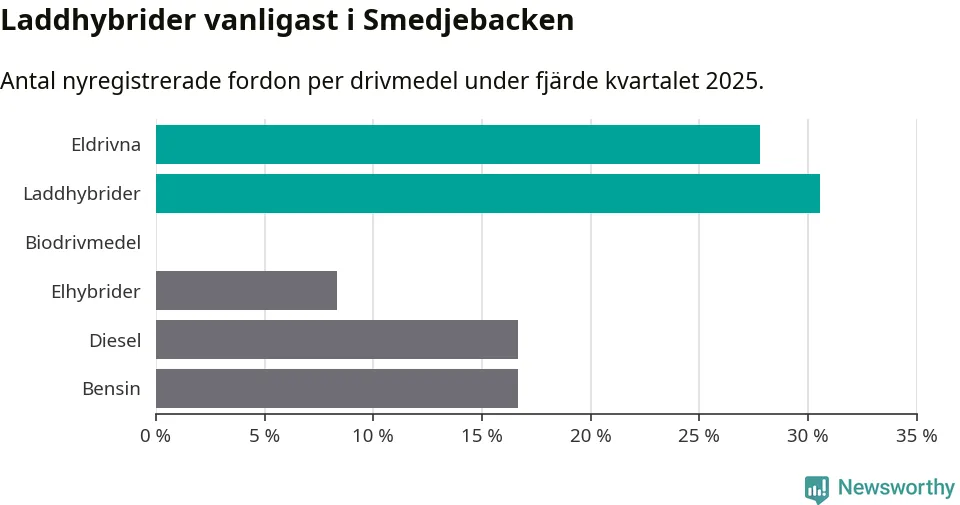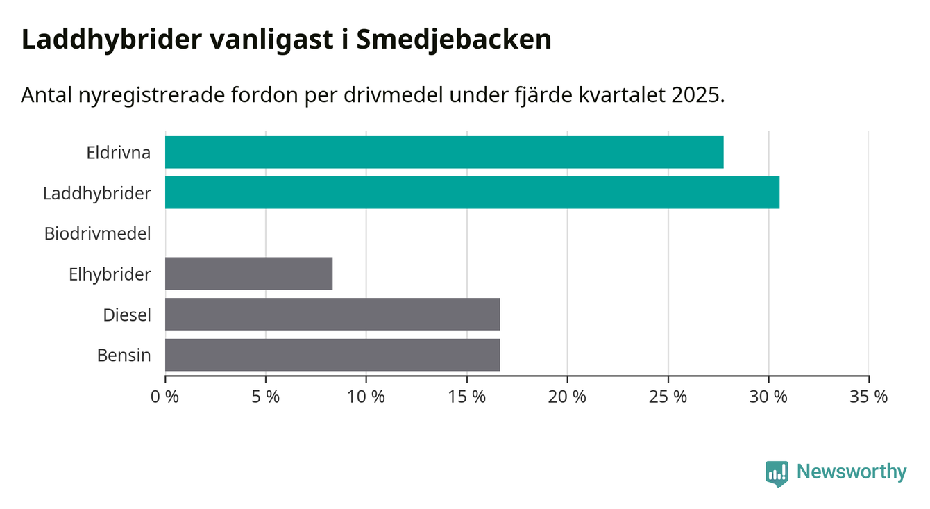 Under fjärde kvartalet 2025 var 58 procent av alla nyregistrerade personbilar i Smedjebacken laddbara (sammanlagt registrerades 36 nya bilar). Merparten av de laddbara bilarna var så kallade laddhybrider, det vill säga fordon som går att ladda och köra på el, men som även har en förbränningsmotor. 28 procent av alla nya bilar var rena elbilar.