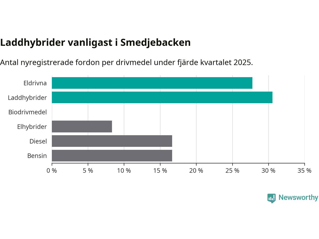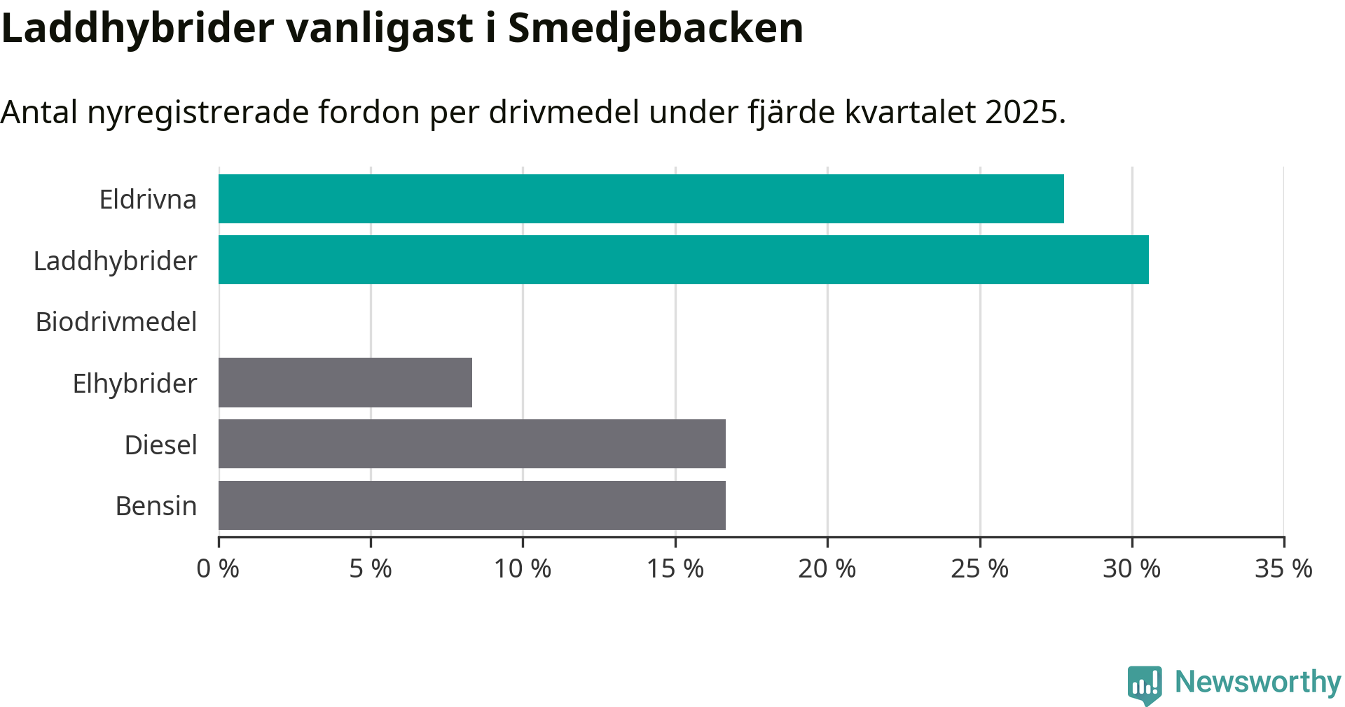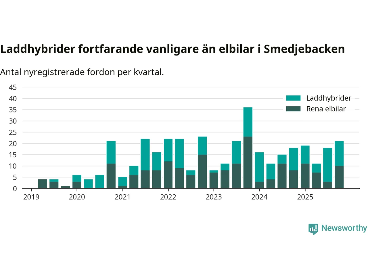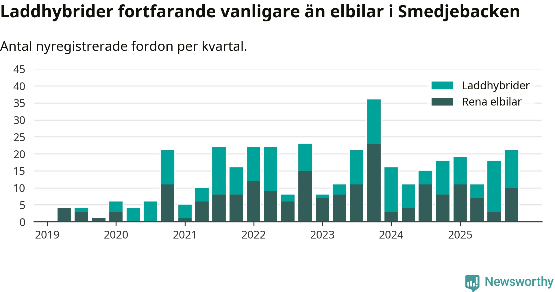 Under fjärde kvartalet 2025 var 58 procent av alla nyregistrerade personbilar i Smedjebacken laddbara (sammanlagt registrerades 36 nya bilar). Merparten av de laddbara bilarna var så kallade laddhybrider, det vill säga fordon som går att ladda och köra på el, men som även har en förbränningsmotor. 28 procent av alla nya bilar var rena elbilar.