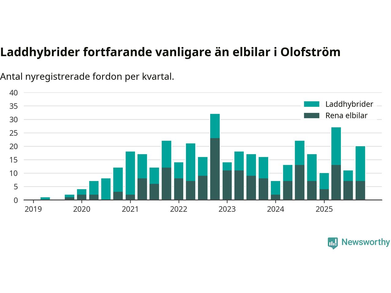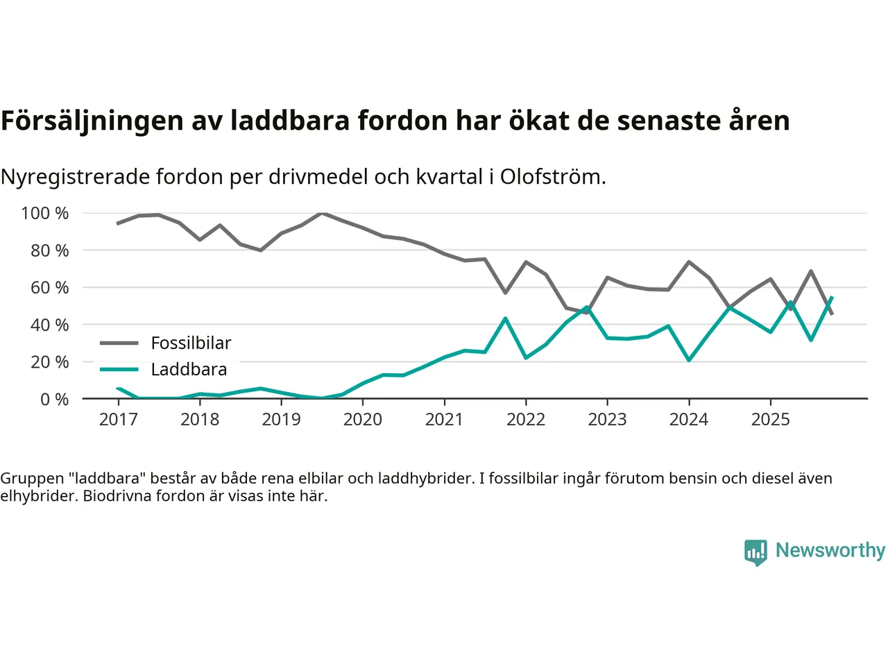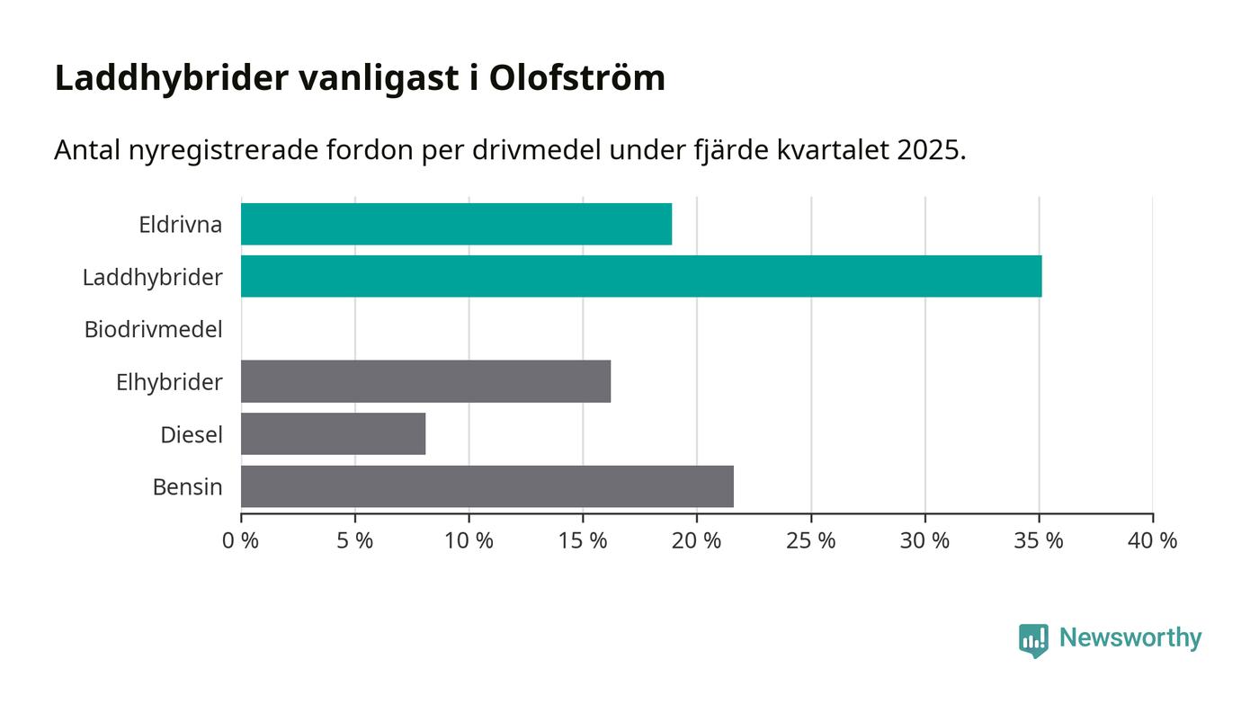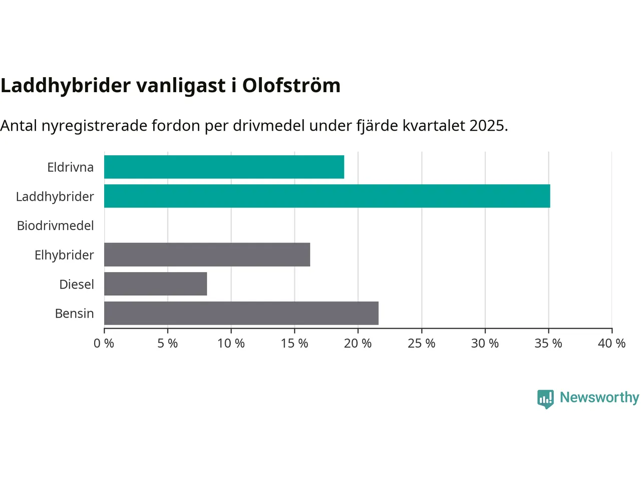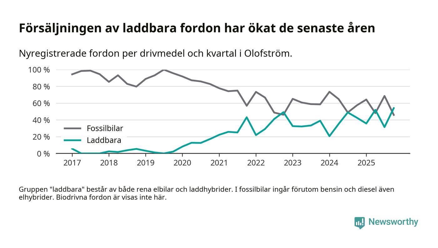 Under fjärde kvartalet 2025 var 54 procent av alla nyregistrerade personbilar i Olofström laddbara (sammanlagt registrerades 37 nya bilar). Merparten av de laddbara bilarna var så kallade laddhybrider, det vill säga fordon som går att ladda och köra på el, men som även har en förbränningsmotor. 19 procent av alla nya bilar var rena elbilar.