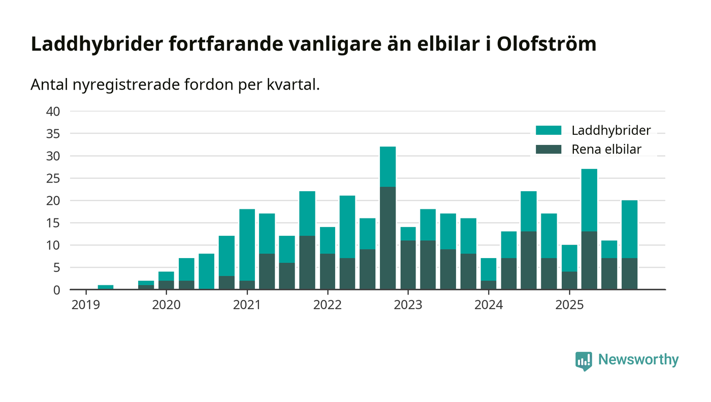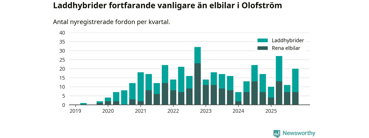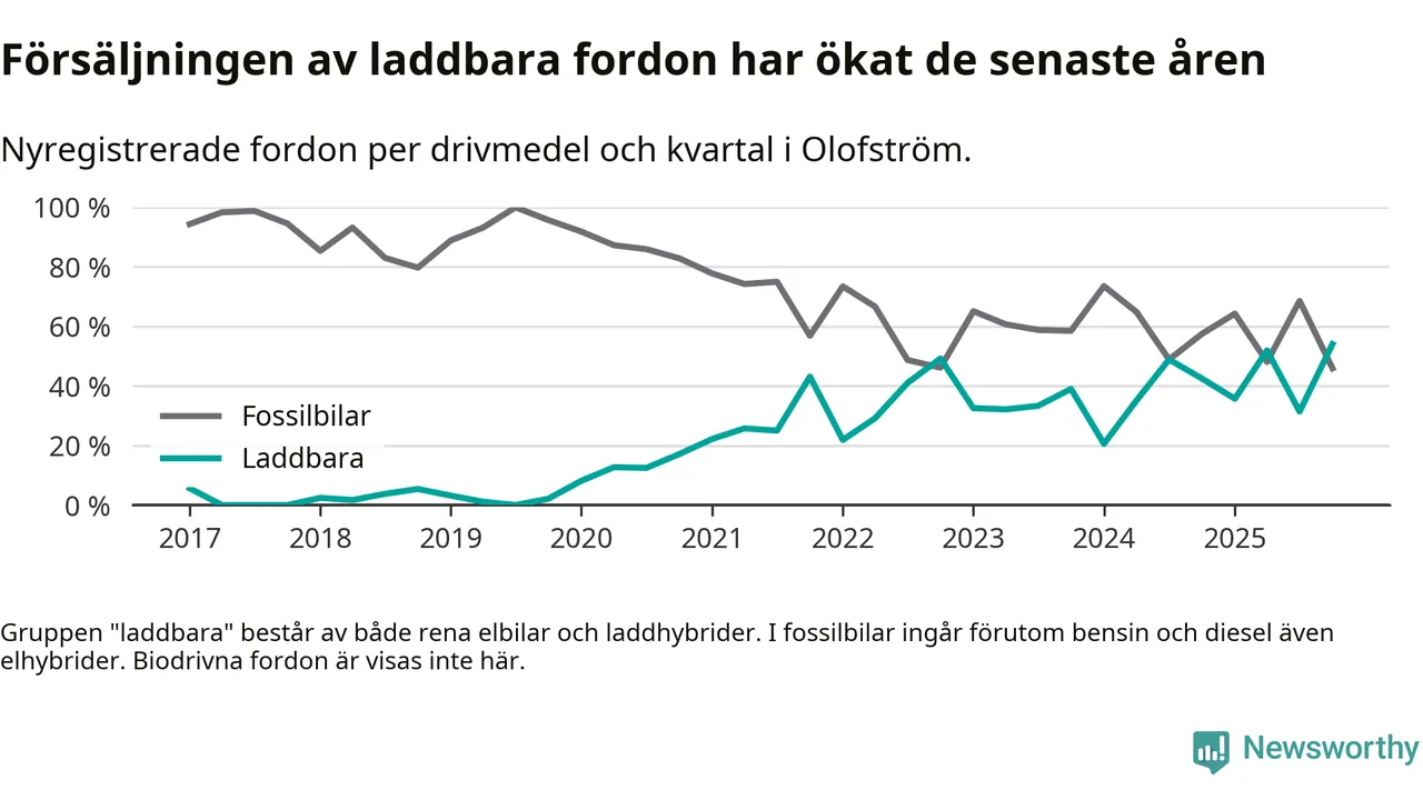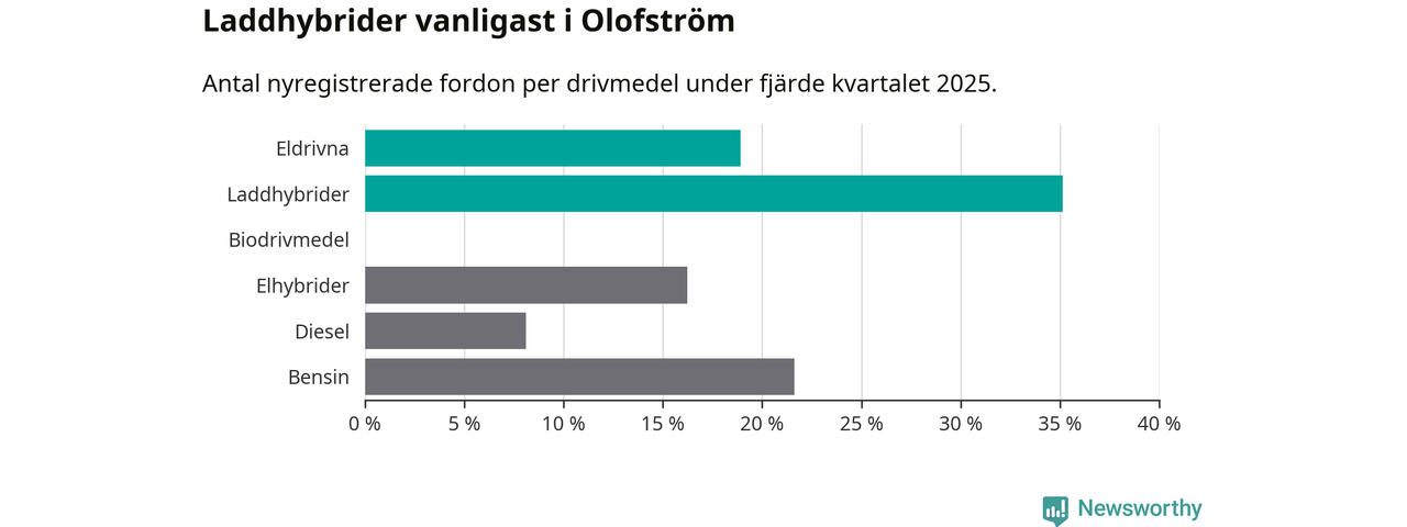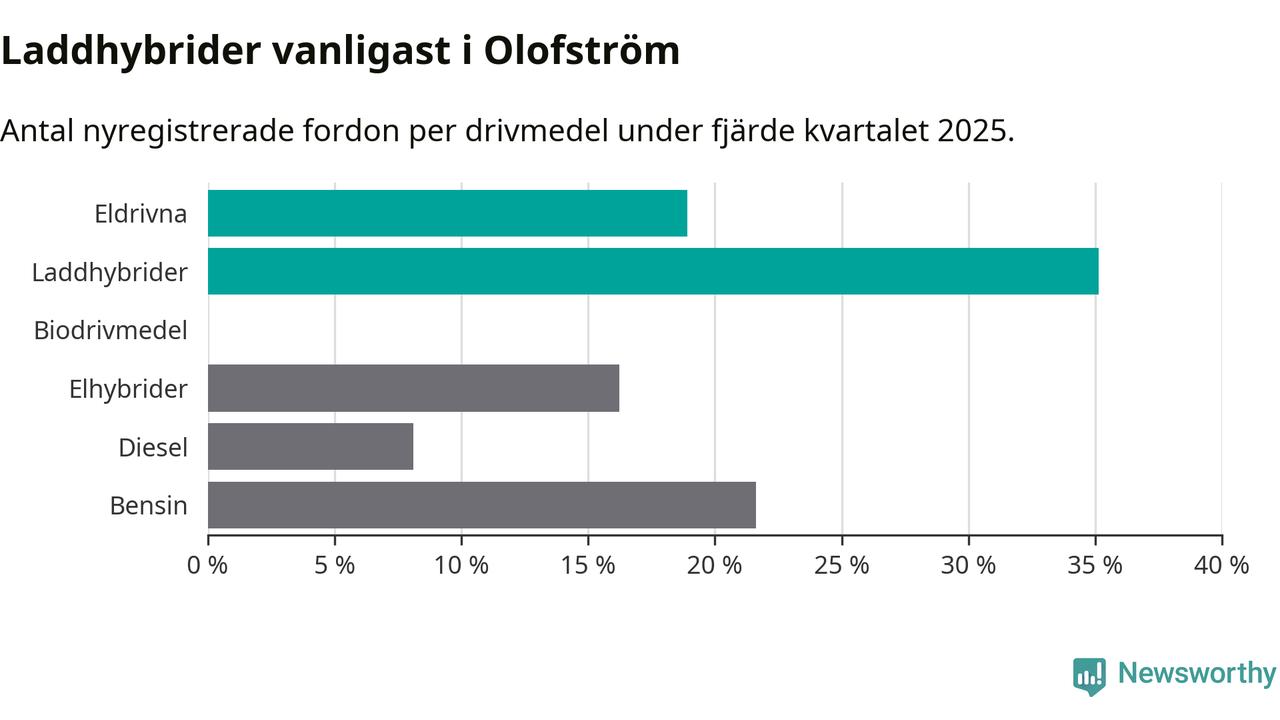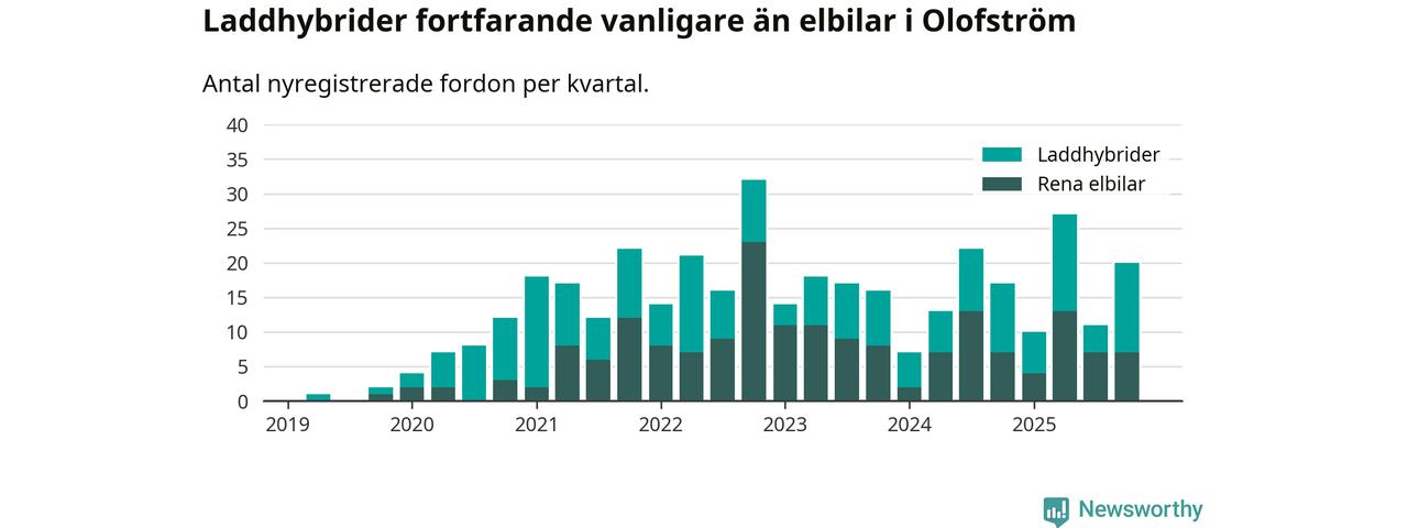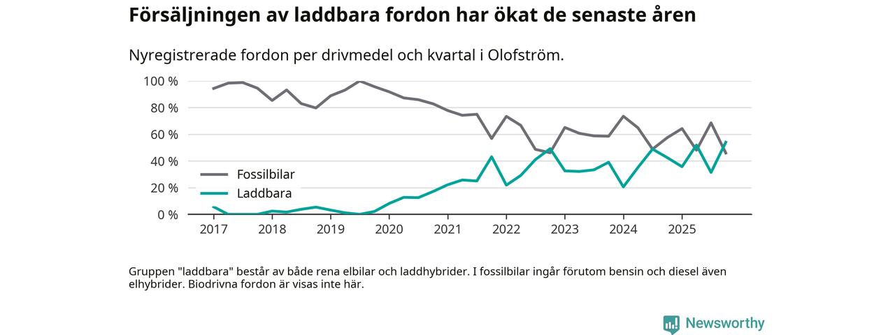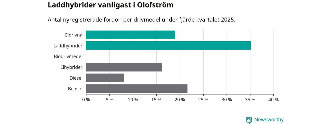 Under fjärde kvartalet 2025 var 54 procent av alla nyregistrerade personbilar i Olofström laddbara (sammanlagt registrerades 37 nya bilar). Merparten av de laddbara bilarna var så kallade laddhybrider, det vill säga fordon som går att ladda och köra på el, men som även har en förbränningsmotor. 19 procent av alla nya bilar var rena elbilar.
