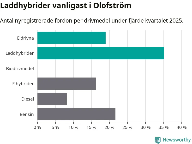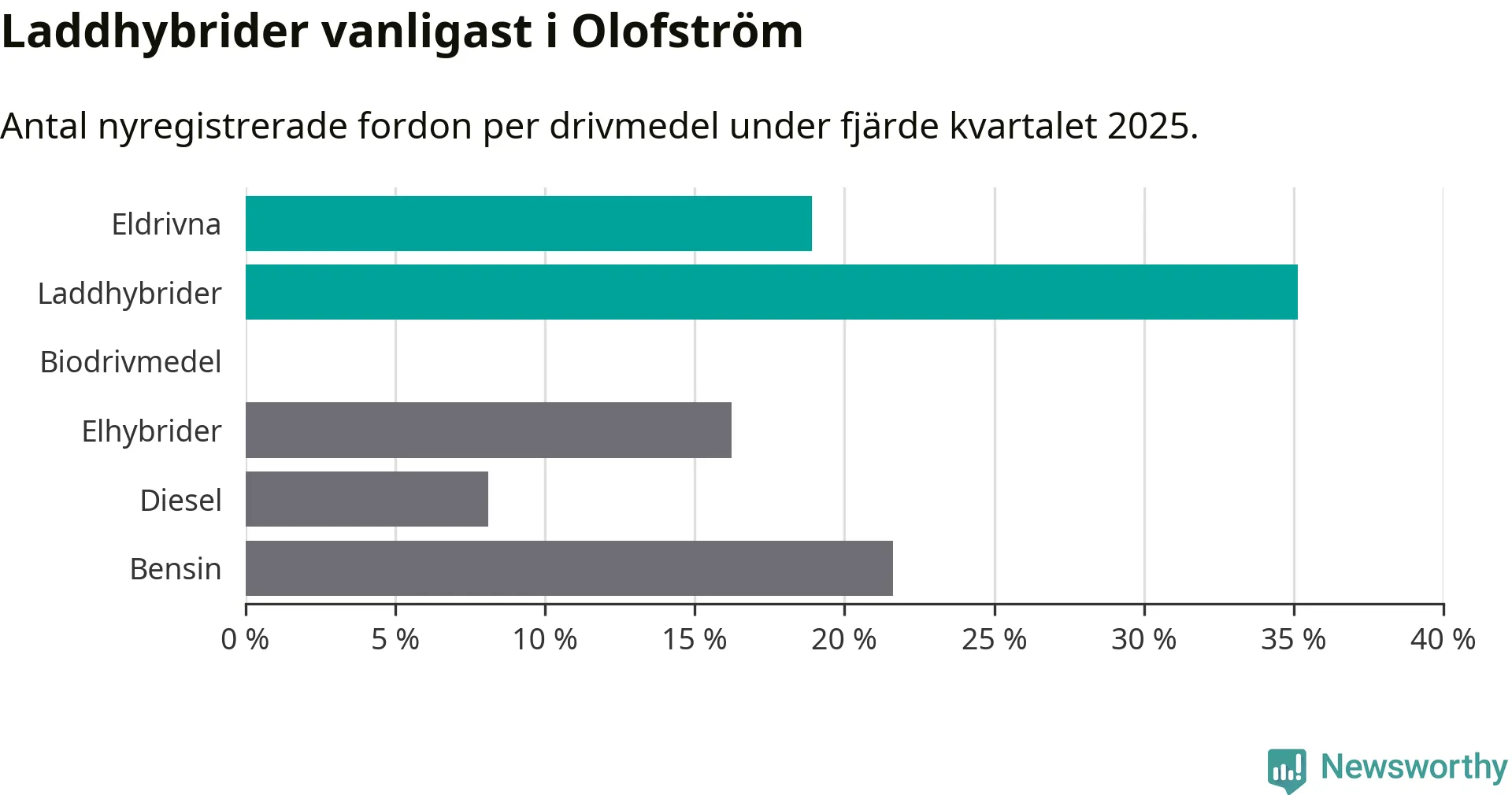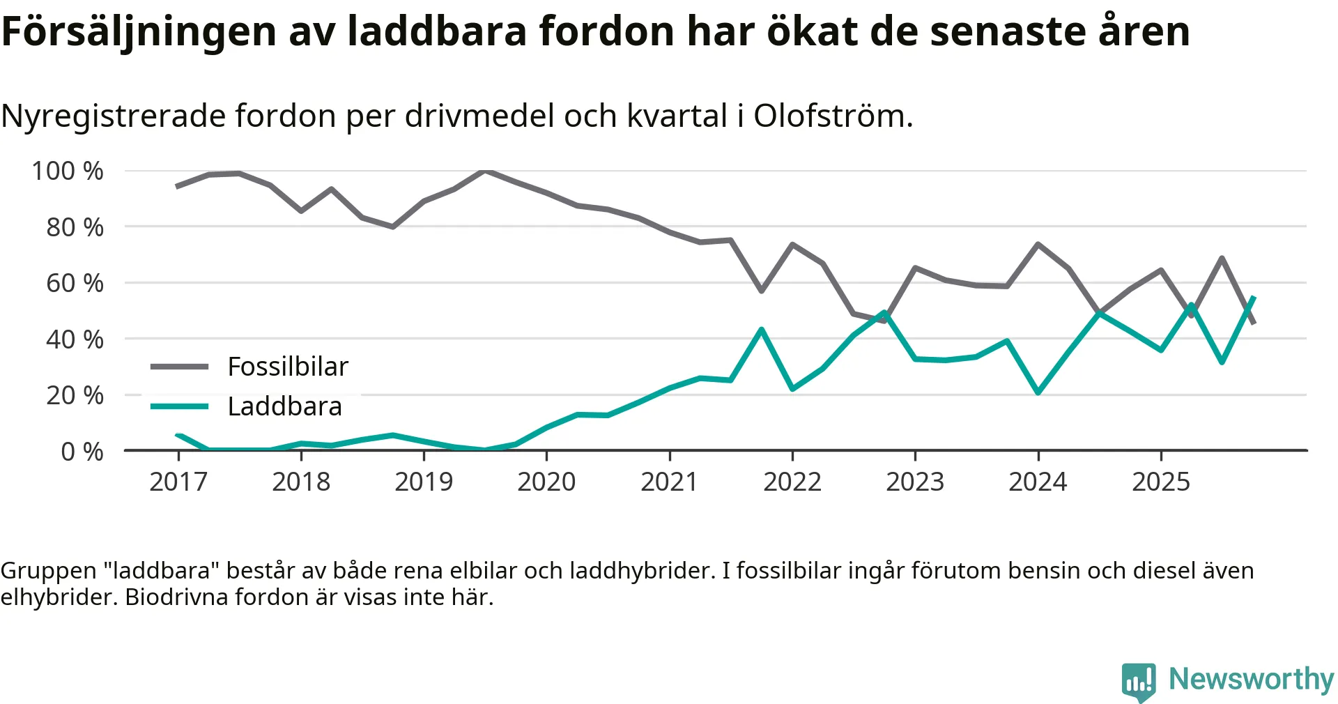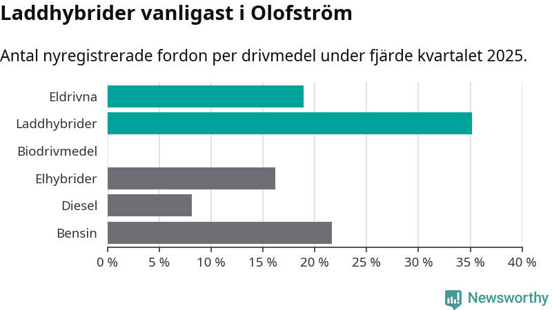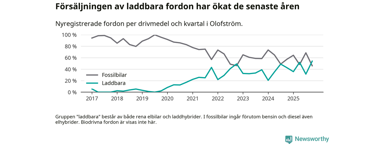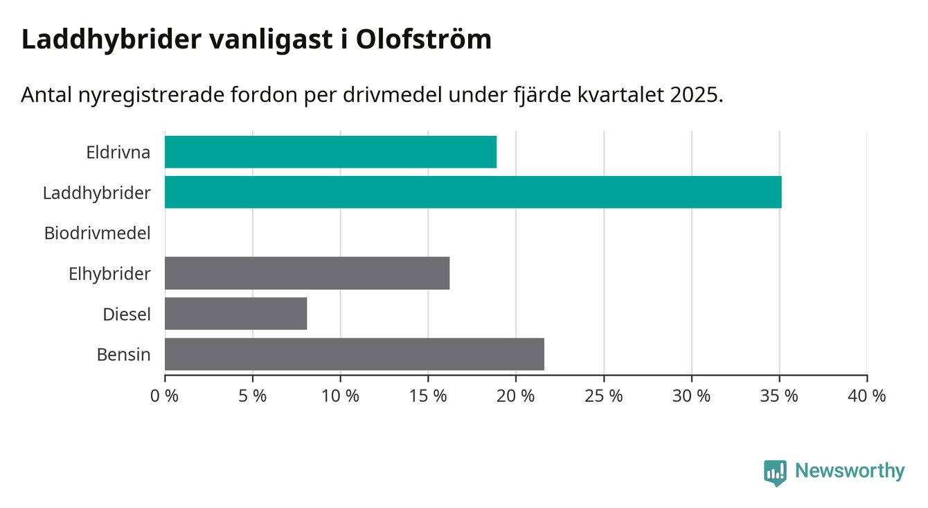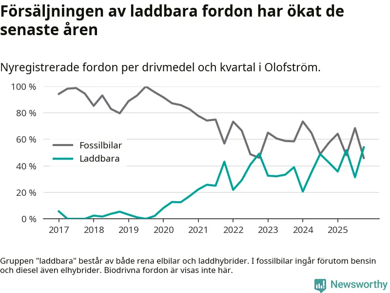 Under fjärde kvartalet 2025 var 54 procent av alla nyregistrerade personbilar i Olofström laddbara (sammanlagt registrerades 37 nya bilar). Merparten av de laddbara bilarna var så kallade laddhybrider, det vill säga fordon som går att ladda och köra på el, men som även har en förbränningsmotor. 19 procent av alla nya bilar var rena elbilar.