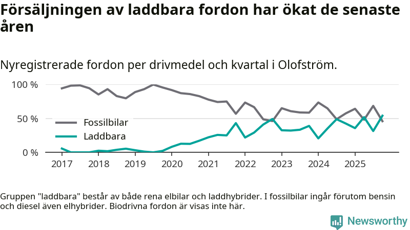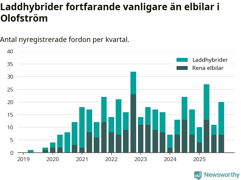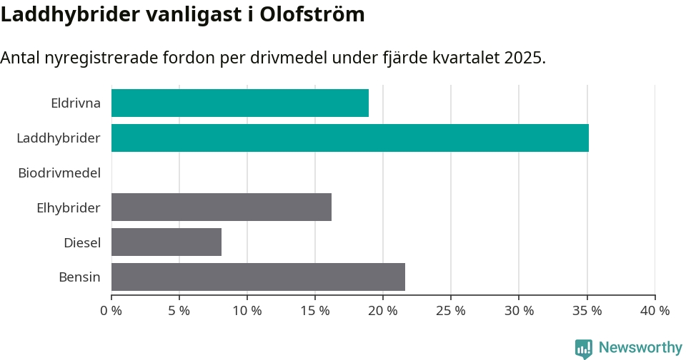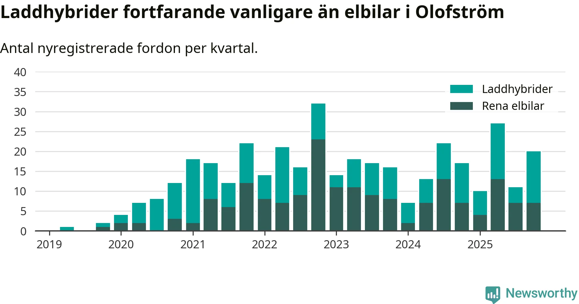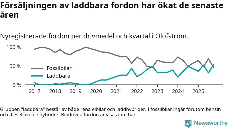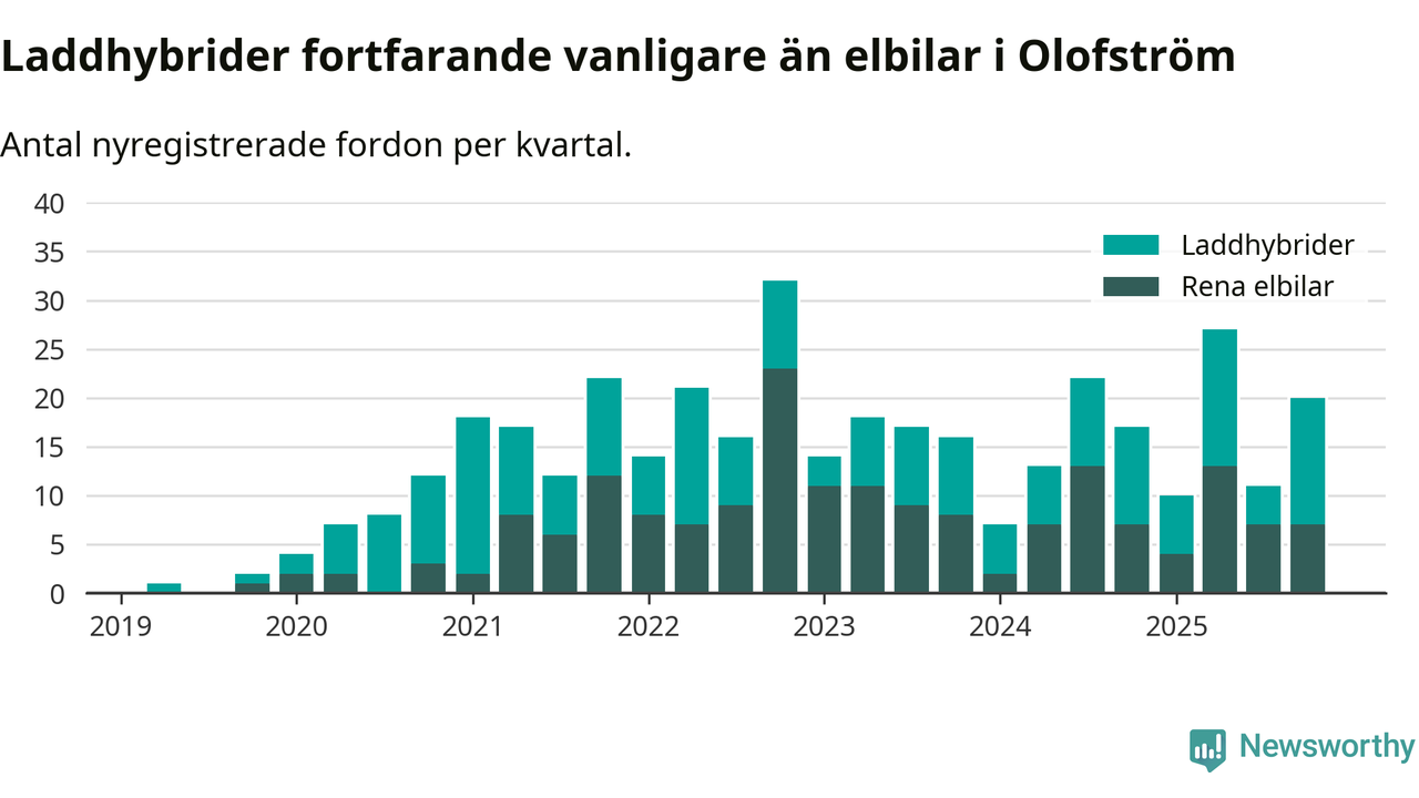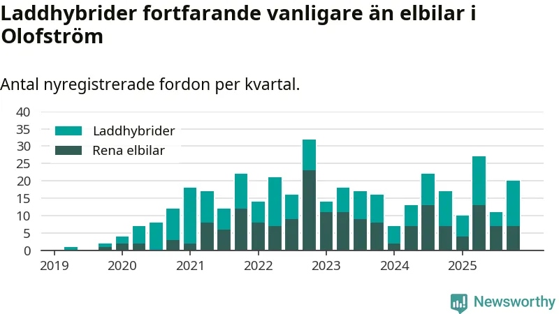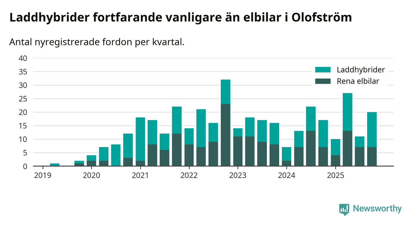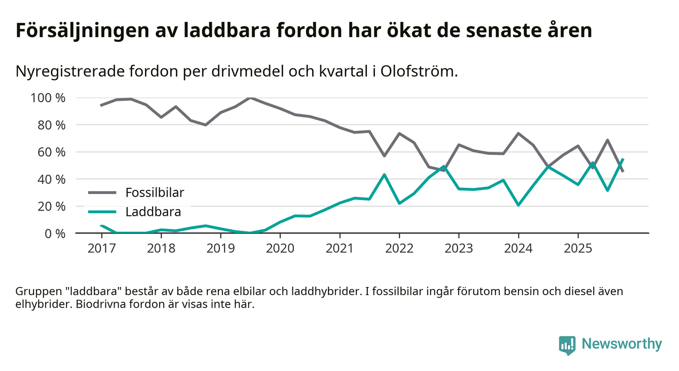Under fjärde kvartalet 2025 var 54 procent av alla nyregistrerade personbilar i Olofström laddbara (sammanlagt registrerades 37 nya bilar). Merparten av de laddbara bilarna var så kallade laddhybrider, det vill säga fordon som går att ladda och köra på el, men som även har en förbränningsmotor. 19 procent av alla nya bilar var rena elbilar.