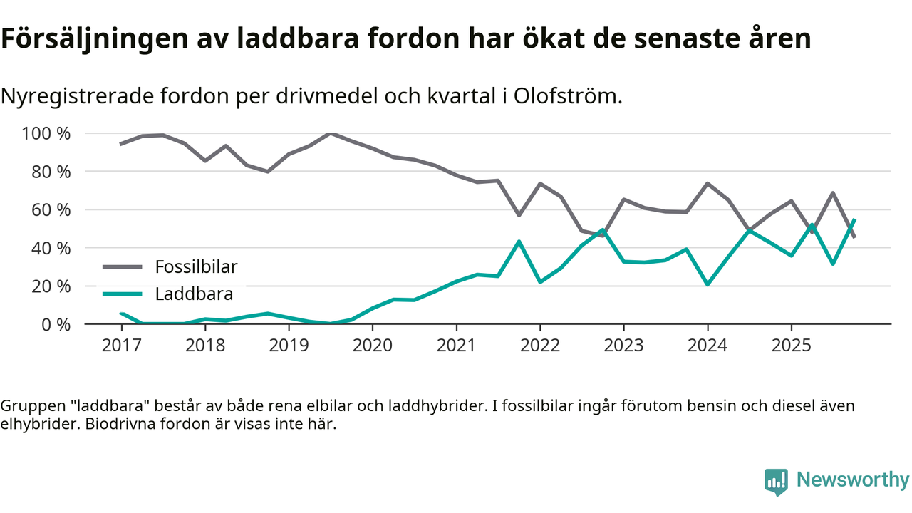 I landet som helhet var 63 procent av alla nyregistrerade personbilar laddbara år 2025. Det är en ökning jämfört med året innan, men samtidigt betydligt färre än de prognoser som gjordes för några år sedan.