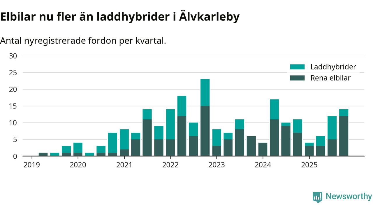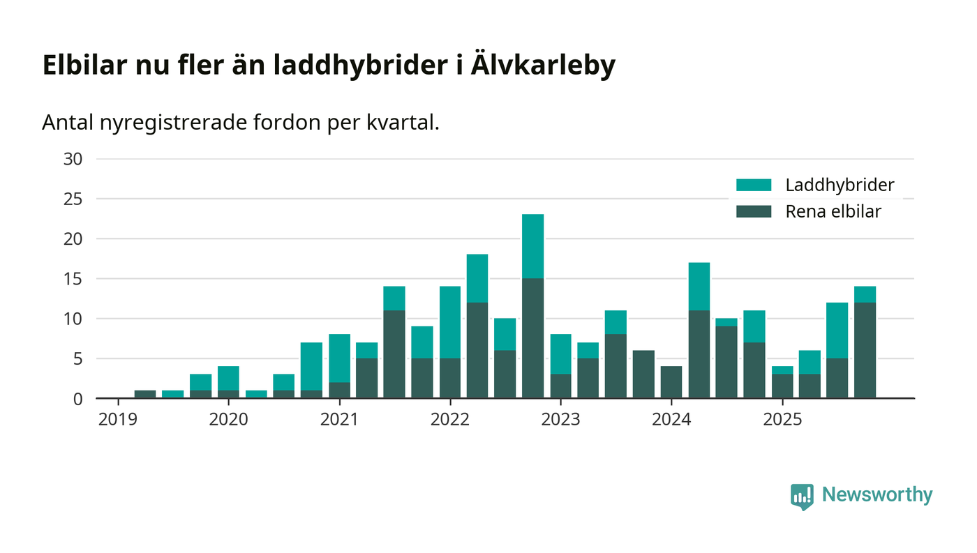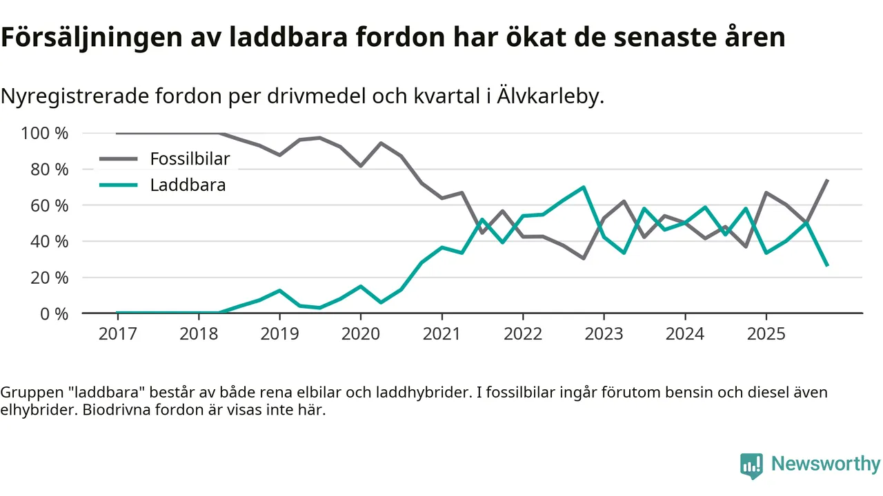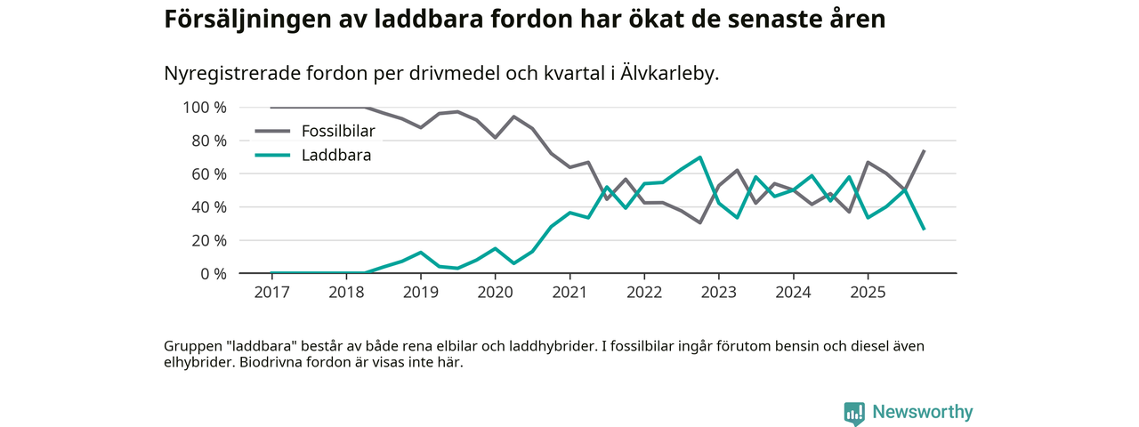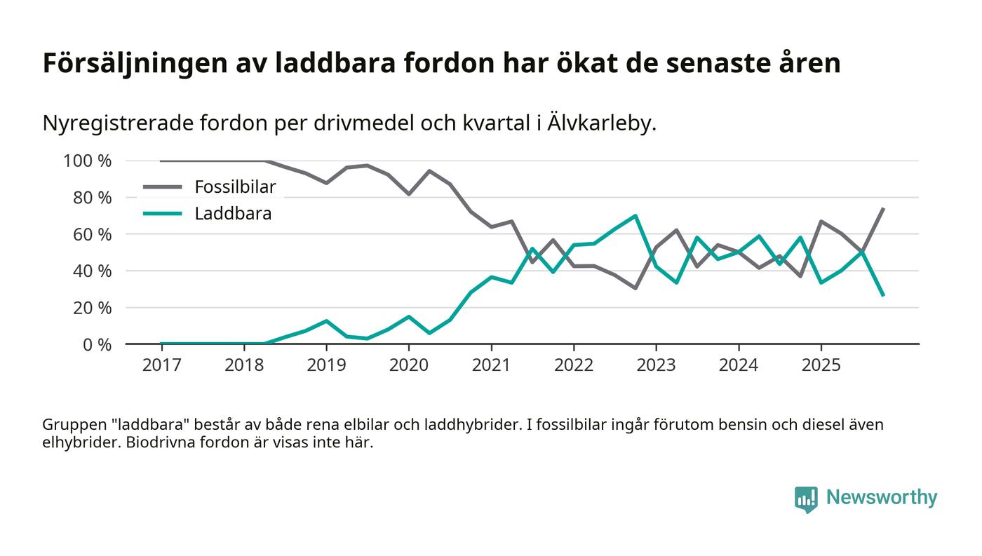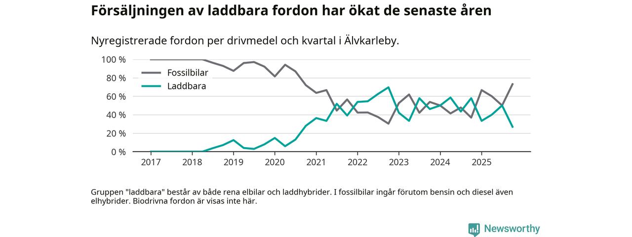 Under fjärde kvartalet 2025 var 27 procent av alla nyregistrerade personbilar i Älvkarleby laddbara (sammanlagt registrerades 52 nya bilar). Merparten av de laddbara bilarna var rena elbilar (23 procent av alla).
