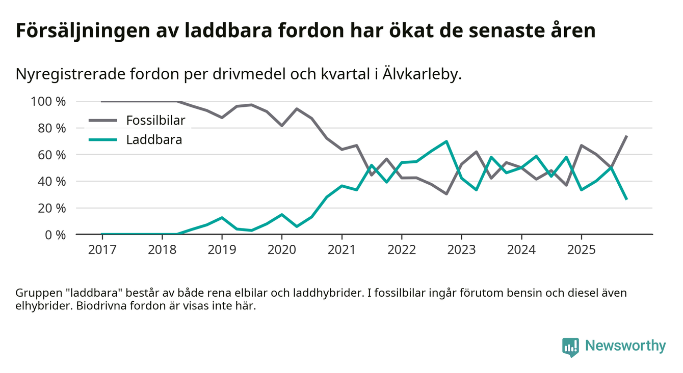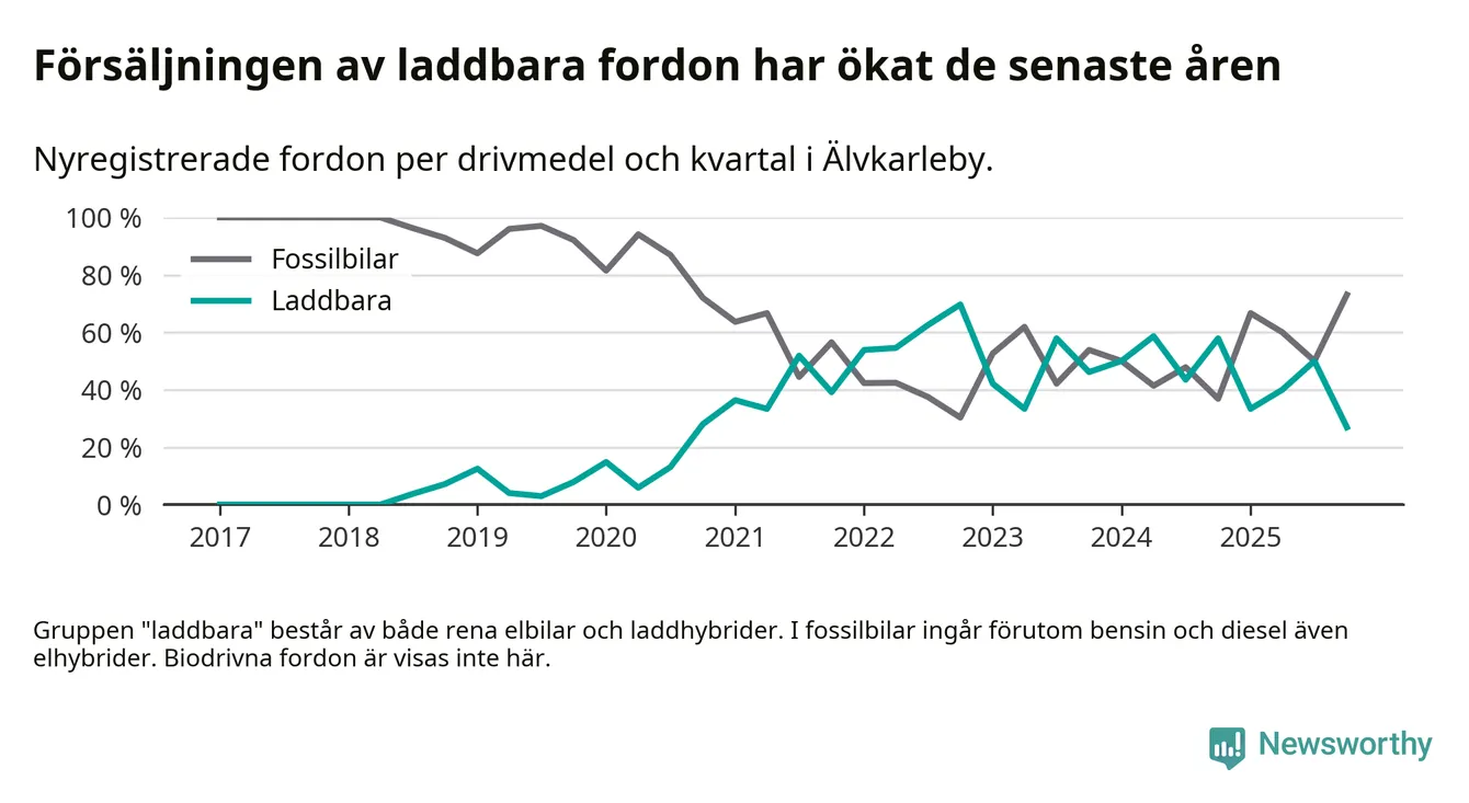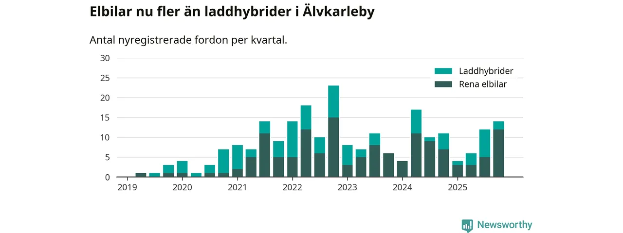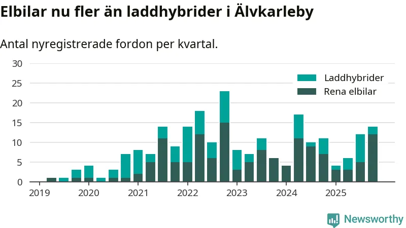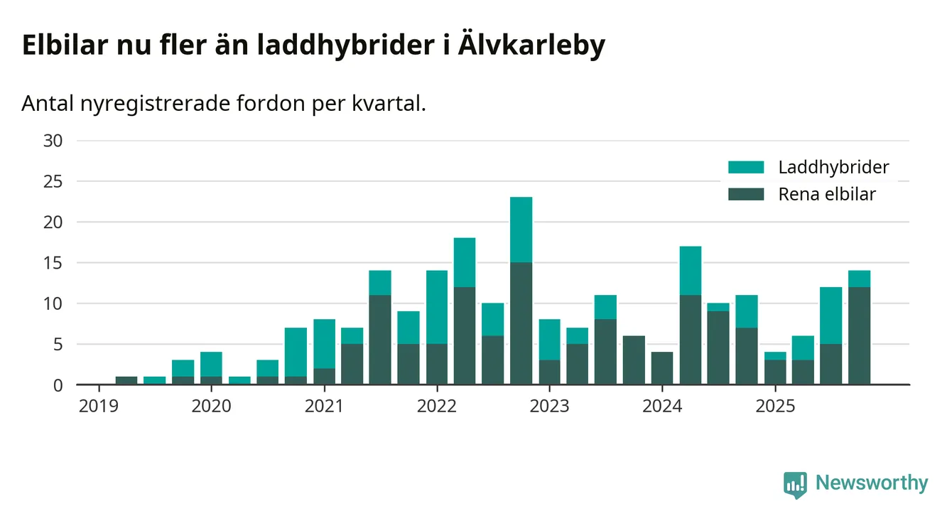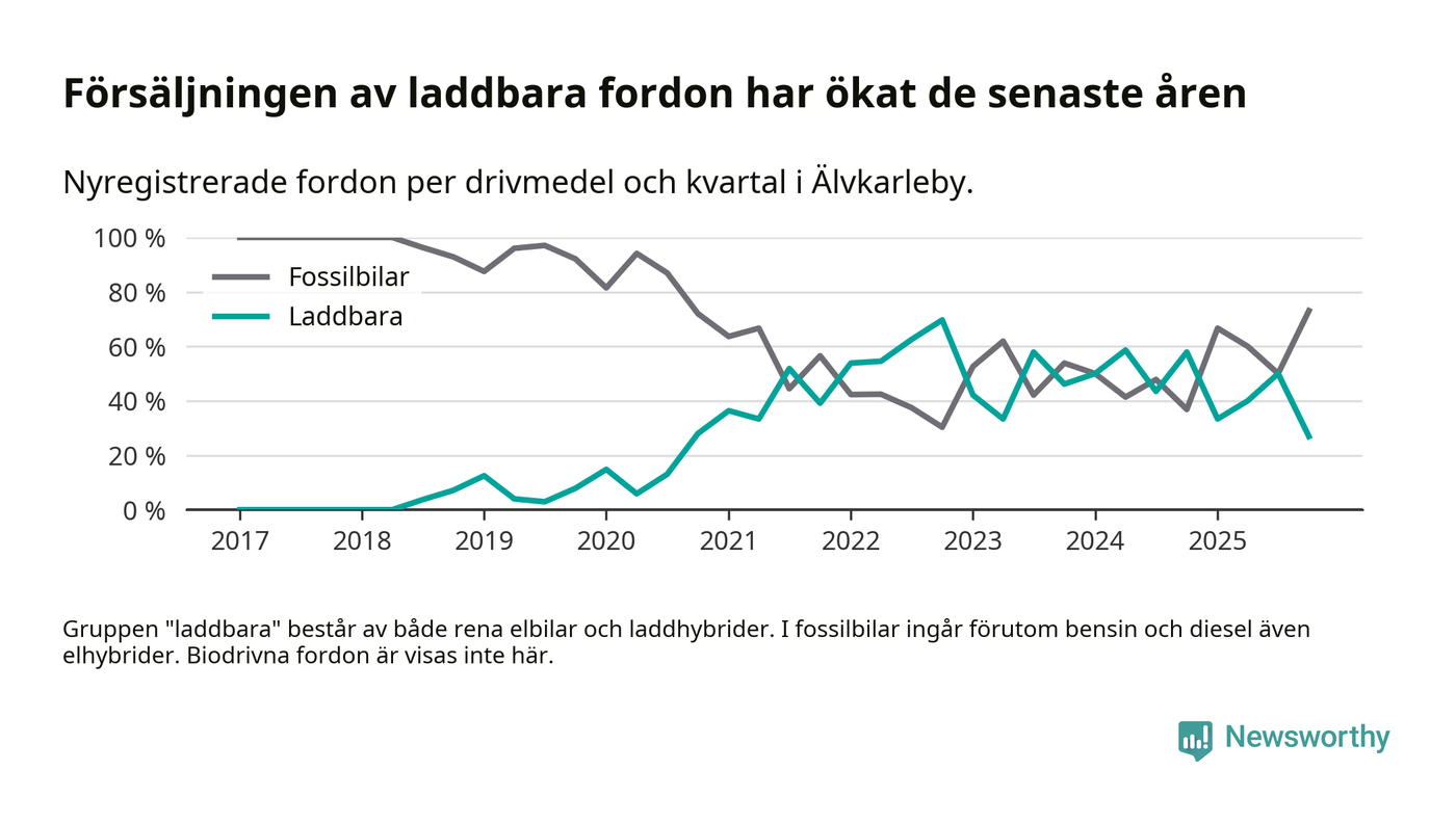 Under fjärde kvartalet 2025 var 27 procent av alla nyregistrerade personbilar i Älvkarleby laddbara (sammanlagt registrerades 52 nya bilar). Merparten av de laddbara bilarna var rena elbilar (23 procent av alla).